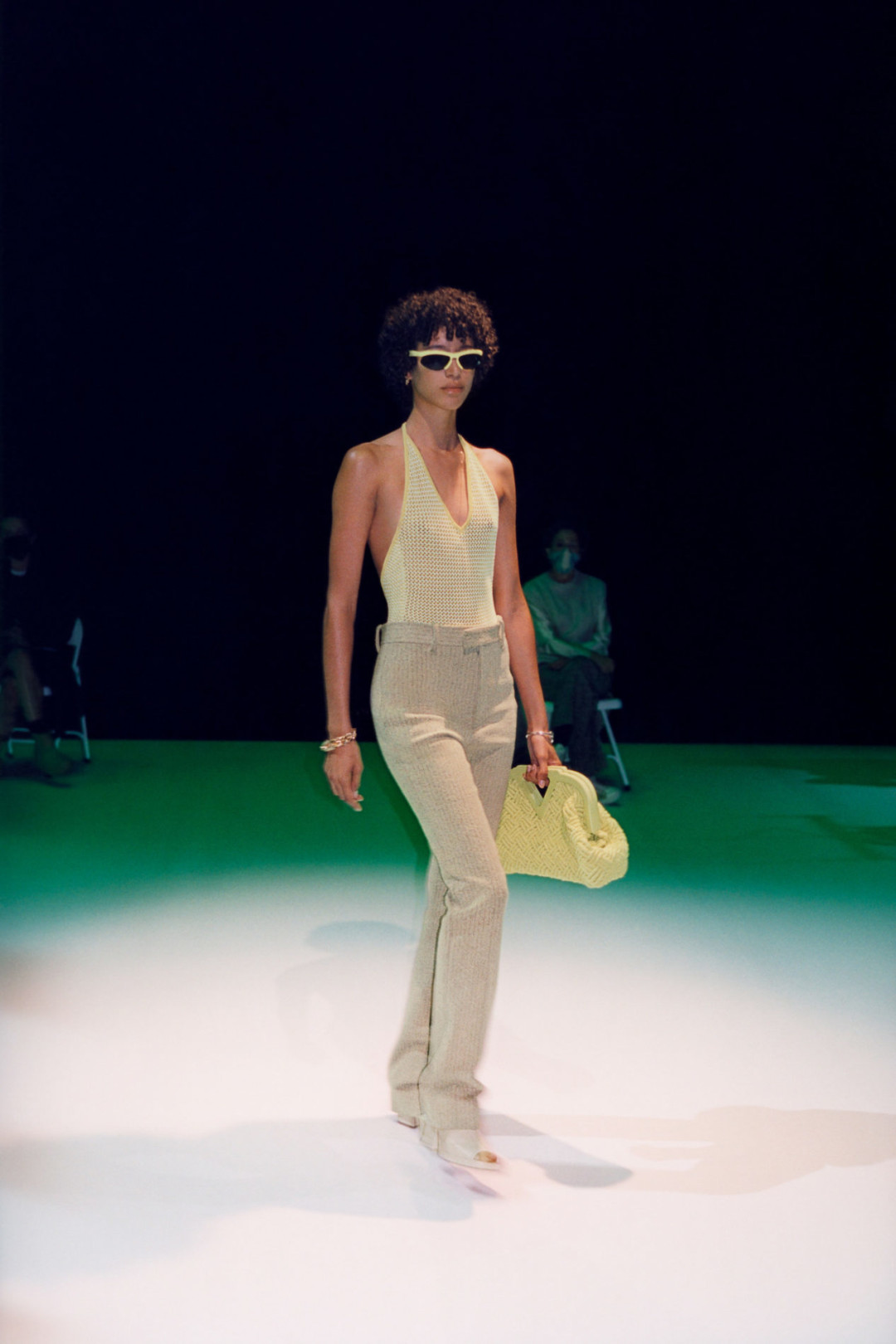 В весенне-летнюю коллекцию Bottega Veneta вошли платья, сарафаны, брючные костюмы, блузы и новые цветные сумки-«пельмени». Многие образы полностью состояли из вязаных вещей и были дополнены вязаными аксессуарами. Кроме засилия трикотажа, в коллекции есть и вещи, украшенные люрексом. Главная обувь грядущего теплого сезона по версии креативного директора бренда Дэниела Ли — сабо.