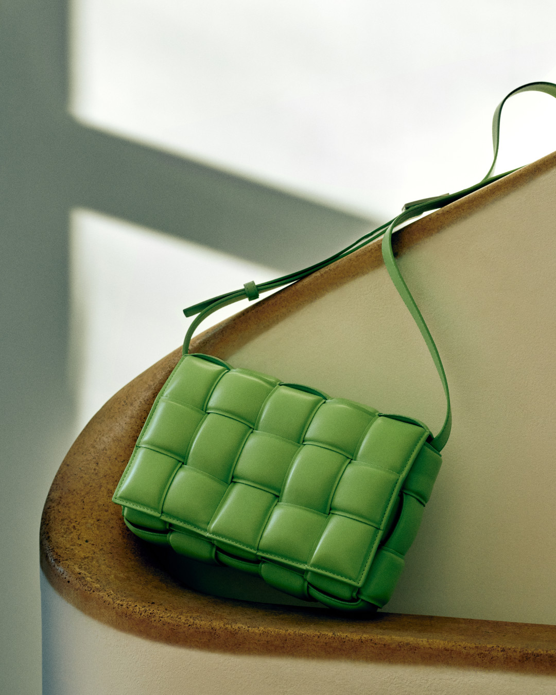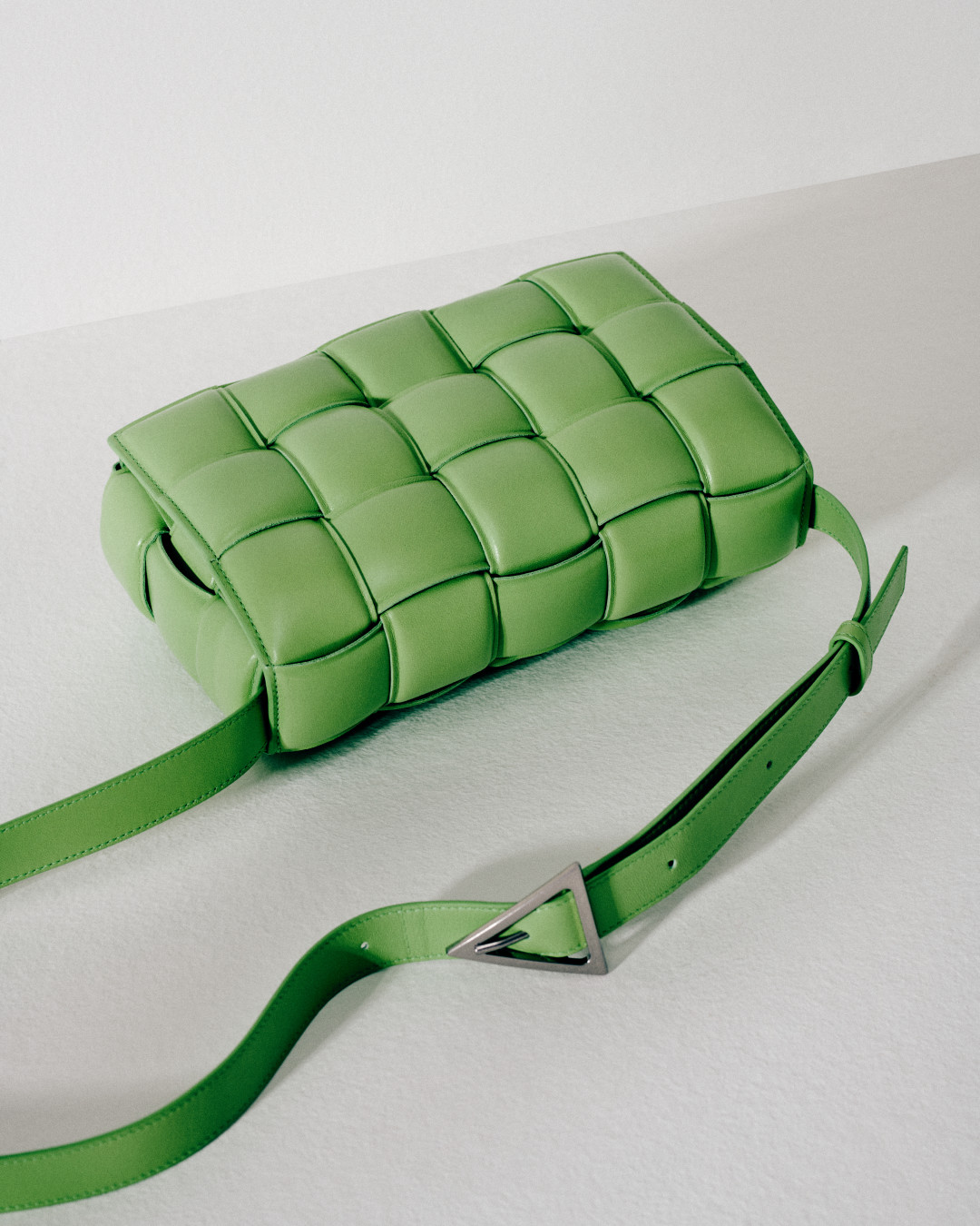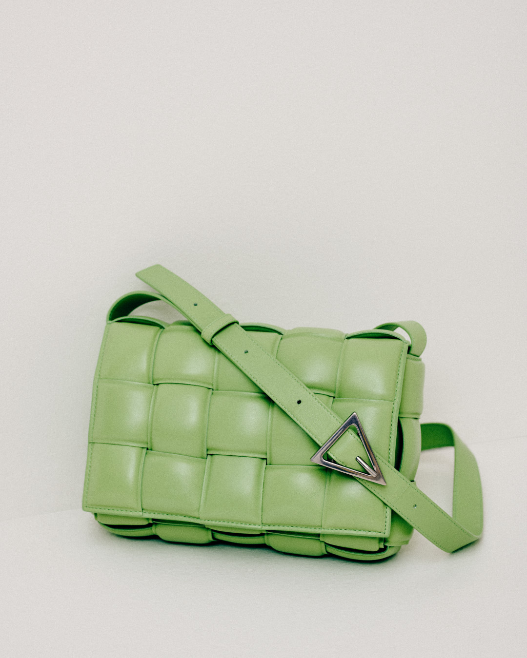 Бренд представил новый вариант своей знаковой модели The Padded Cassette — творения креативного директора Bottega Veneta Дэниела Ли. Сумка из мягкой стеганой кожи с треугольной металлической фурнитурой на длинном ремне специально для России выполнена в фисташковом цвете. К слову, одном из главных оттенков новой коллекции бренда (наравне с лавандовым).