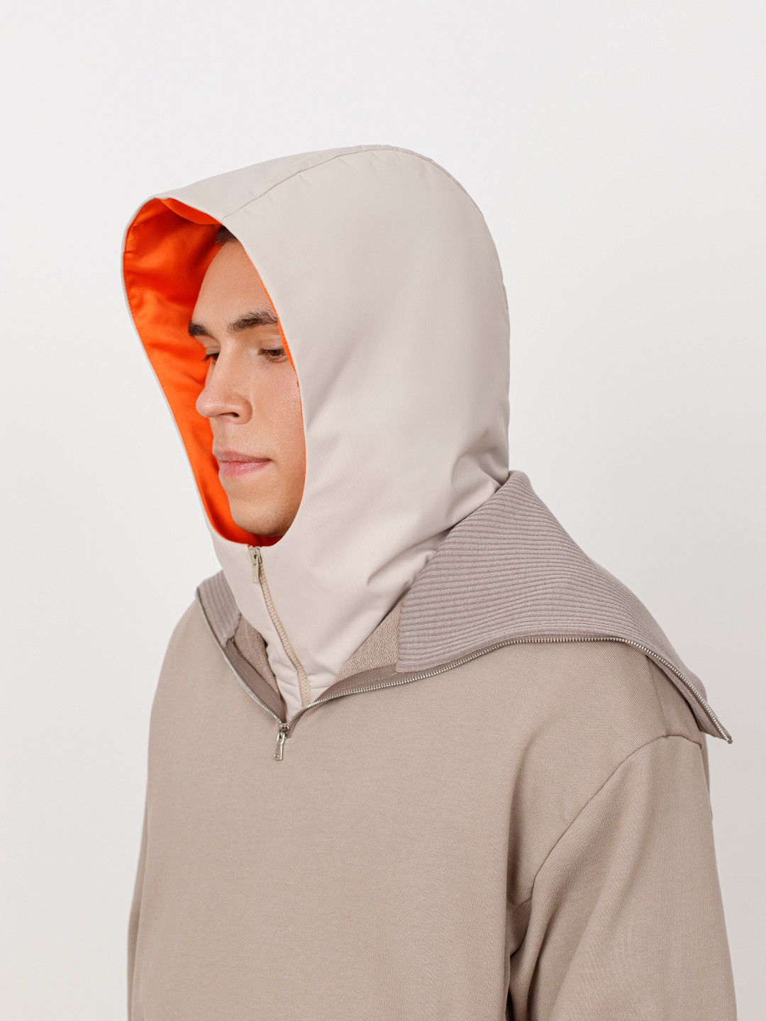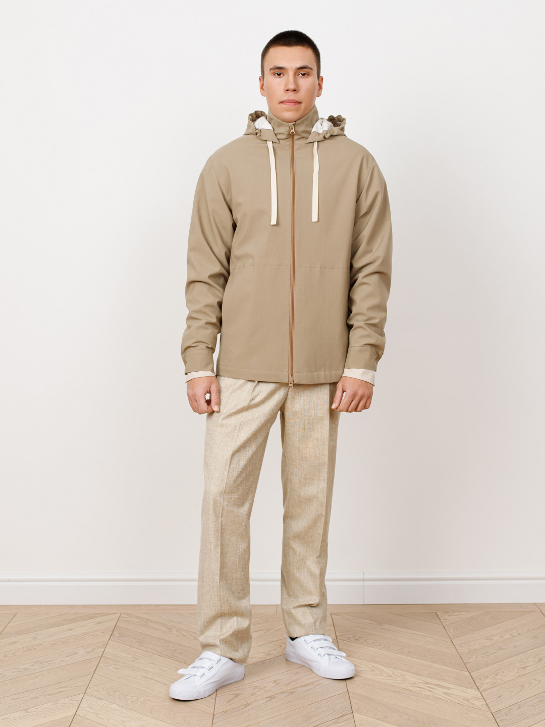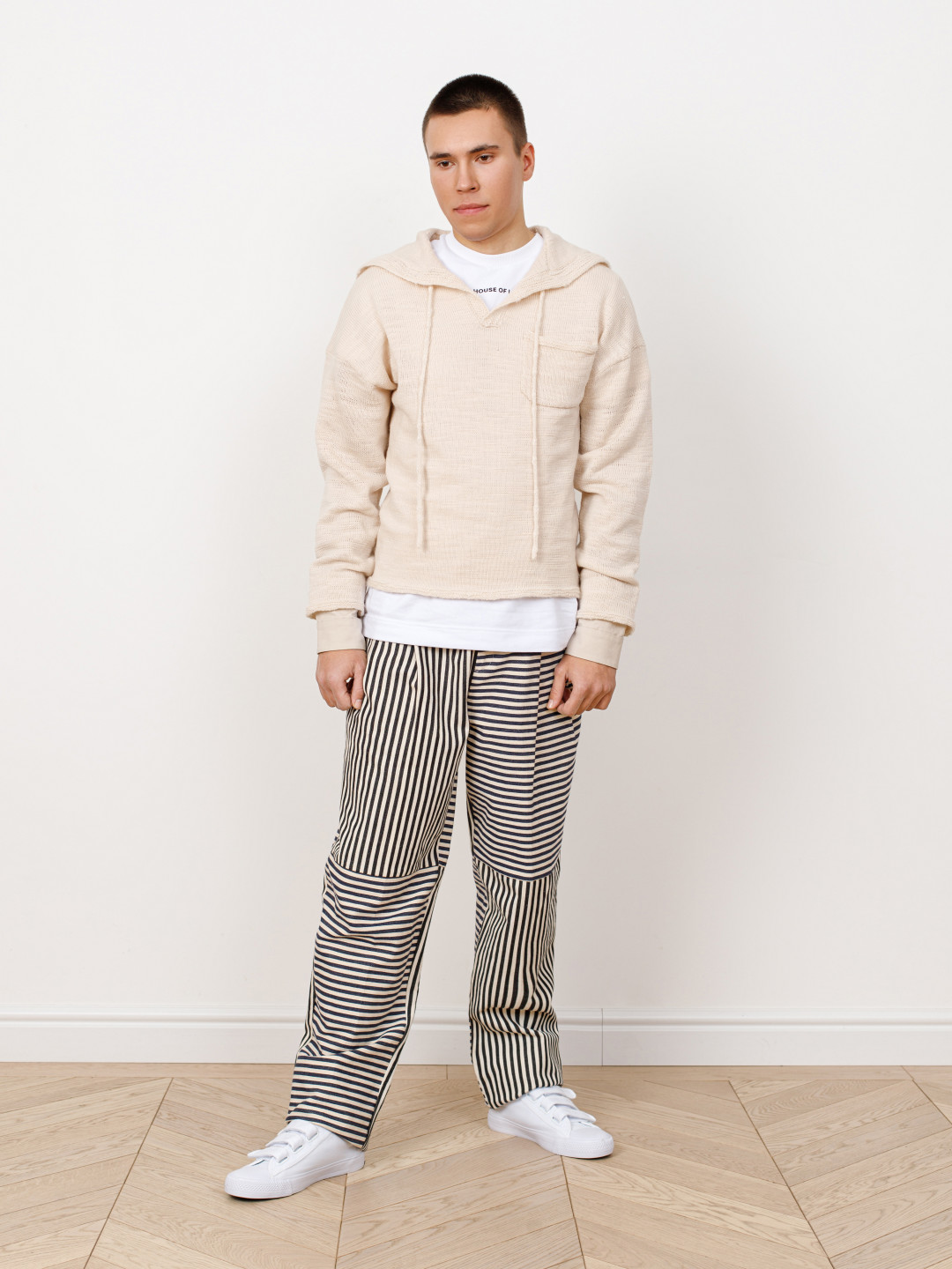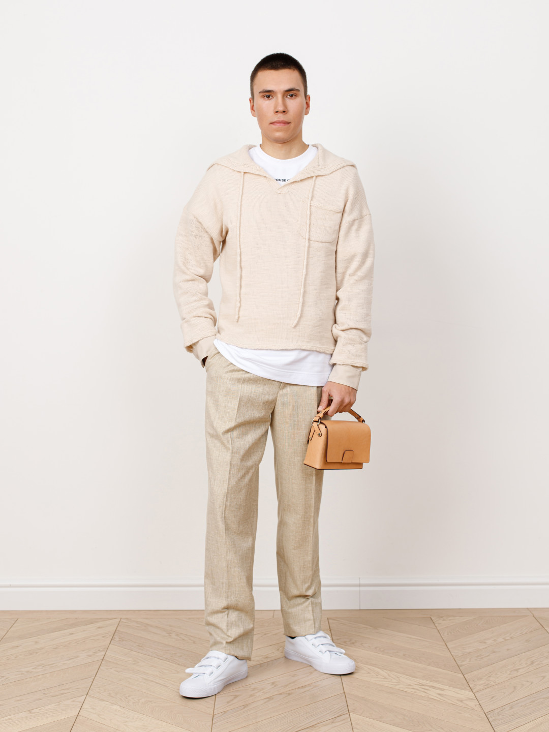 Универсальная коллекция соединила в себе визуальные коды, функциональность униформы и классического мужского костюма. В капсулу вошли свитеры, приталенный пиджак с монограммой House of Leo, расклешенные брюки, шорты, парка, футболки, свитеры с объемным воротником на замке, ветровка, съемный капюшон, а также свободные брюки в морскую полоску, переосмысленную Леонидом Алексеевым. Цветовая палитра капсулы столь же универсальна, сколько и ее наполнение — бежевый, черный, кофейный. В качестве яркого вкрапления — оранжевая подкладка съемного капюшона.