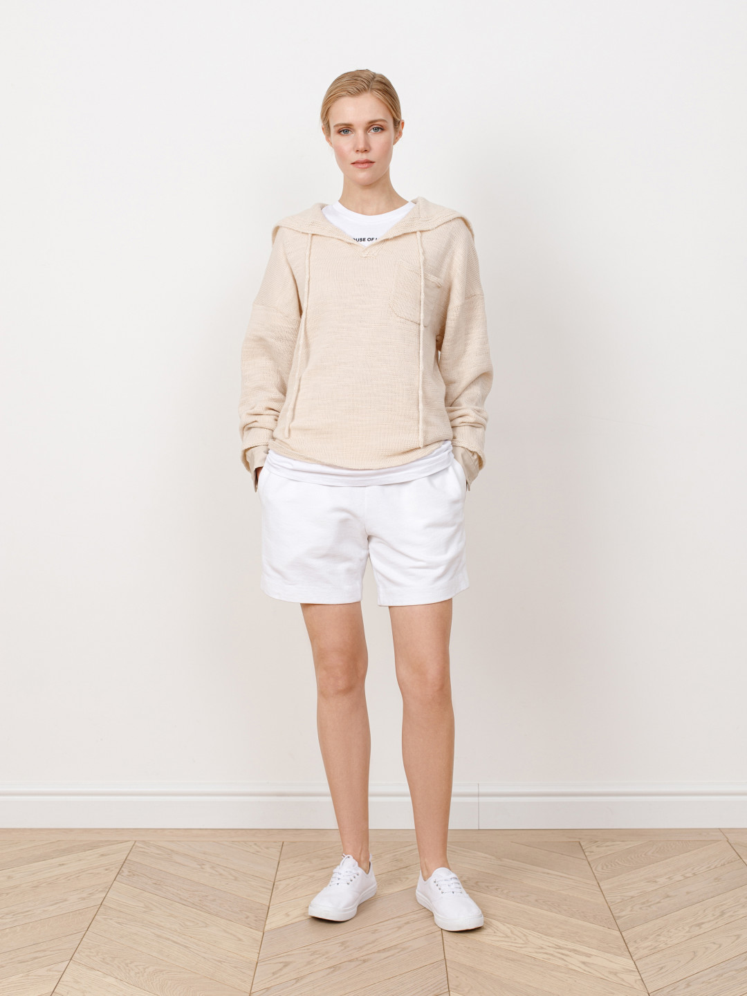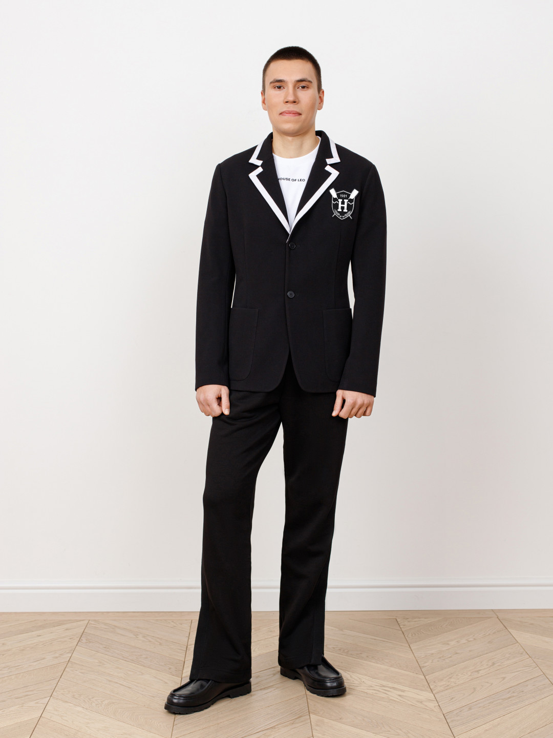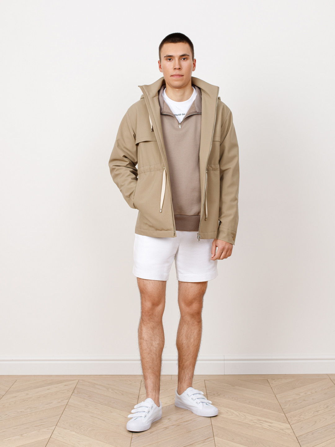Универсальная коллекция соединила в себе визуальные коды, функциональность униформы и классического мужского костюма. В капсулу вошли свитеры, приталенный пиджак с монограммой House of Leo, расклешенные брюки, шорты, парка, футболки, свитеры с объемным воротником на замке, ветровка, съемный капюшон, а также свободные брюки в морскую полоску, переосмысленную Леонидом Алексеевым. Цветовая палитра капсулы столь же универсальна, сколько и ее наполнение — бежевый, черный, кофейный. В качестве яркого вкрапления — оранжевая подкладка съемного капюшона.