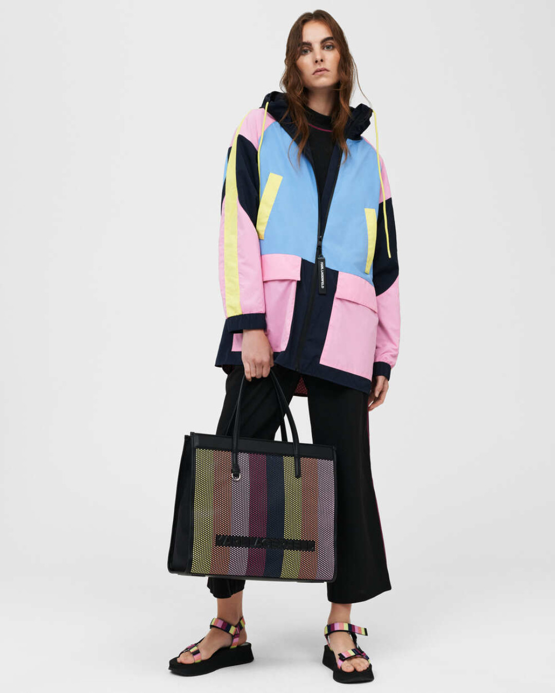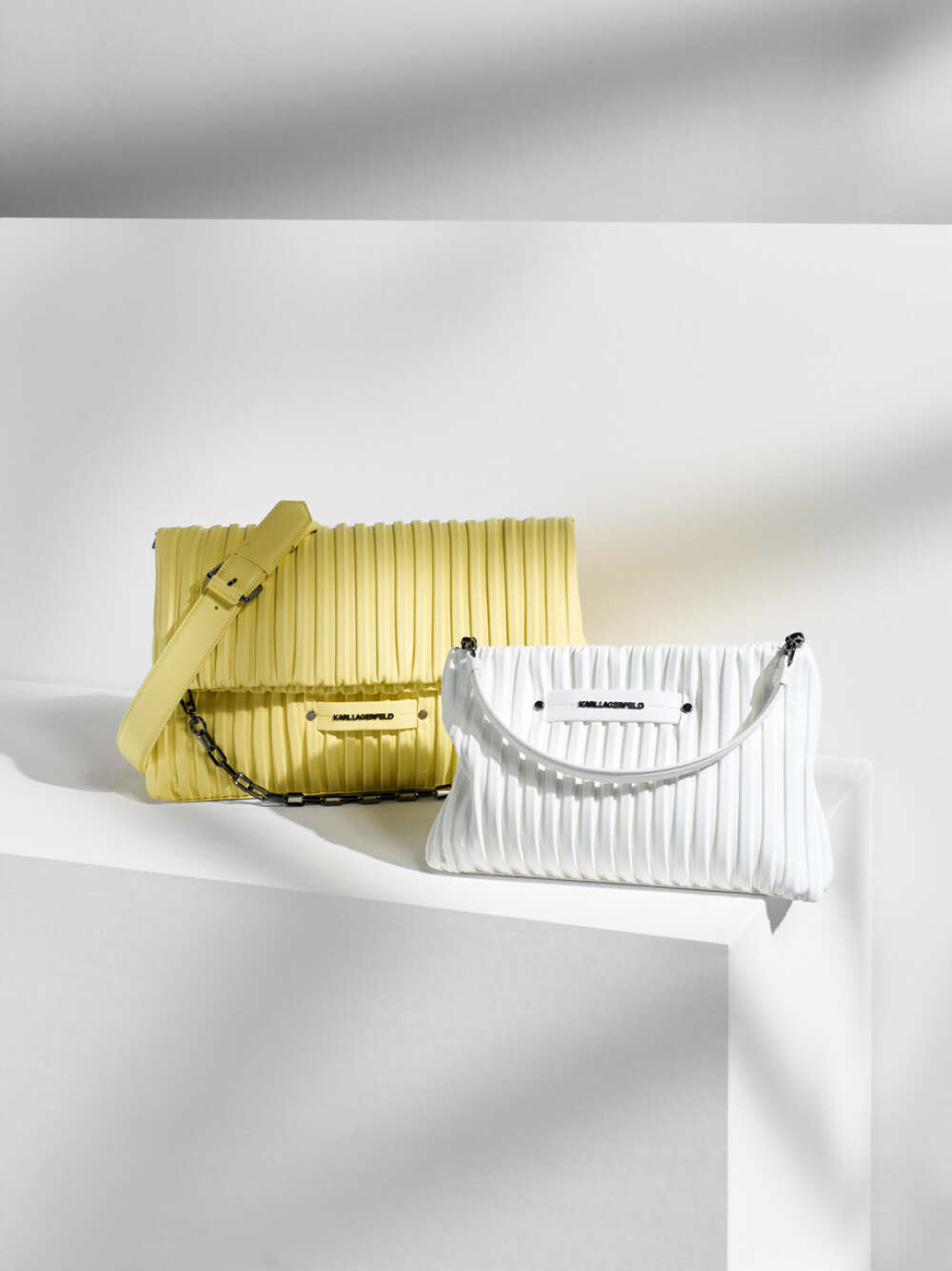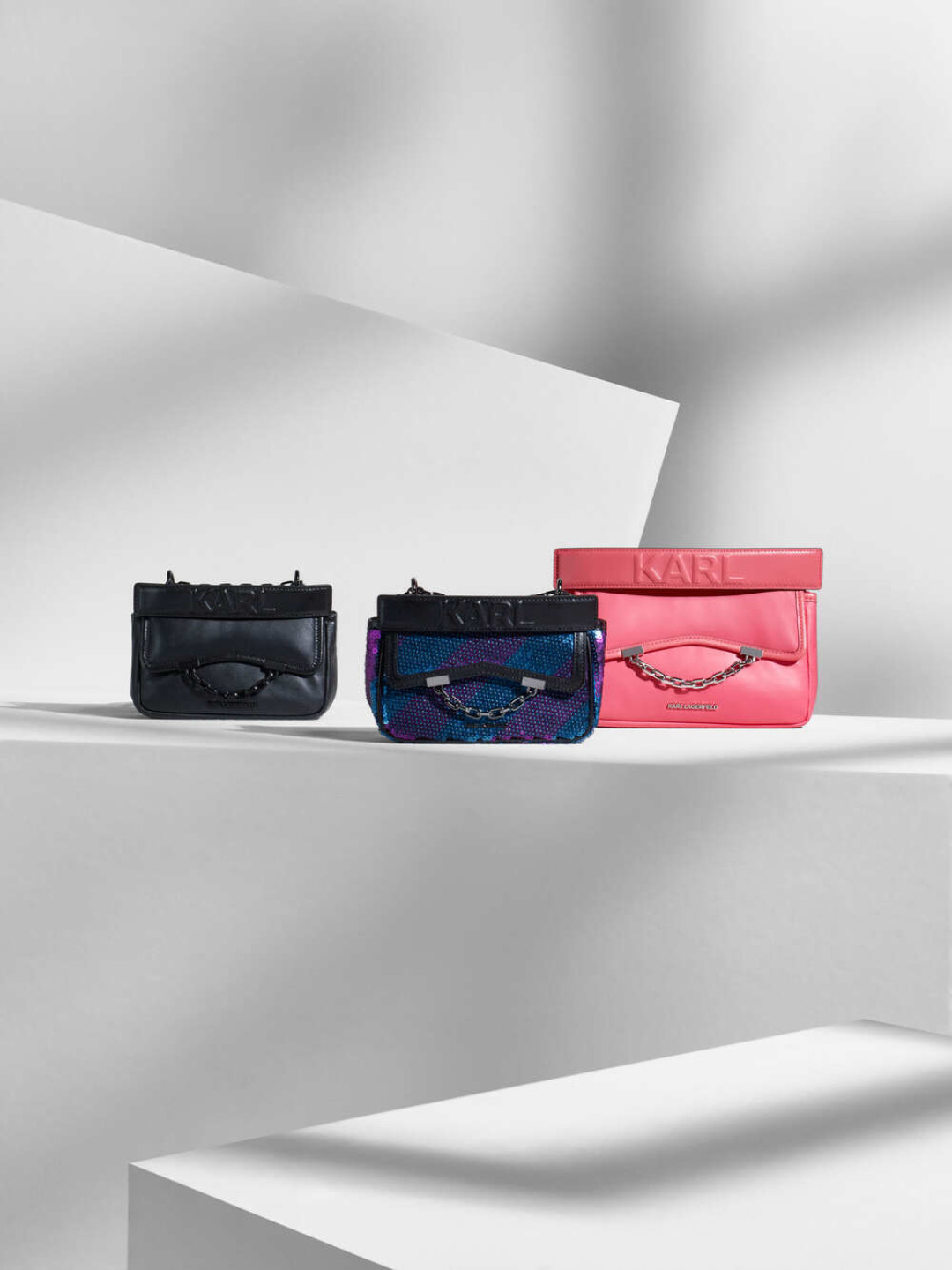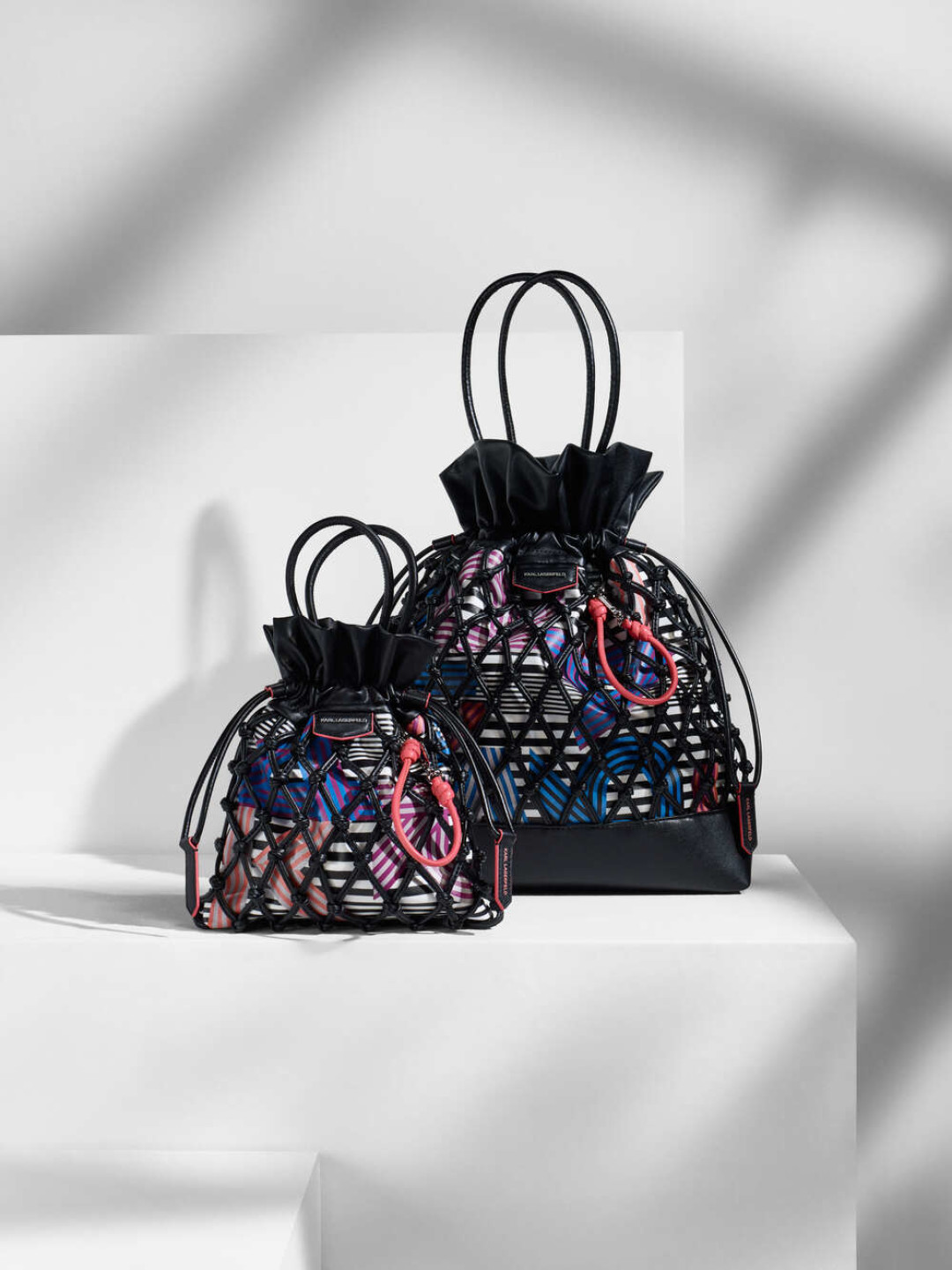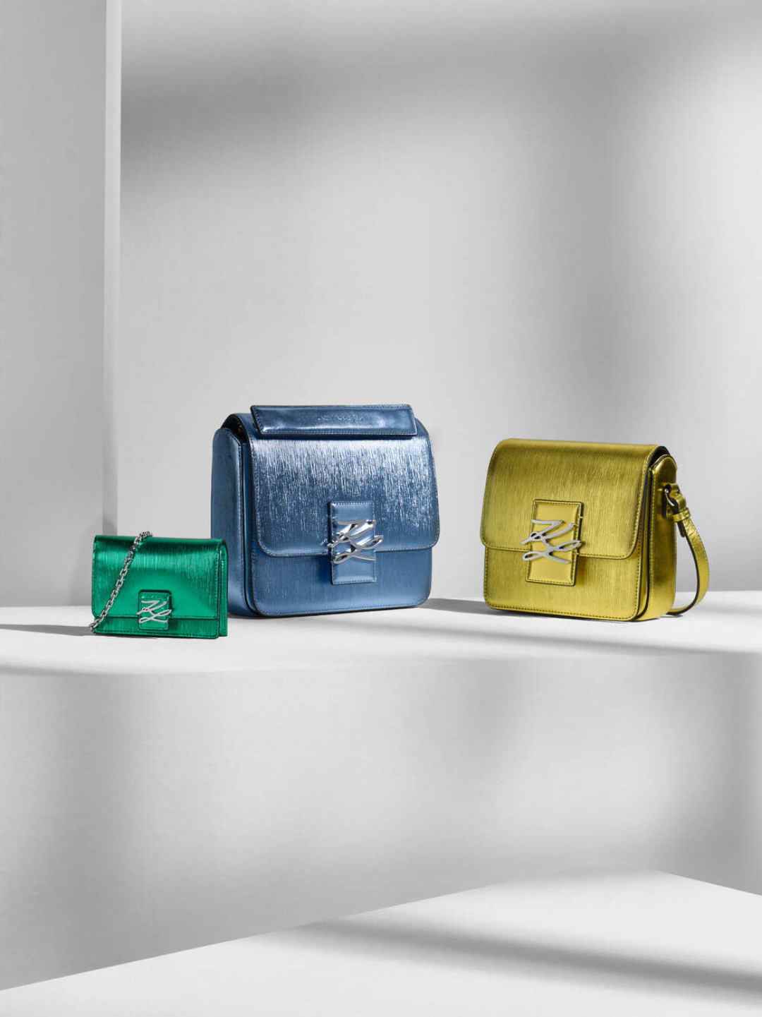 Линия аксессуаров коллекции отлично сочетается с линией одежды. Стоит обратить внимание на новые модели K/Basket и K/Knots, которые выделяются необычной фактурой. Бестселлер K/Karl Seven, сумка вдохновленная счастливым числом Карла Лагерфельда и любимым округом в Париже, возвращается в обновленной версии Soft, а культовая сумка K/Autograph с подписью мэтра теперь доступна в ярких металлических цветах.