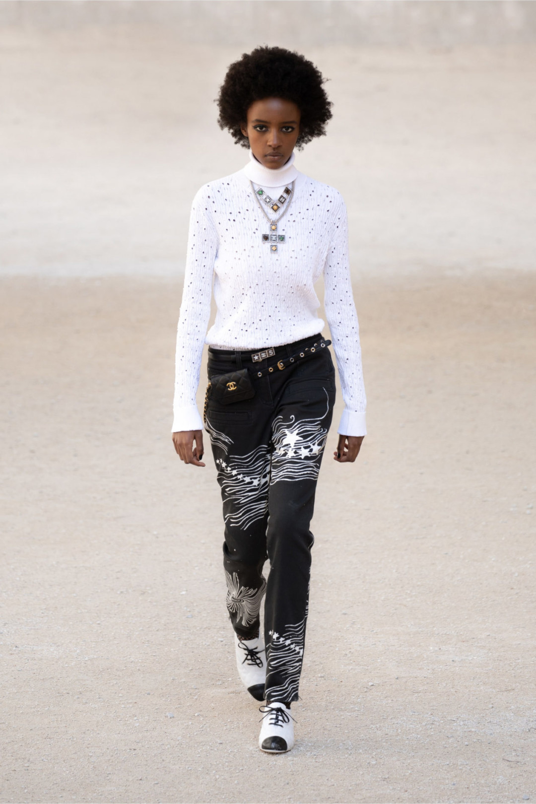Свидетельства дружбы Шанель и Кокто можно найти и в коллекции. Так принты в виде голубя и треугольников отсылают к рисункам Кокто, которыми он сопровождал письма, адресованные дизайнеру, а цветочный принт — напоминание об одном из главных символов фильма «Завещание Орфея». В коллекцию Chanel вошли платья в пол и мини, накидки, болеро, брючные костюмы с фирменными для бренда твидовыми пиджаками, украшения, в том числе, пояса-цепи и пирсинг. Многие платья украсили перья, а сумки — бахрома. Некоторые из сумок Вирджини Виар предложила носить на ноге на манер подвязки.