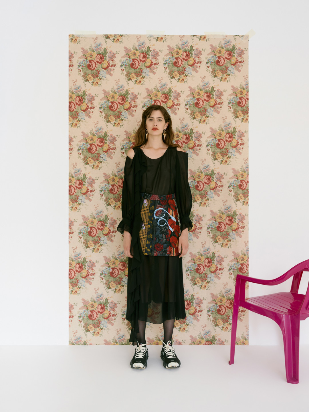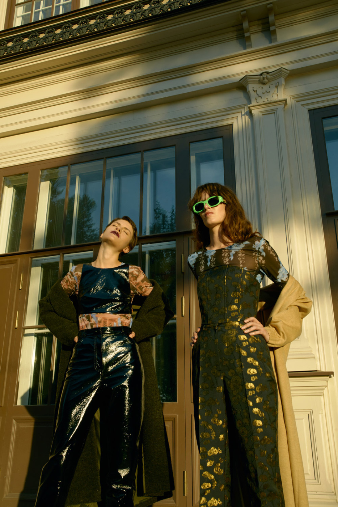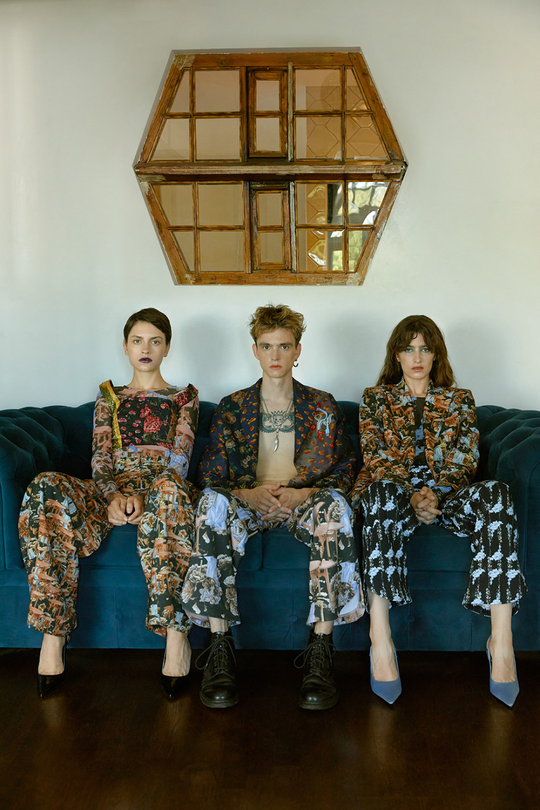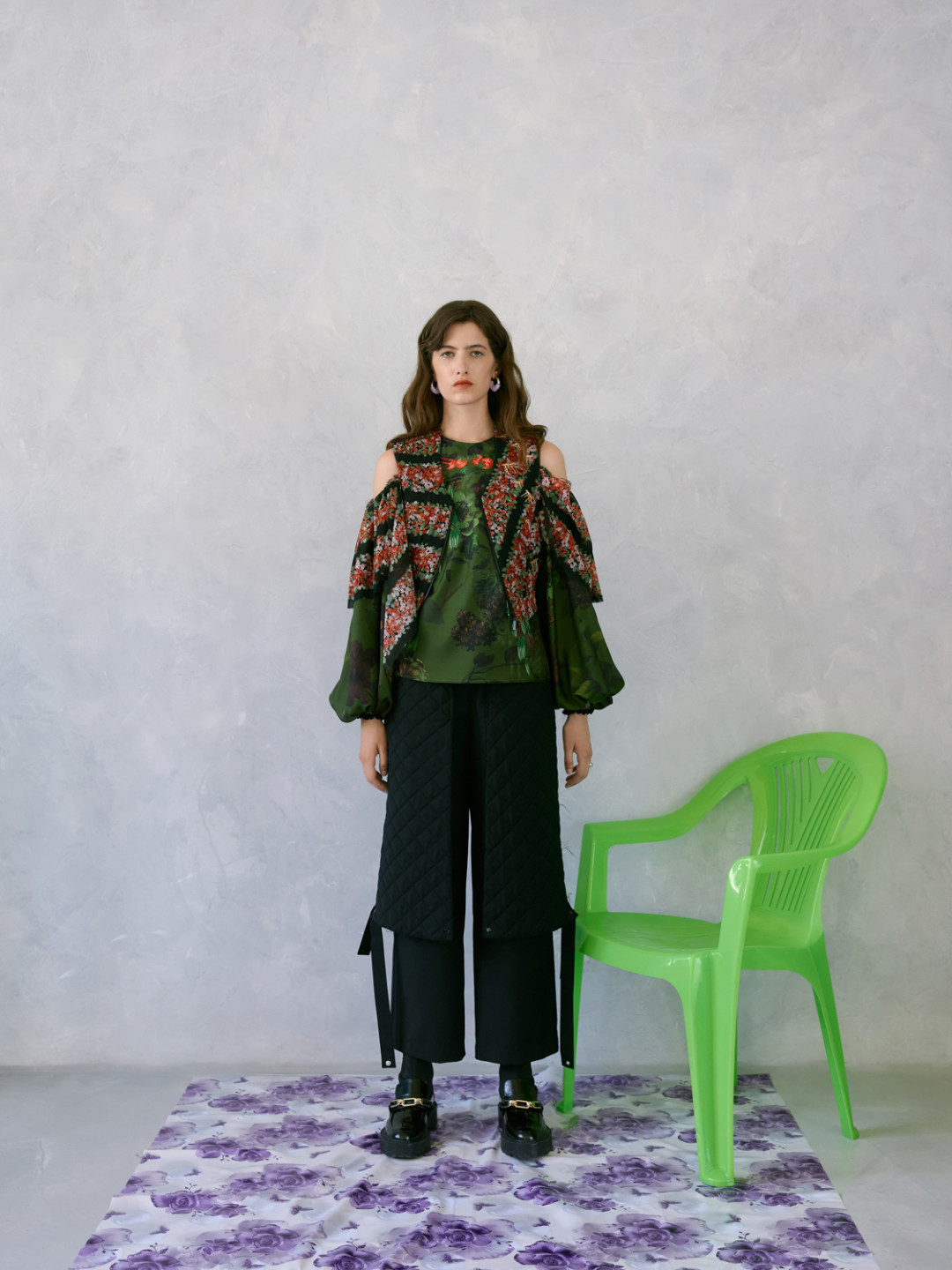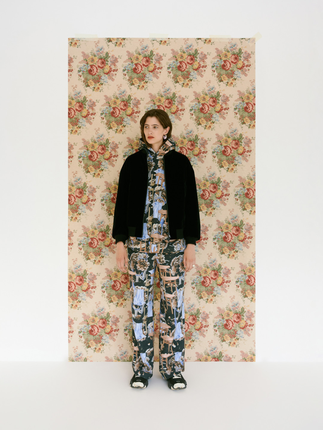 Так вещи украсили принты и вышивки, разработанные вместе с Дмитрием Кавкой. За основу взята серия работ художника Random Life — случайные сиюминутные натюрморты, составленные из теряющих первоначальную форму и перетекающих друг в друга изображений базы Google. Среди главных приемов коллекции — деконструкция и состаривание. К выбору такой эстетики дизайнер бренда Оля Гинзбург пришла, изучая архивы Эрмитажа по реставрации одежды, флагов, мебели. В итоге роскошный жаккард с цветочными принтами — основные ткани коллекции — искусственно состарены и отчасти разрушены. Деконструкцию иллюстрируют необработанные края вещей и торчащий утеплитель стеганых деталей.