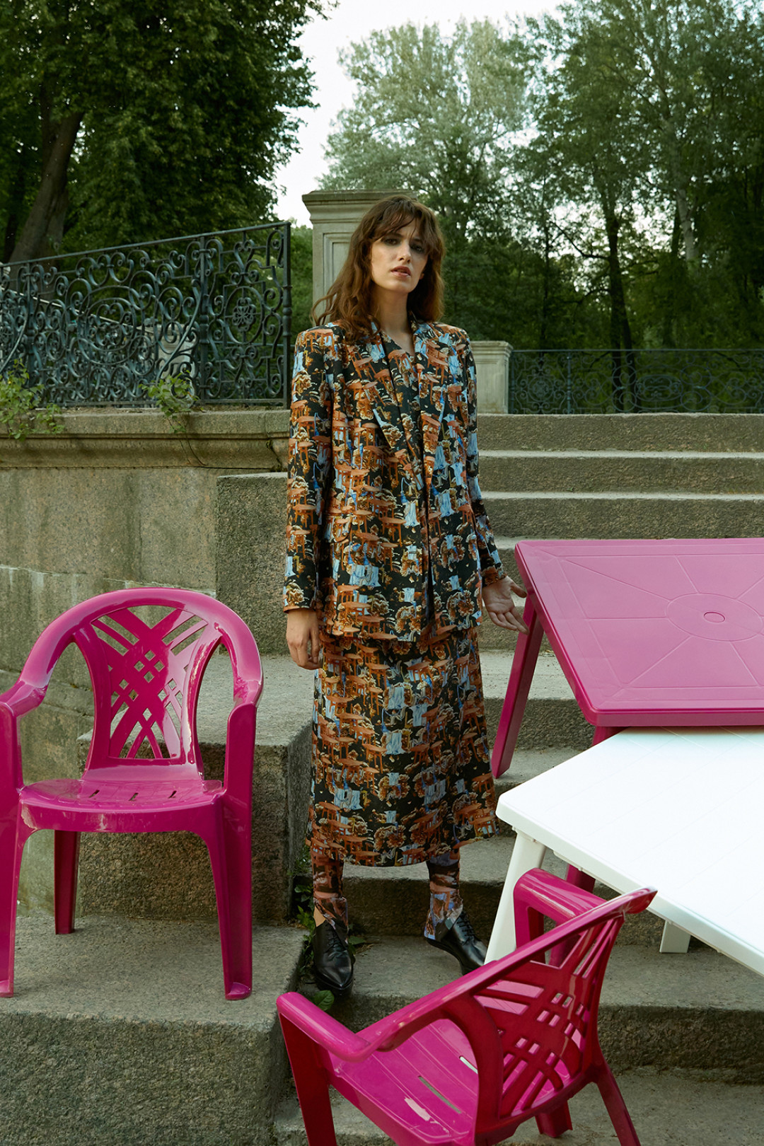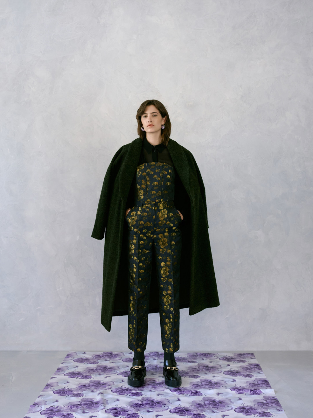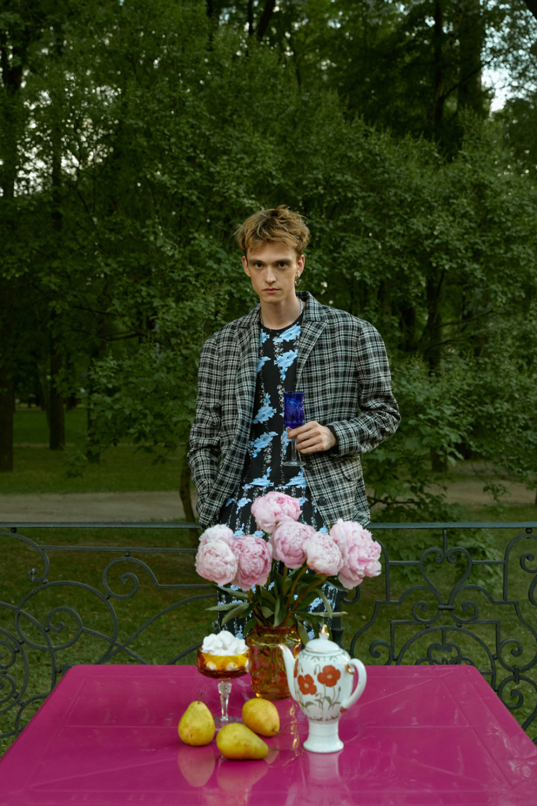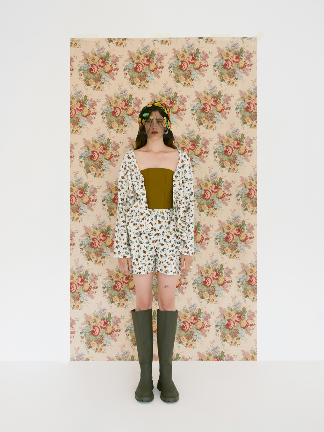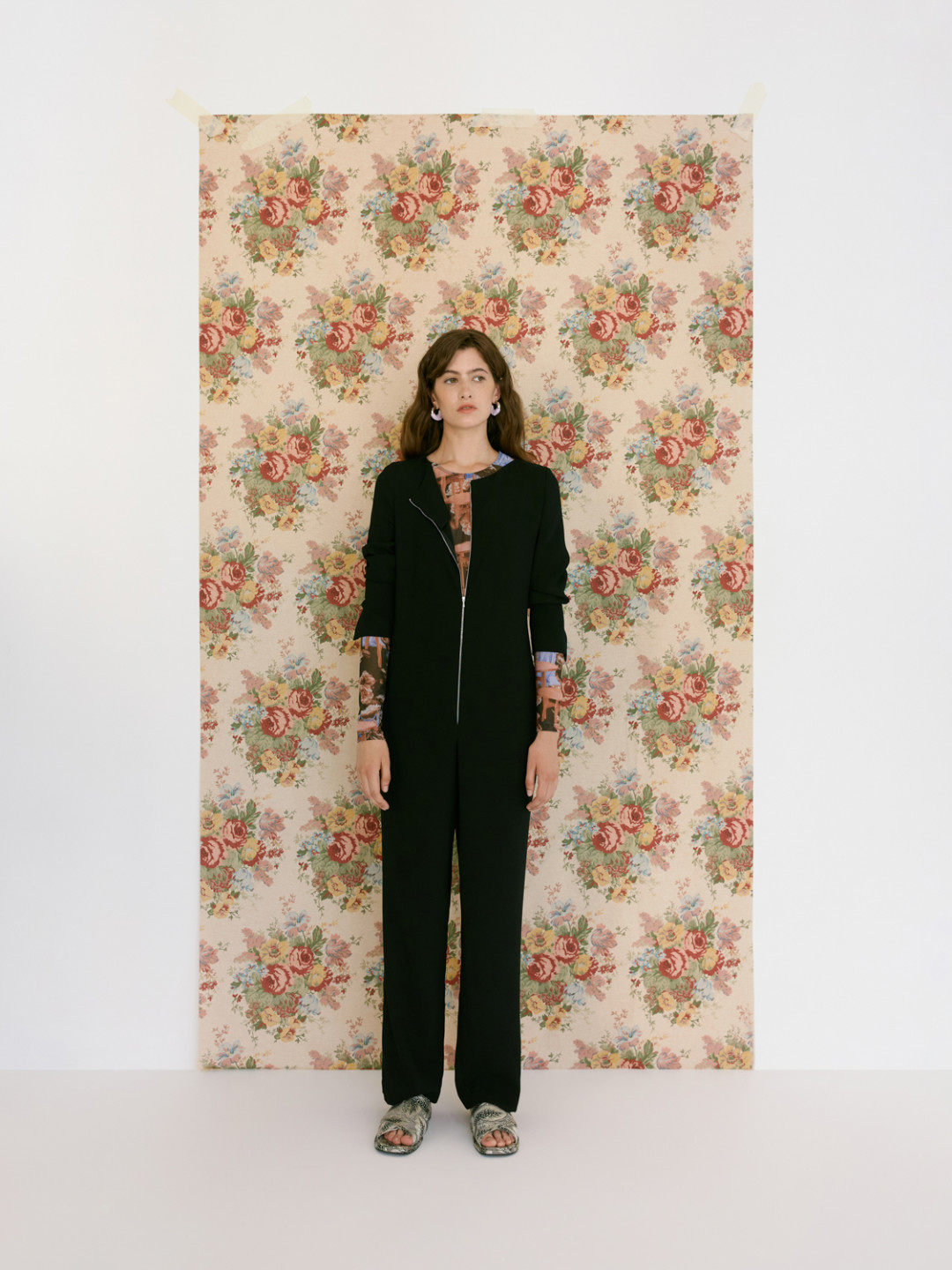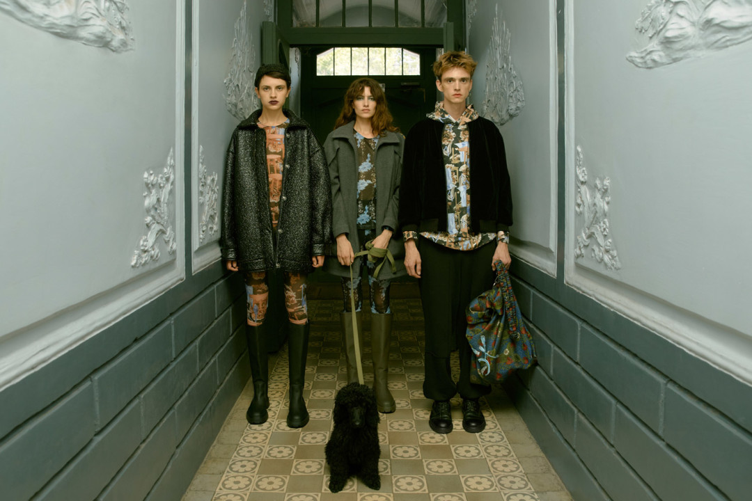 Так вещи украсили принты и вышивки, разработанные вместе с Дмитрием Кавкой. За основу взята серия работ художника Random Life — случайные сиюминутные натюрморты, составленные из теряющих первоначальную форму и перетекающих друг в друга изображений базы Google. Среди главных приемов коллекции — деконструкция и состаривание. К выбору такой эстетики дизайнер бренда Оля Гинзбург пришла, изучая архивы Эрмитажа по реставрации одежды, флагов, мебели. В итоге роскошный жаккард с цветочными принтами — основные ткани коллекции — искусственно состарены и отчасти разрушены. Деконструкцию иллюстрируют необработанные края вещей и торчащий утеплитель стеганых деталей.
