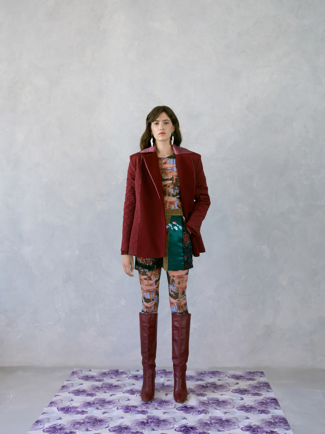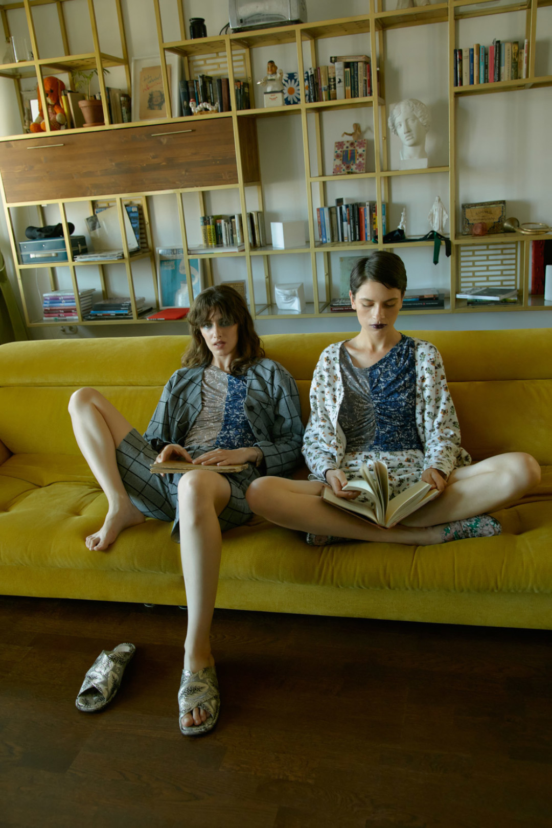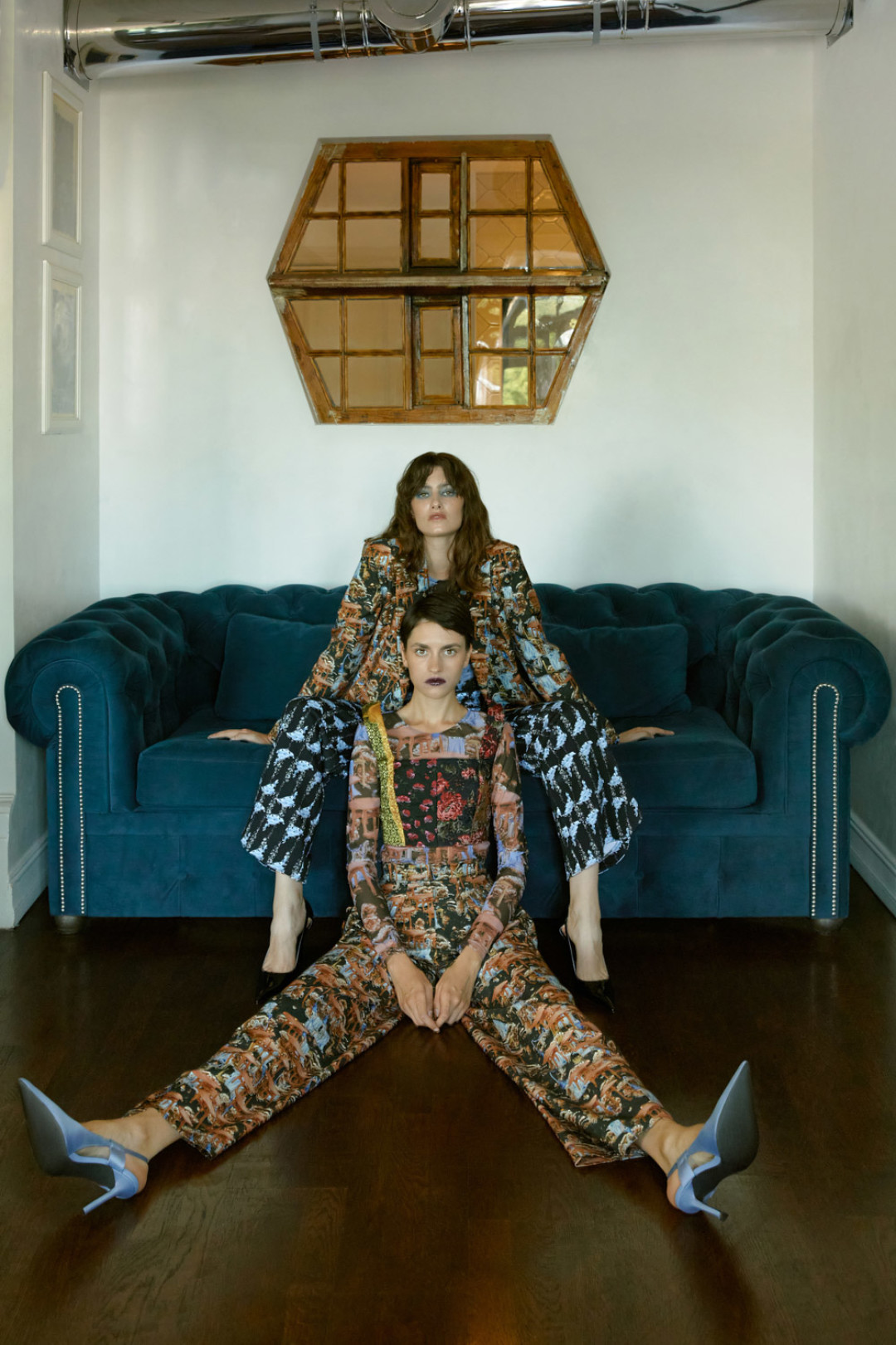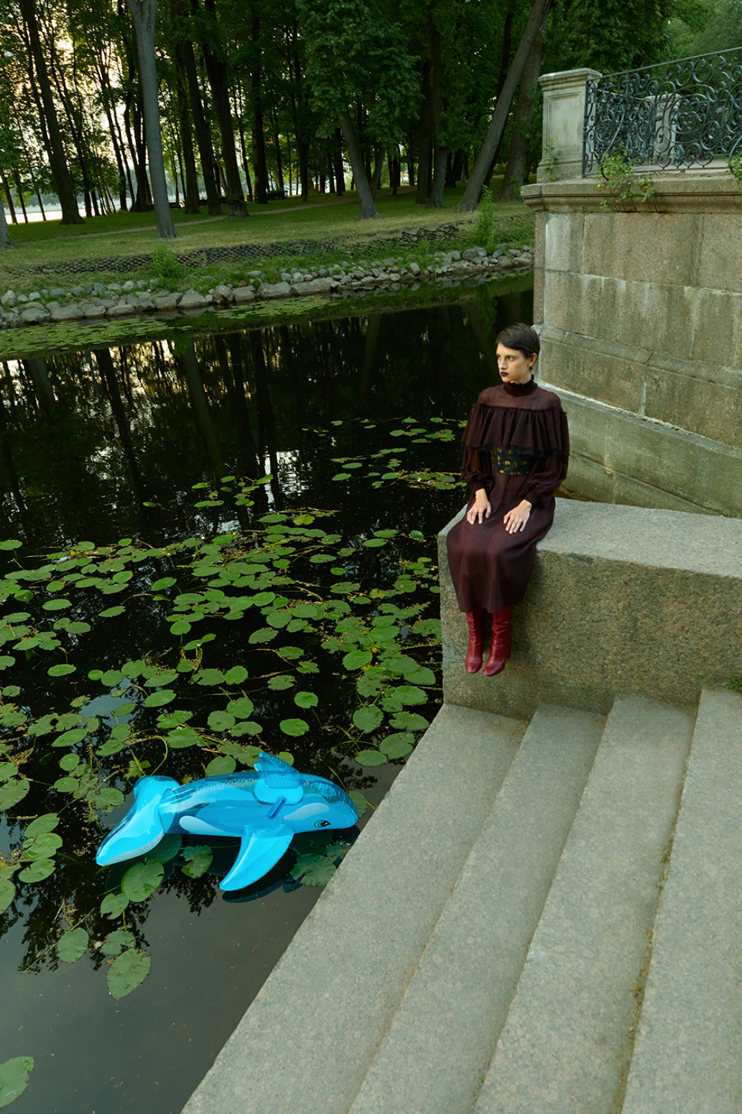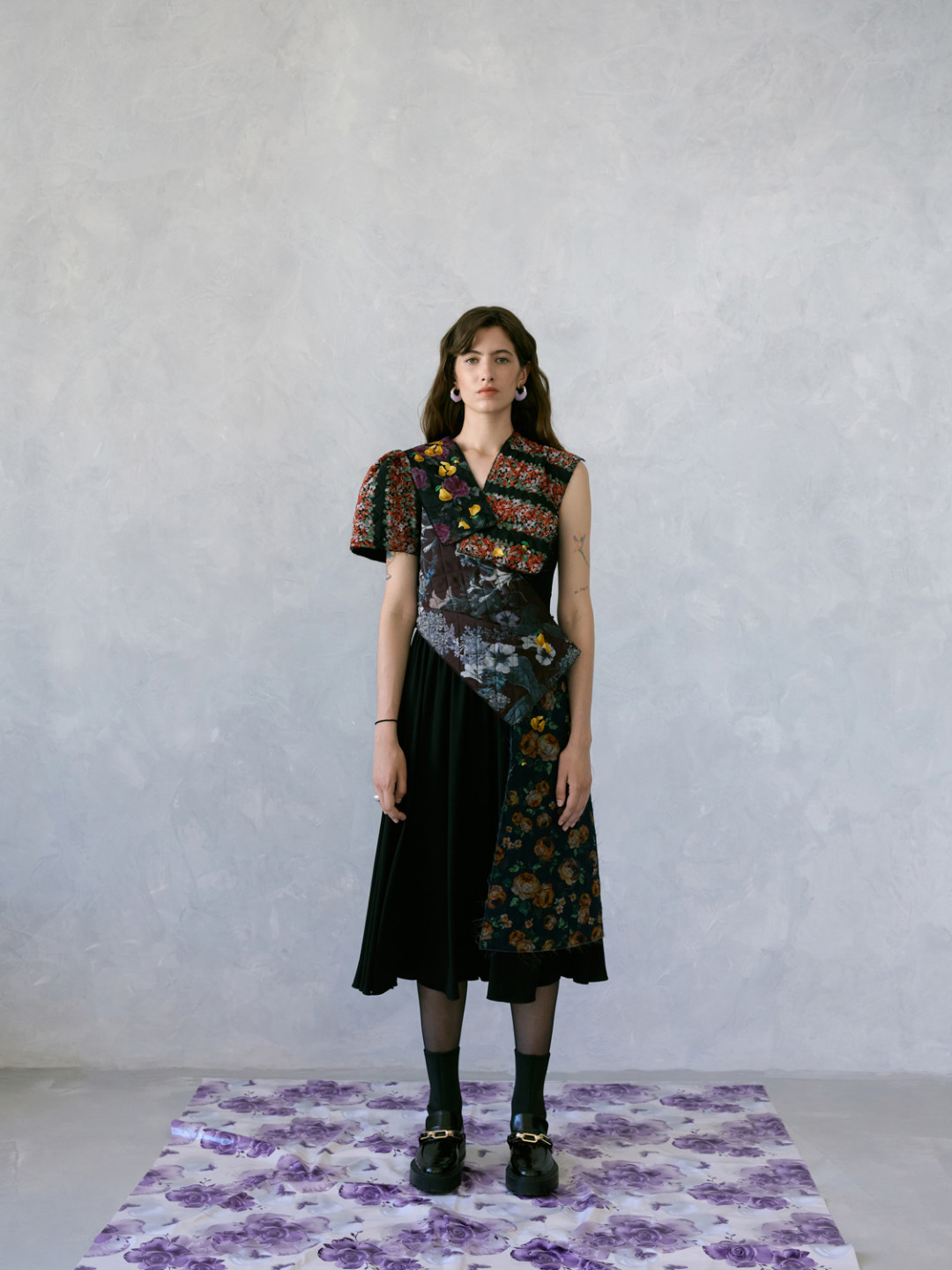 Так вещи украсили принты и вышивки, разработанные вместе с Дмитрием Кавкой. За основу взята серия работ художника Random Life — случайные сиюминутные натюрморты, составленные из теряющих первоначальную форму и перетекающих друг в друга изображений базы Google. Среди главных приемов коллекции — деконструкция и состаривание. К выбору такой эстетики дизайнер бренда Оля Гинзбург пришла, изучая архивы Эрмитажа по реставрации одежды, флагов, мебели. В итоге роскошный жаккард с цветочными принтами — основные ткани коллекции — искусственно состарены и отчасти разрушены. Деконструкцию иллюстрируют необработанные края вещей и торчащий утеплитель стеганых деталей.