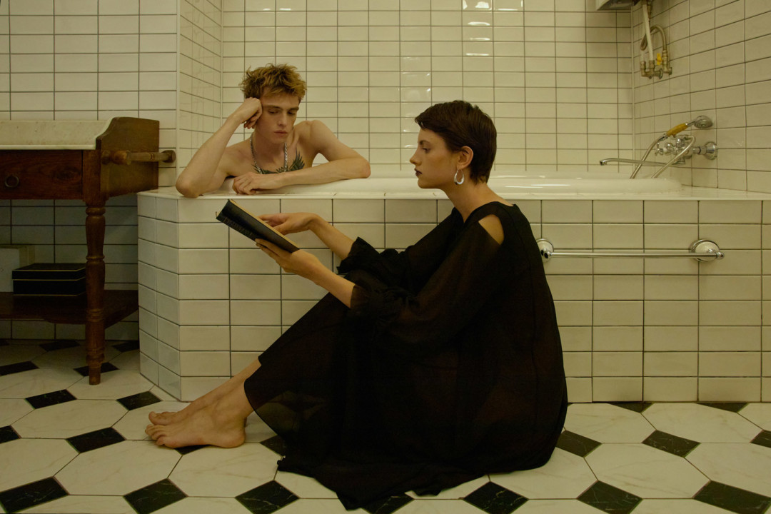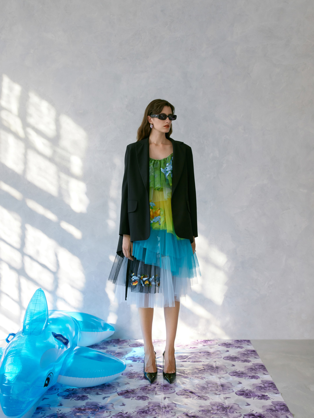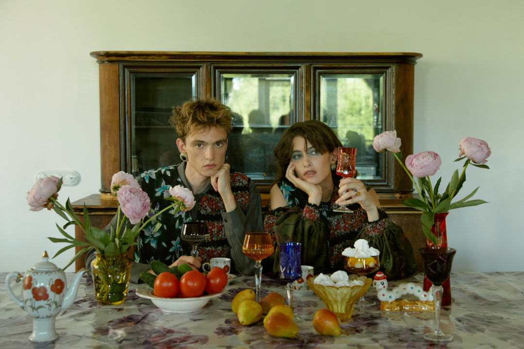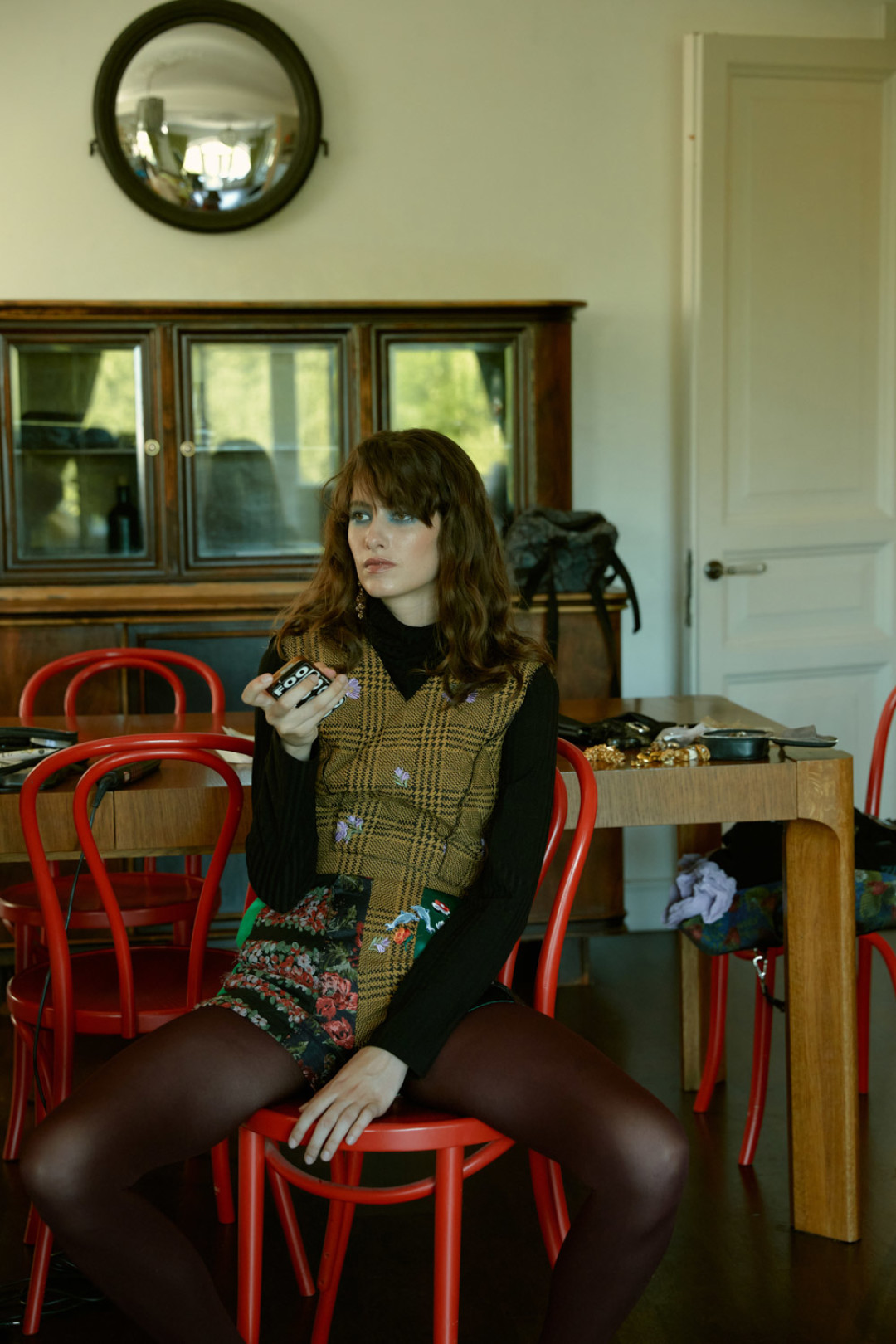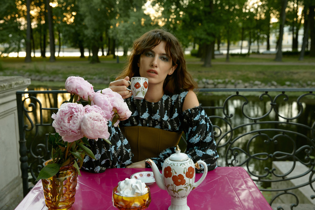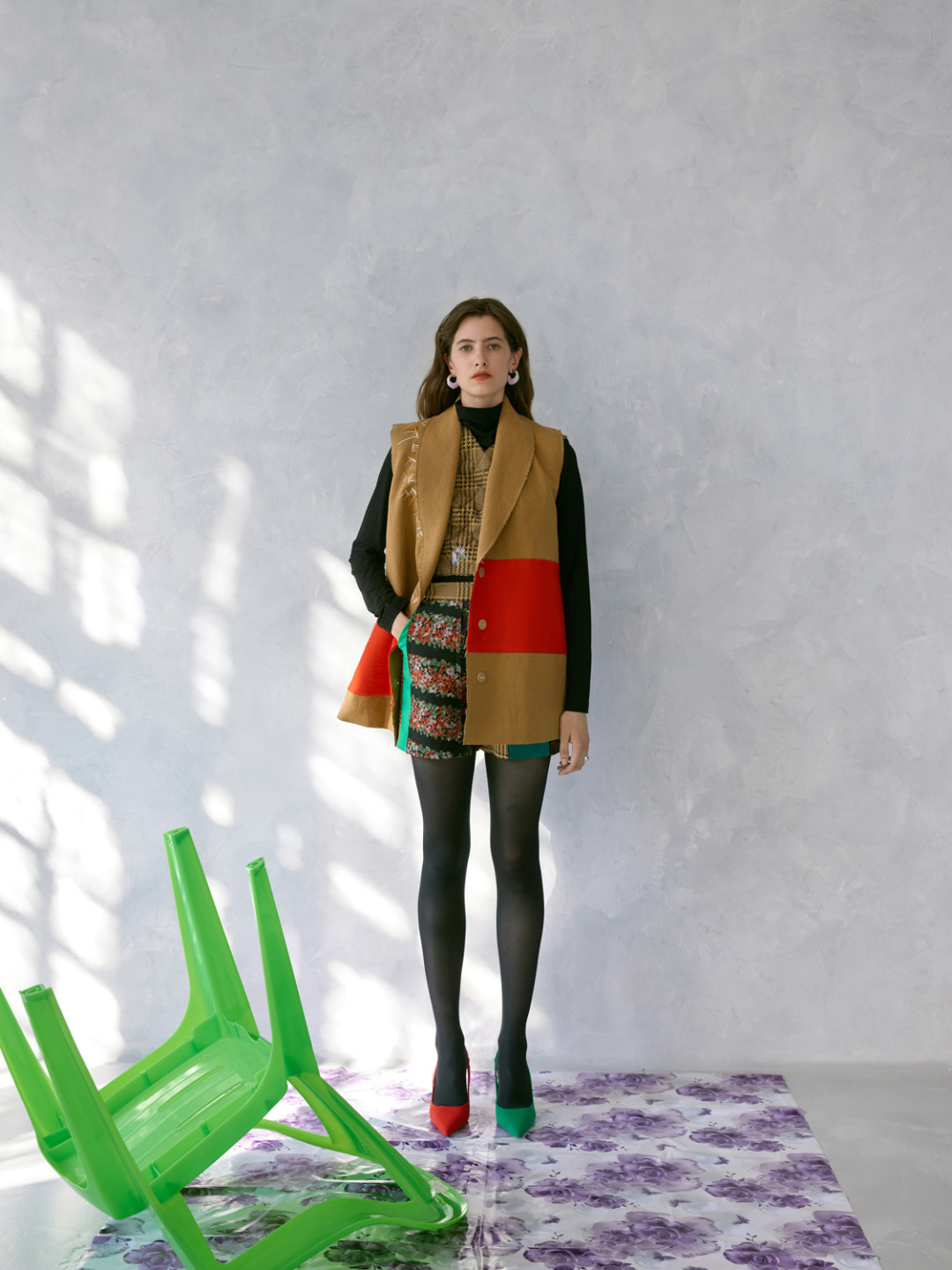 Так вещи украсили принты и вышивки, разработанные вместе с Дмитрием Кавкой. За основу взята серия работ художника Random Life — случайные сиюминутные натюрморты, составленные из теряющих первоначальную форму и перетекающих друг в друга изображений базы Google. Среди главных приемов коллекции — деконструкция и состаривание. К выбору такой эстетики дизайнер бренда Оля Гинзбург пришла, изучая архивы Эрмитажа по реставрации одежды, флагов, мебели. В итоге роскошный жаккард с цветочными принтами — основные ткани коллекции — искусственно состарены и отчасти разрушены. Деконструкцию иллюстрируют необработанные края вещей и торчащий утеплитель стеганых деталей.