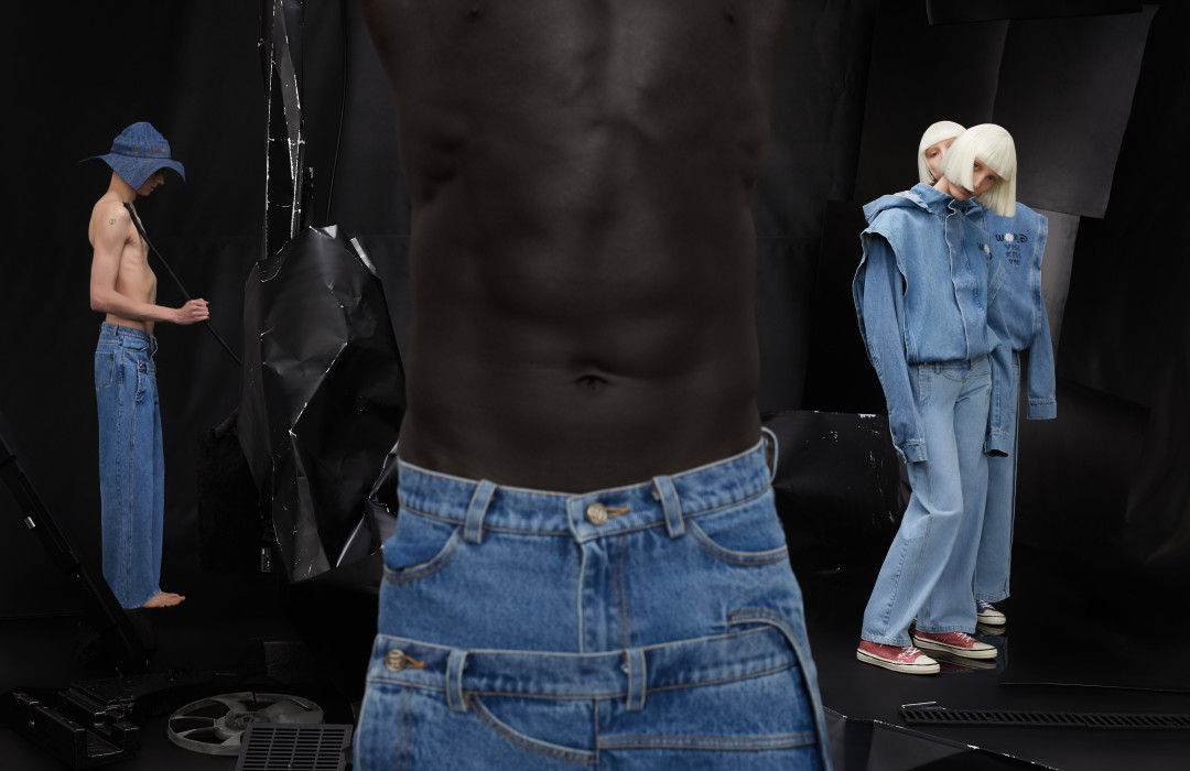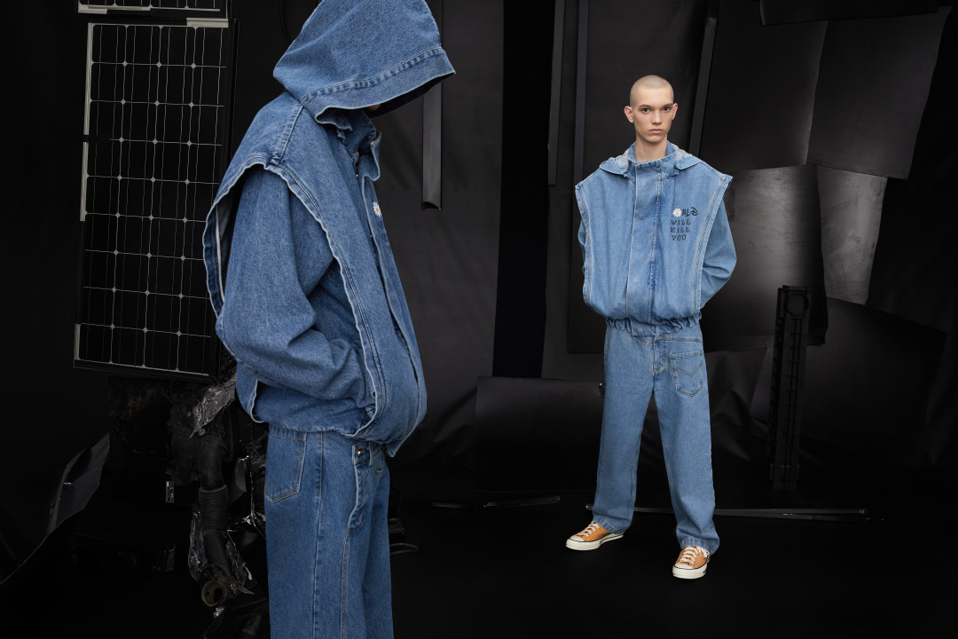 Среди вещей коллекции ассиметричные джинсы-трубы в нескольких цветах – от классического голубого до оттенков с эффектом деграде, объемная куртка с капюшоном из мягкой голубой джинсы. Карманы, пуговицы и молнии на джинсах с традиционных мест сместились в стороны, некоторые модели украсил декоративный пояс с запахом и авторские вышивки «World will kill you»,