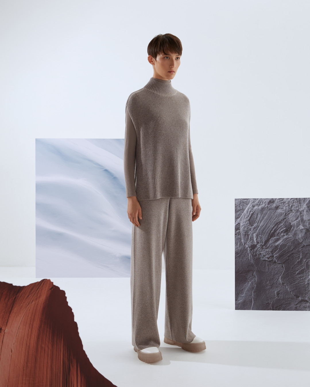 В коллекцию вошли трикотажные жилеты со спущенным плечом и высоким горлом, трикотажные штаны прямого кроя, несколько видов курток, а также бестселлер марки — крутка Venus из экологичного утеплителя Все вещи демисезонные.