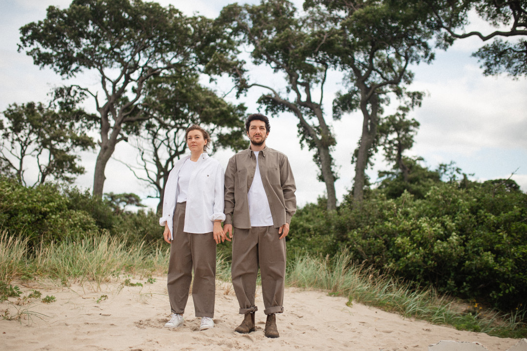 Петербургский бренд NNedre в новом сезоне решил отойти от привычной сдержанной монохромной палитры — в осенней коллекции преобладают сочетания темно-серых, синих и бежевых оттенков. Лукбук отсняли на побережье Калининградской области, палитра которого и вдохновила дизайнера марки Нелли Недре на цветовые решения.