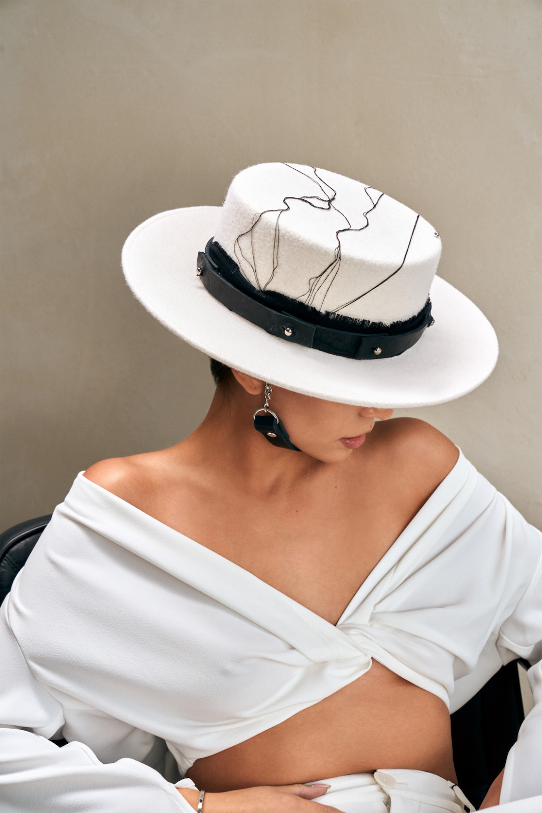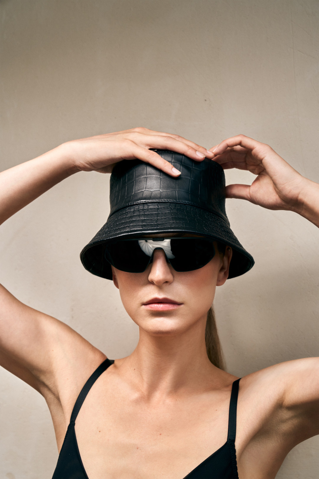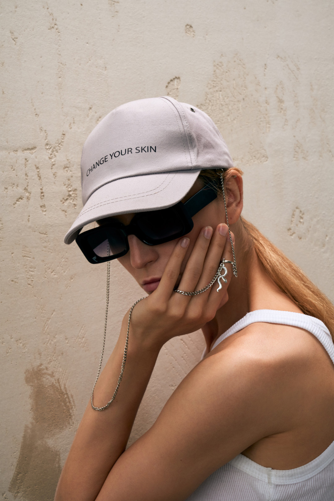 Среди головных уборов осенней коллекции Cocoshnick Headdress шляпы из фетра и велюра, декорированные кожаными и металлическими элементами, кожаные панама и берет, платки с принтом и бейсболка, которую украсила цепочка. Шляпы и бейсболки также дополнены надписью с названием коллекции — Change your skin. Цветовая палитра состоит из трендового оранжевого, а также классических черного, белого и темно-синего оттенков.