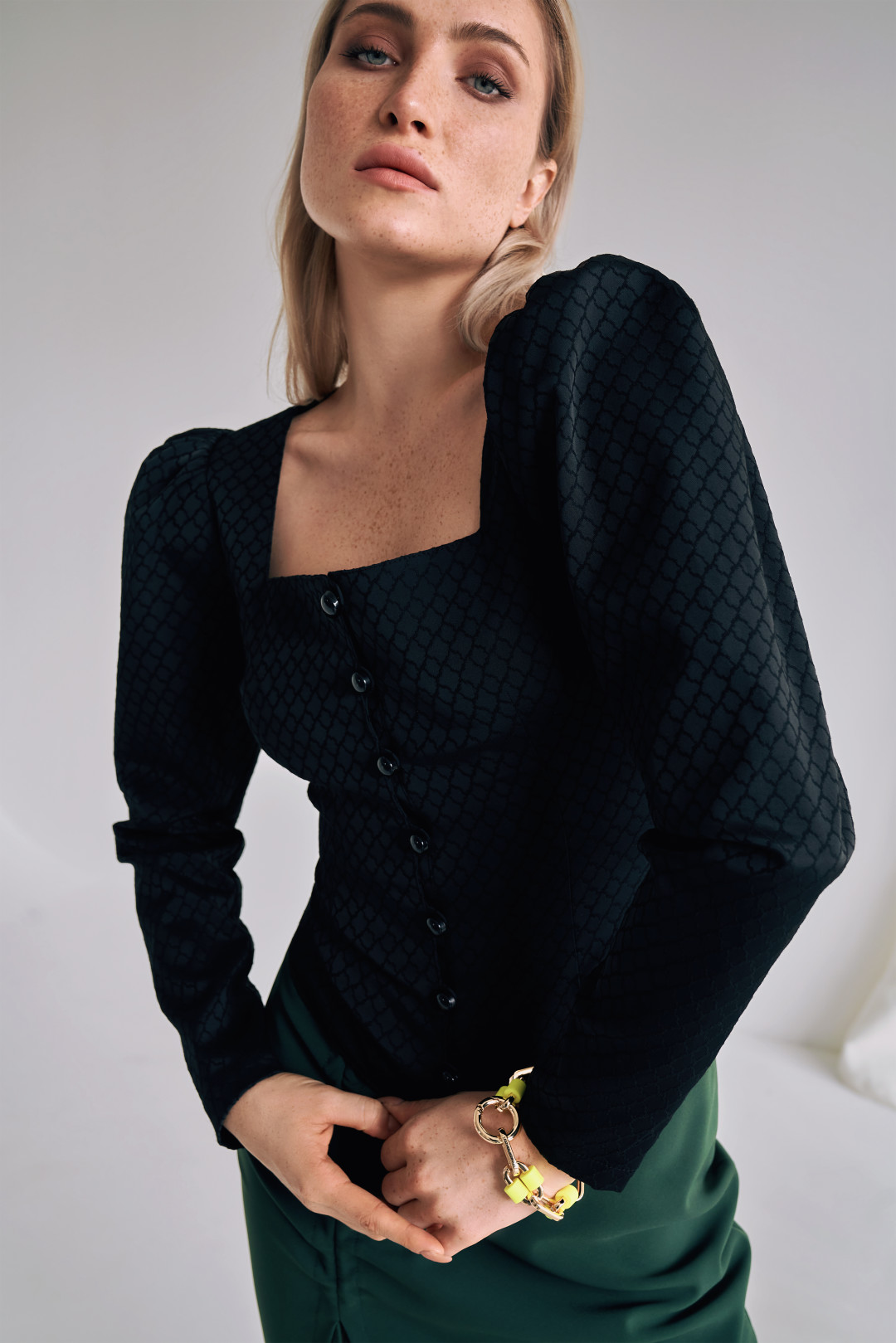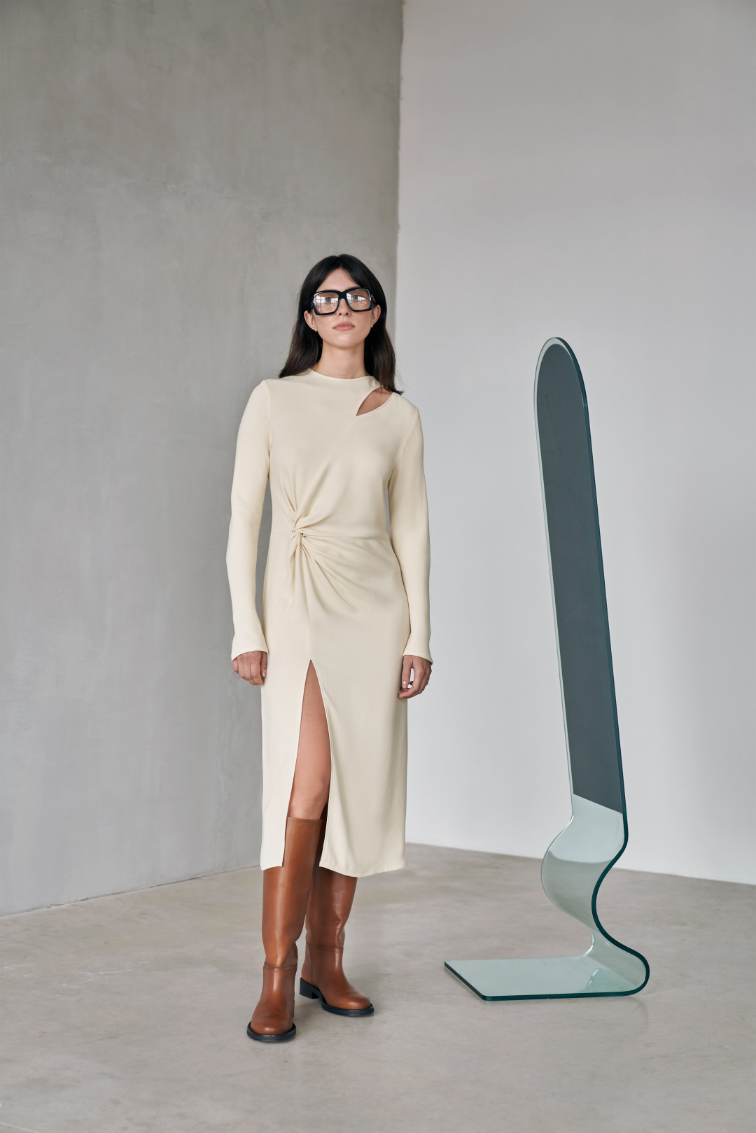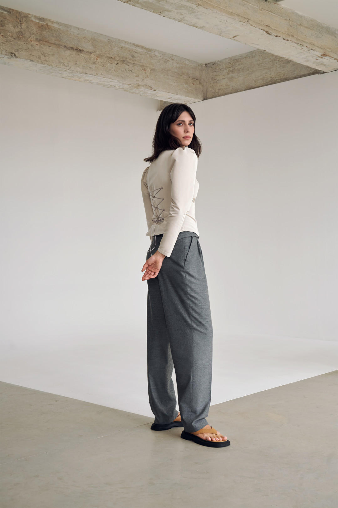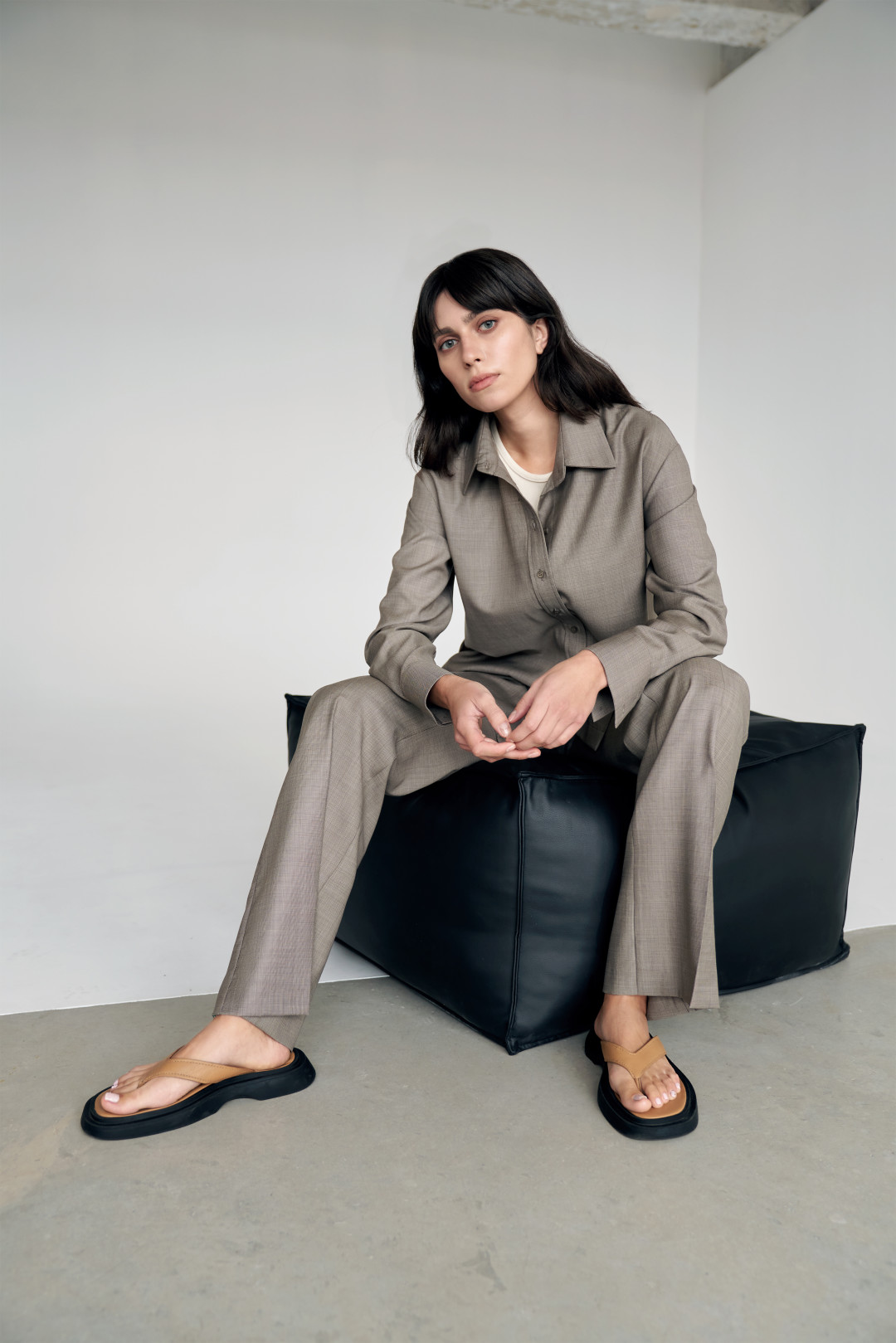 Осенне-зимняя коллекция Subbota Label состоит из брюк мужского силуэта, приталенных блуз, мягких рубашек, платьев, оверсайз жакетов, мини-юбок и жакетов-трансформеров, которые можно носить и как кейп, и как жилет. Также в ней есть и подчеркнуто феминные вещи — с разрезами, вырезами и акцентом на талии. Например, приталенный тренч из черной кожи.
