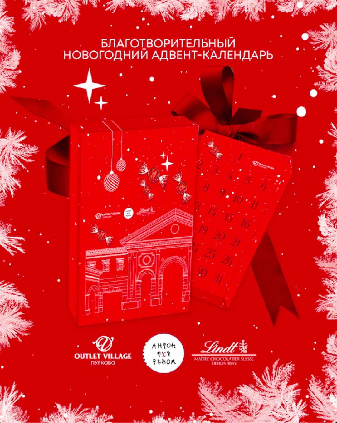 Outlet Village Пулково вместе со швейцарской компанией Lindt создали праздничные адвент-календари. Получить их можно за пожертвование с 15 ноября по 1 декабря в информационном центре аутлета. Сумма пожертвования не ограничена — от 1000 рублей. Все собранные средства отправятся в благотворительный фонд «Антон тут Рядом».