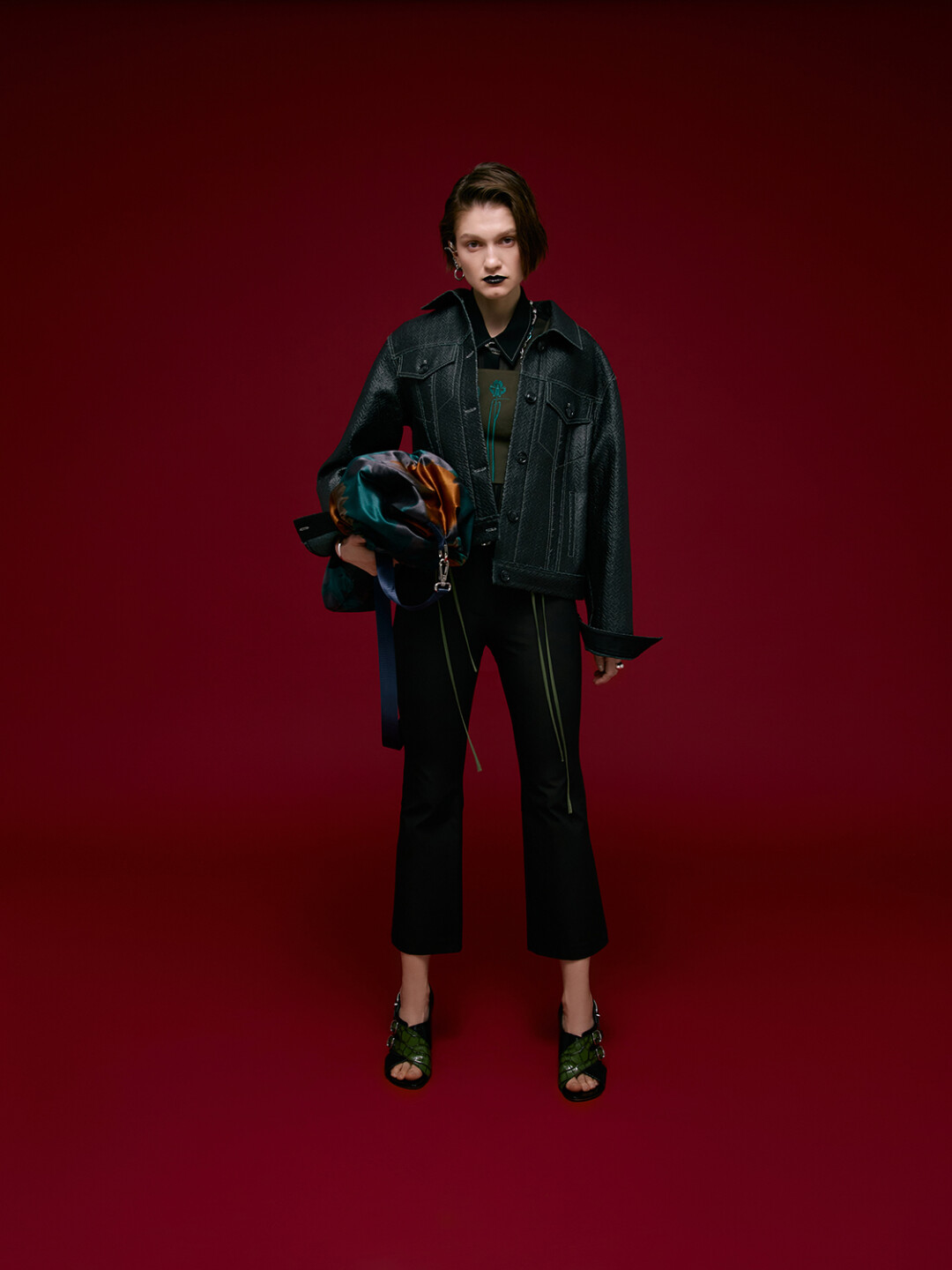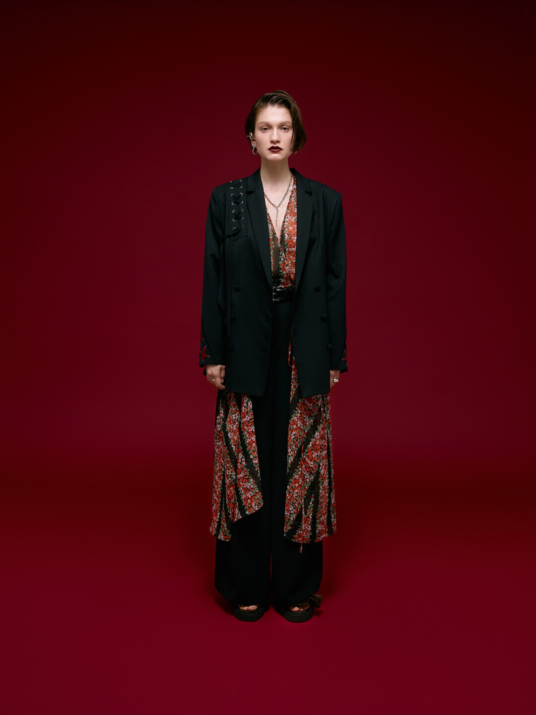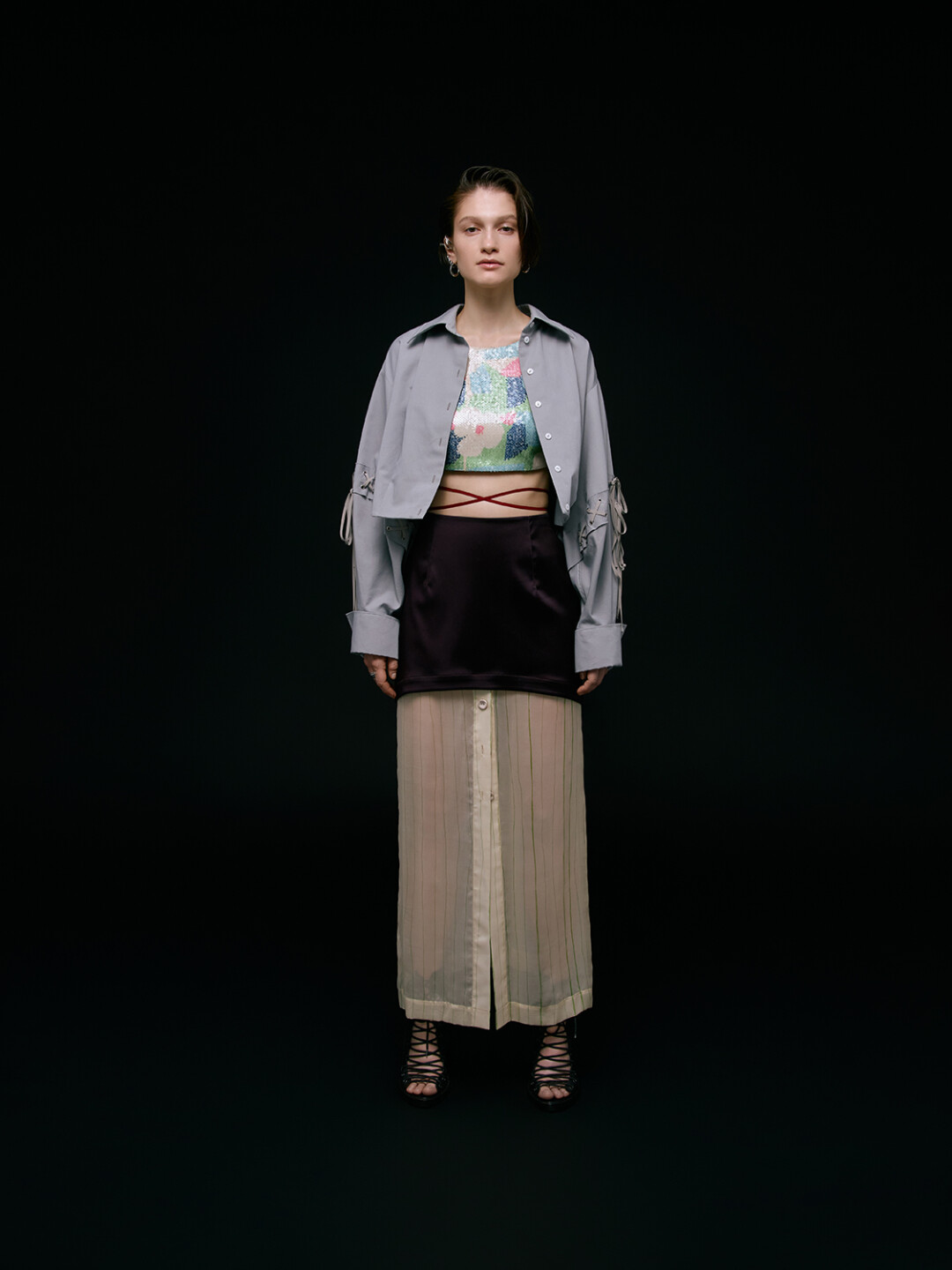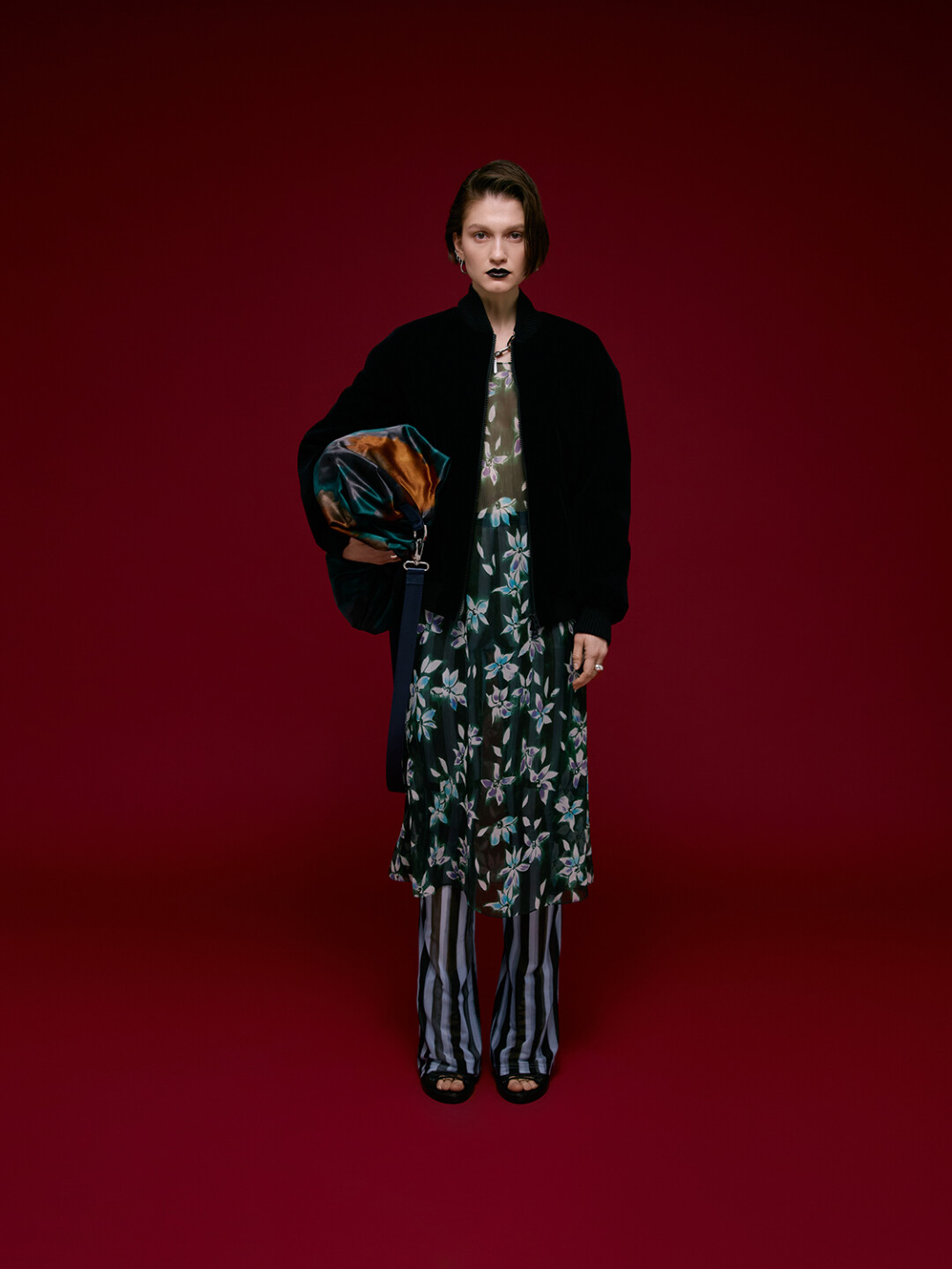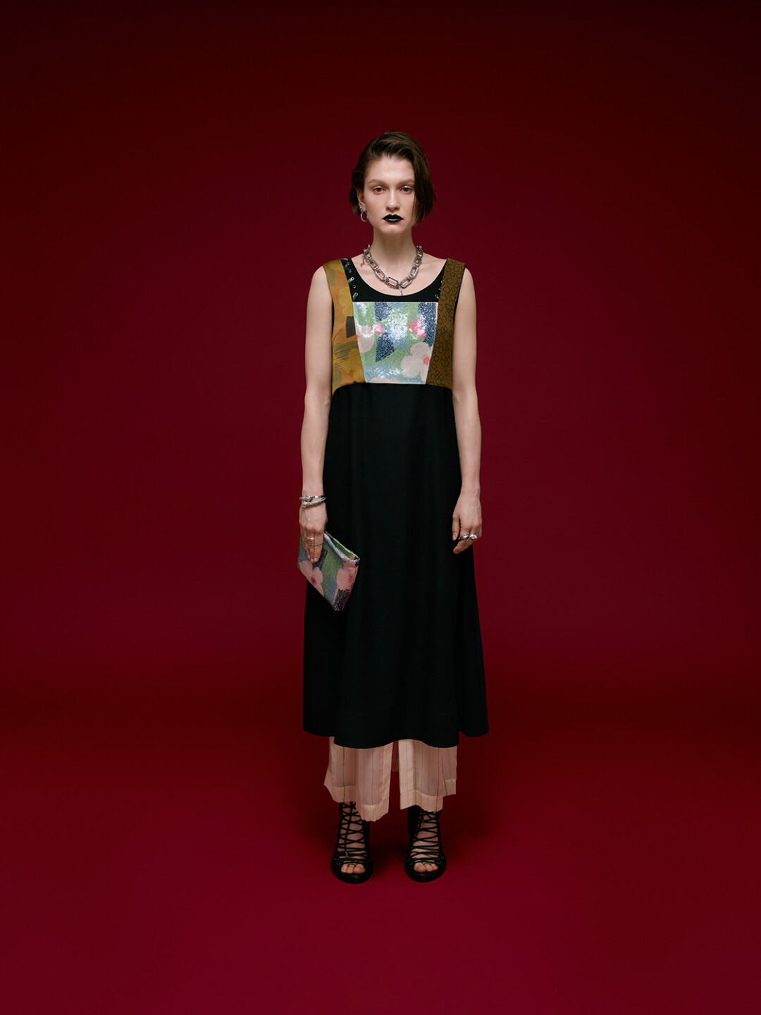 Коллекция отличается подчеркнутой феминностью. За женственность в ней отвечают полупрозрачные сарафаны, блузки и платья-кимоно, структурированные бюстье, а также юбки и топы с нежным цветочным принтом и пайетками. Кроме того, в коллекции есть комплекты из сетки: полосатые лонгсливы и легинсы-клеш в двух вариантах расцветки, хлопковые футболки и лонгсливы с вышивкой в стиле модерн, бархатный бомбер, удлиненный тренч. Среди аксессуаров — объемные сумки из красной и черной лаке, принтованной шерсти и шелка. Большая часть вещей создана с использованием оставшихся от предыдущих коллекций тканей.