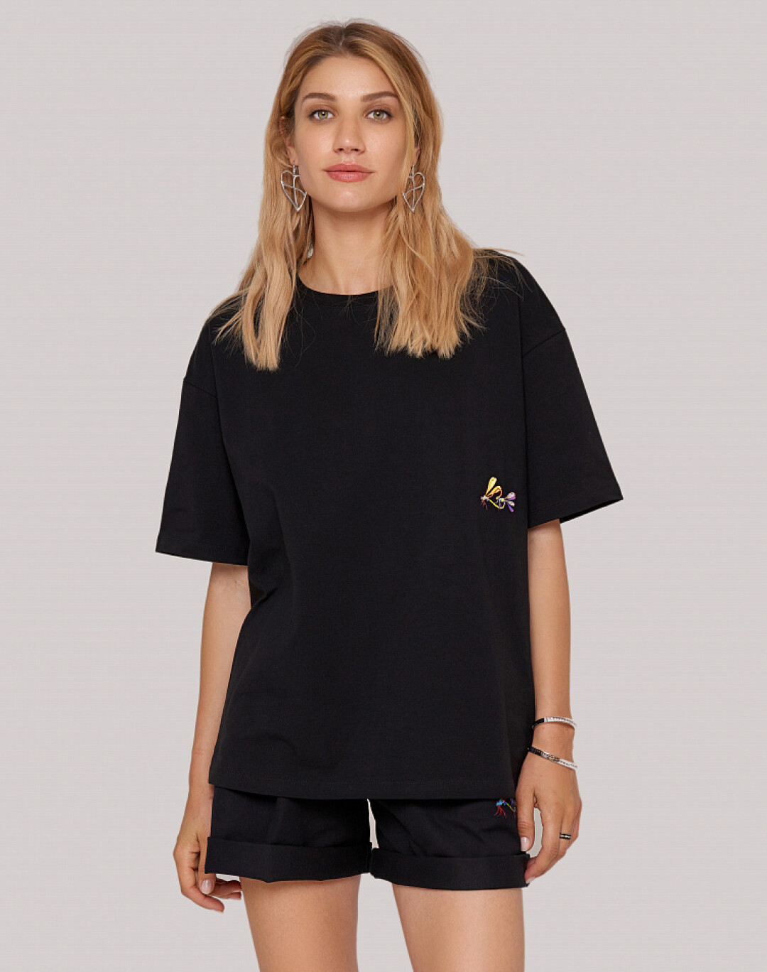 Анна Лагойская делает идеальные базовые вещи: например, объемная футболка Wanna A. с правильным рукавом — это хит. И его можно кастомизировать: по вашей просьбе нанесут слоган No risk — no magiс или принт в виде стрекозы.