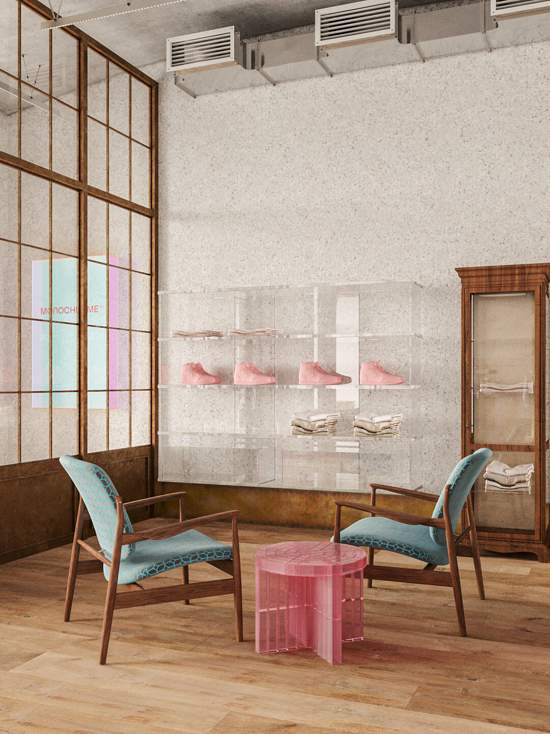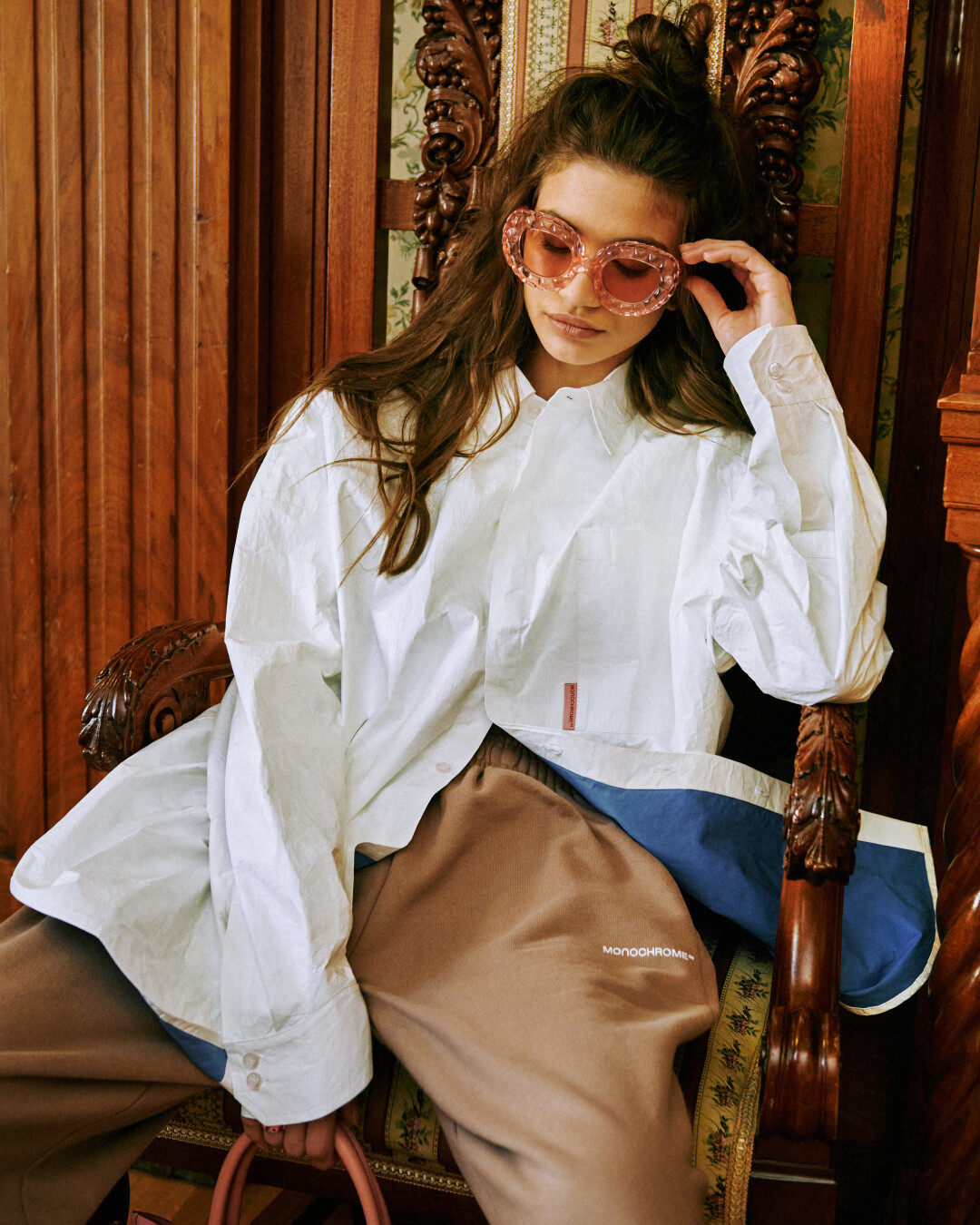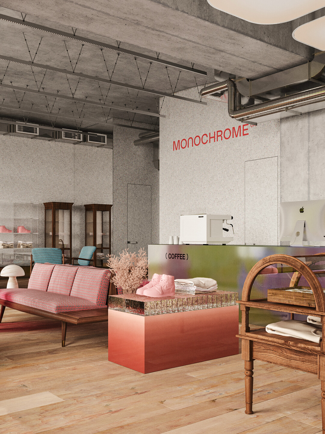 В петербургском магазине Monochrome можно найти все то же, что и в московских. Это знаковые оверсайз-вещи и хиты бренда: рубашки, худи, свитшоты, пуховики, свитеры, пальто. Еще создатели марки обещают лимитированные и эксклюзивные коллекции, а также специальную капсулу для Петербурга. Визуально новый магазин отличается от своих столичных предшественников, он соединил индустриальные элементы, дерево, зону отдыха и знаковый для Monochrome розовый цвет.