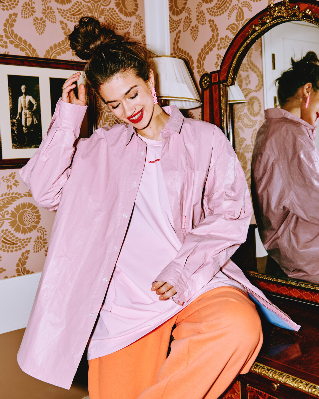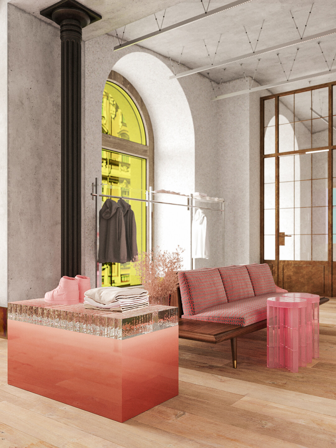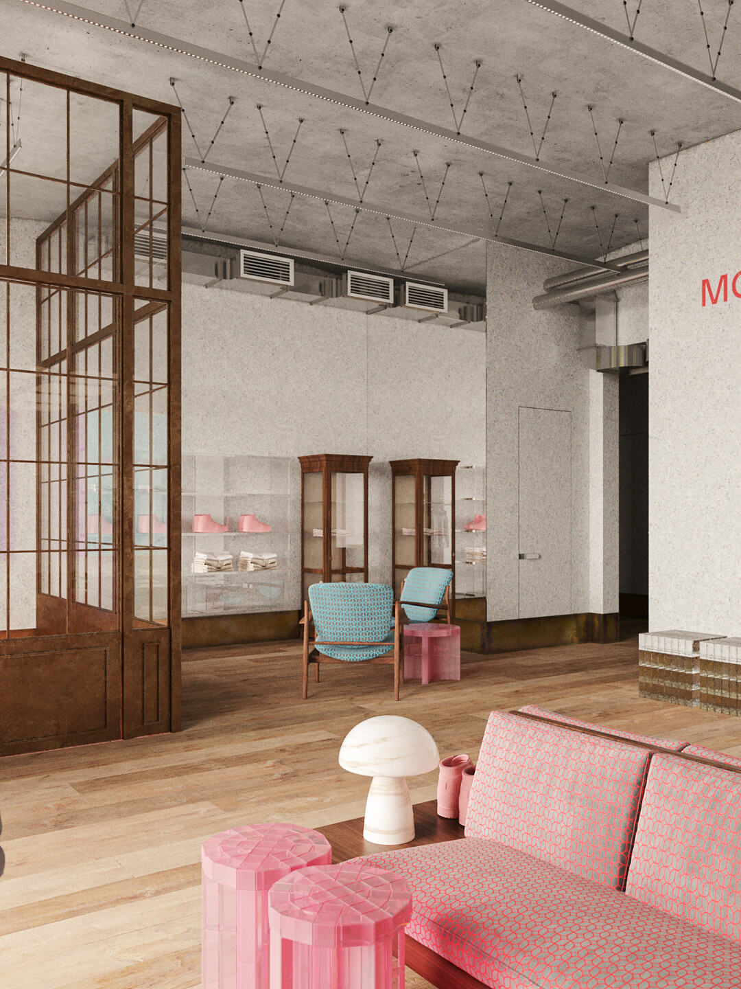 В петербургском магазине Monochrome можно найти все то же, что и в московских. Это знаковые оверсайз-вещи и хиты бренда: рубашки, худи, свитшоты, пуховики, свитеры, пальто. Еще создатели марки обещают лимитированные и эксклюзивные коллекции, а также специальную капсулу для Петербурга. Визуально новый магазин отличается от своих столичных предшественников, он соединил индустриальные элементы, дерево, зону отдыха и знаковый для Monochrome розовый цвет.