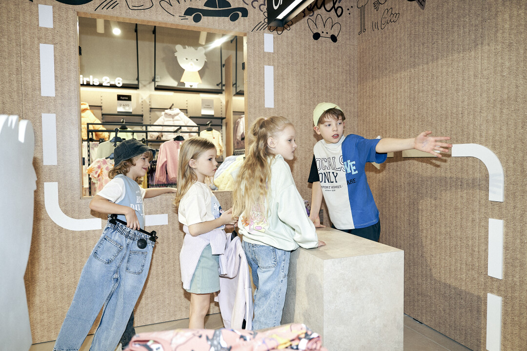 Игровая зона представляет собой перевернутую картонную коробку, внутри которой расположены рейлы, примерочные, касса и тематические локации. За порядок в детском магазине отвечают сотрудники sela, они же помогут детям перевоплотиться в продавца или покупателя и попробовать себя в творческом мерчендайзинге. На кассе можно взять специальную карту — monster card, начислить на нее любую сумму, рассчитаться в игровой кассе и получить подарочный набор наклеек.