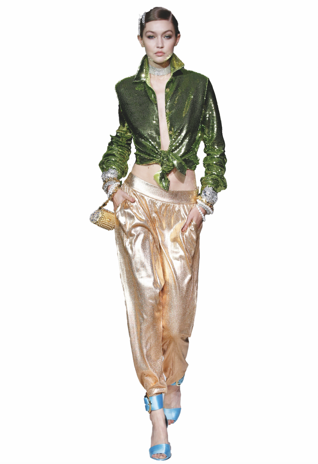 В летней коллекции Tom Ford полностью раскрыта тема «дофаминового» стиля: дизайнер миксует в одном луке ослепительный голубой, коричный и фуксию, делает спортивные брюки из фиолетовых пайеток и изумрудного атласа, а также золотые мини-платья. Так и говорит: чтобы быть ослепительным даже во время совещания по зуму. Еще он вспоминает о своем дебюте в качестве креативного директора дома Gucci, выпустив новую версию легендарного бархатного костюма — суперхита показа 1995 года.