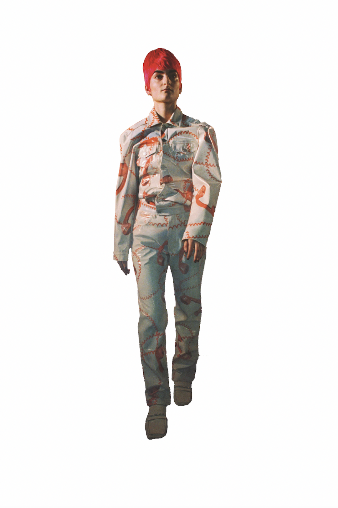 Принт на атласной рубашке и брюках британского бренда Martine Rose — оммаж самому продаваемому в мире в 1982 году постеру: «Поцелуй на расстоянии» иллюстратора Сида Брака превратился в алые провода и телефонные трубки.