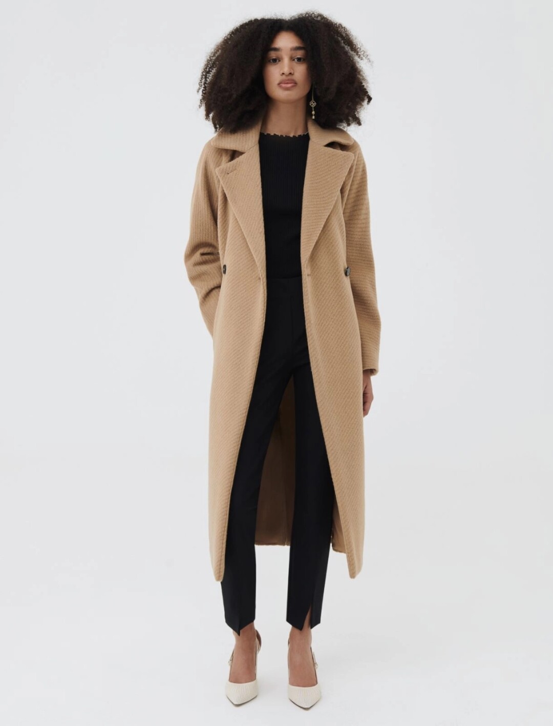 Marella предлагает удлиненные модели и практичные миди из двухслойной ткани, а также шерстяные тренчи, длинные жилеты, пуховики из водоотталкивающего атласа и пальто базовых силуэтов из ткани альпака беби.