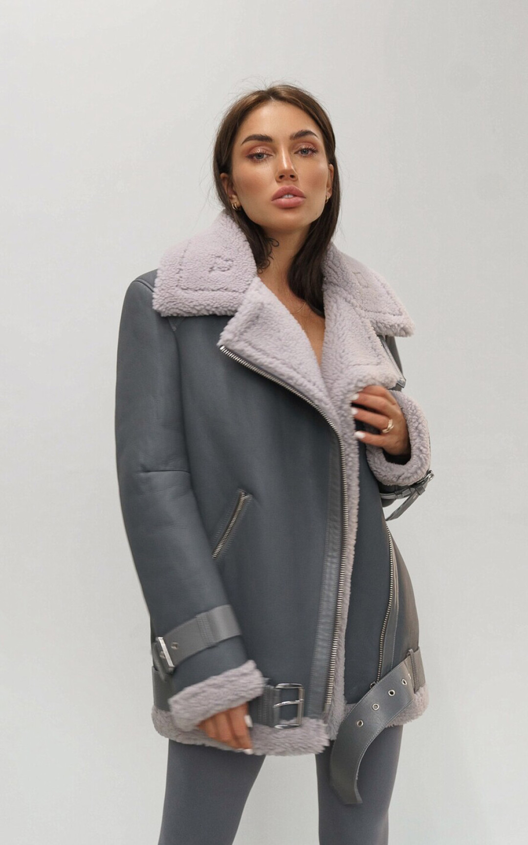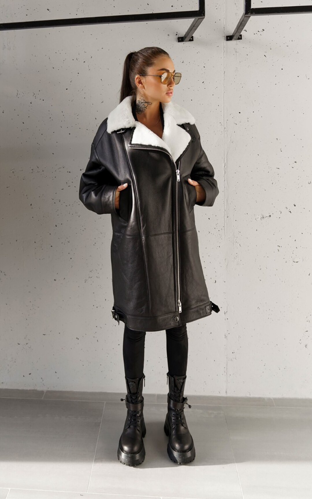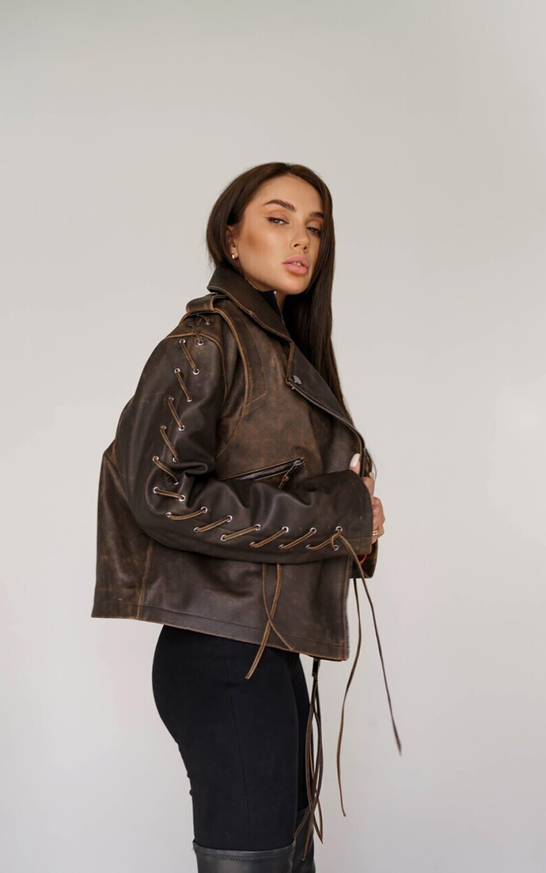 Ключевая вещь в коллекции PURPUR — косуха. Классическая черная не сходит ни с подиумов, ни с красных дорожек, ни с улиц уже десятилетия. Пройдя все витки эволюции, она вписалась и в повседневный, и в вечерний образ и сочетается буквально со всем. У PURPUR она из толстой и мягкой кожи теленка, согревающей в холод и дышащей в теплую погоду — теплообмен идеален. Вообще, косуха была придумана для езды на мотоцикле еще в 1928 году (второй слой кожи внахлест — для защиты от сильного встречного ветра) и за сто лет практически не изменилась. Кнопки на лацканах, молнии на рукавах, регулируемое ремешками прилегание низа — все имеет функциональное назначение, а потому было оценено не только творческими людьми, но и авиаторами и полицейскими. Всплеск популярности косухи случился после фильма «Дикарь» (1953 г.), где роль байкера-бунтаря сыграл Марлон Брандо, с тех пор она стала символом независимости и отваги. Уже несколько лет спустя модные дома стали выпускать свои версии культового предмета одежды. У PURPUR тоже есть вариации на тему — например, оверсайз из белой или шоколадного цвета кожи с эффектом старения со шнуровкой на рукавах.