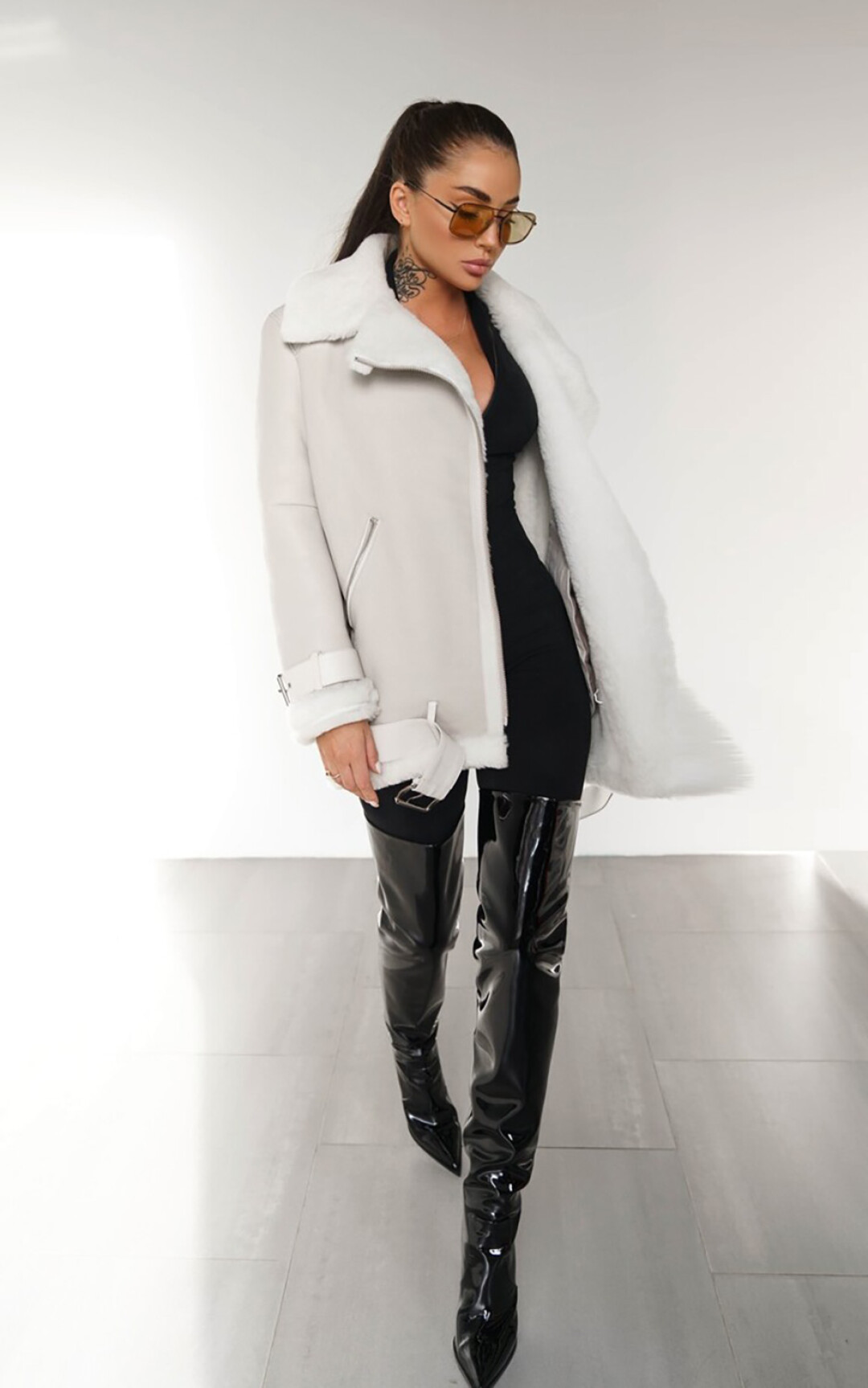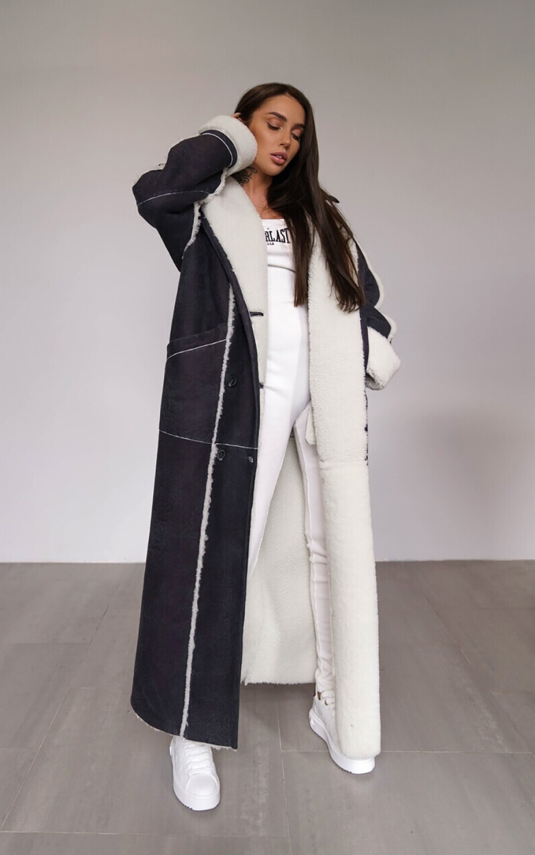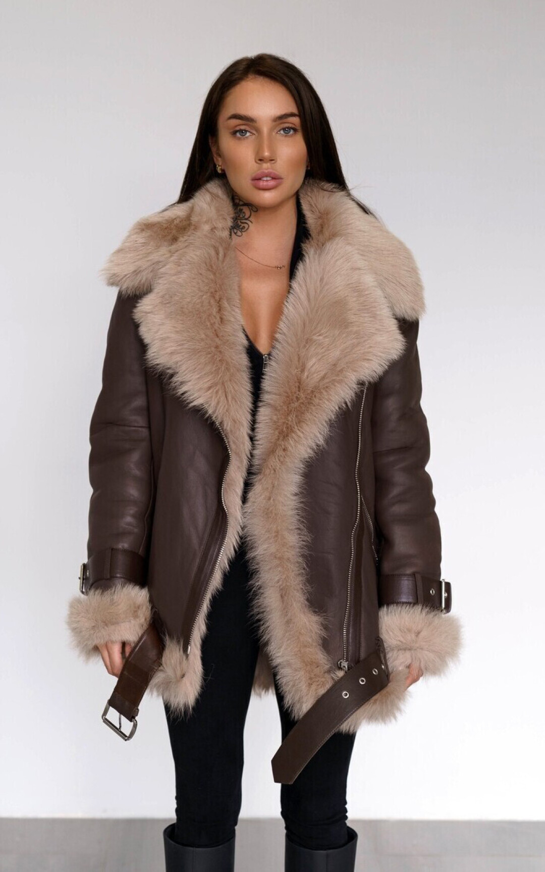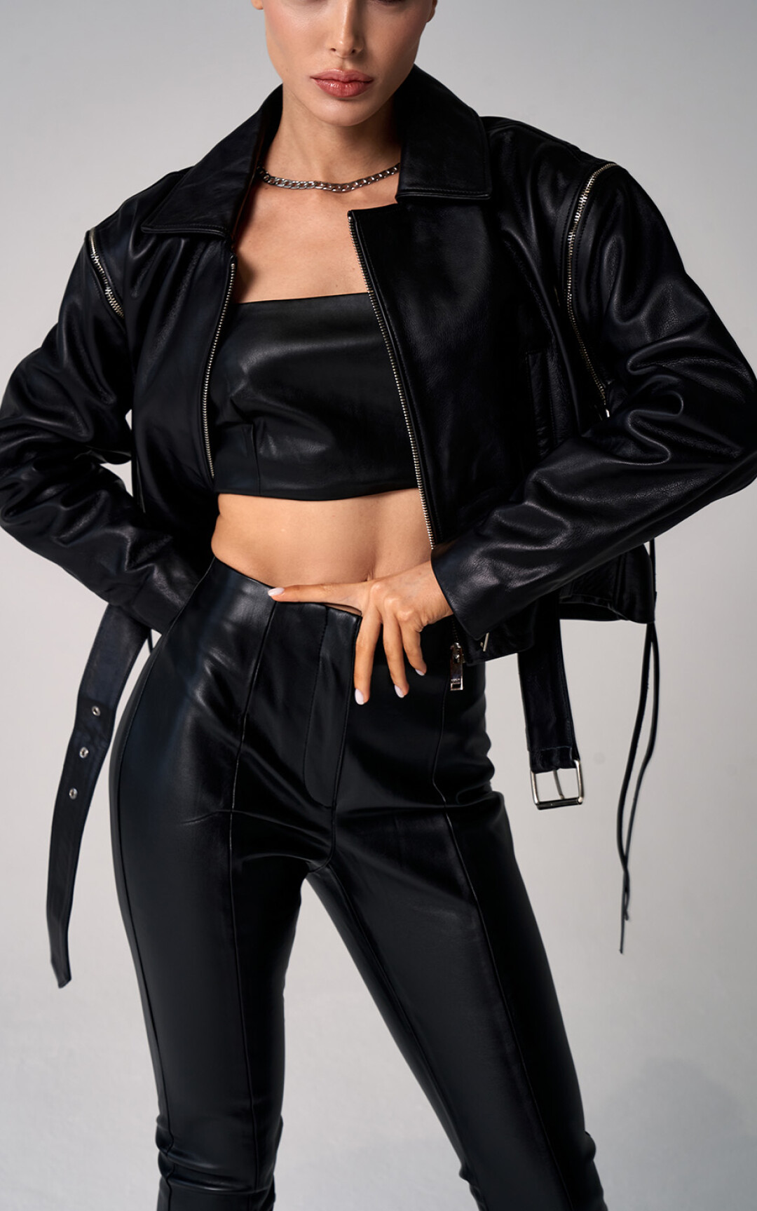 Ключевая вещь в коллекции PURPUR — косуха. Классическая черная не сходит ни с подиумов, ни с красных дорожек, ни с улиц уже десятилетия. Пройдя все витки эволюции, она вписалась и в повседневный, и в вечерний образ и сочетается буквально со всем. У PURPUR она из толстой и мягкой кожи теленка, согревающей в холод и дышащей в теплую погоду — теплообмен идеален. Вообще, косуха была придумана для езды на мотоцикле еще в 1928 году (второй слой кожи внахлест — для защиты от сильного встречного ветра) и за сто лет практически не изменилась. Кнопки на лацканах, молнии на рукавах, регулируемое ремешками прилегание низа — все имеет функциональное назначение, а потому было оценено не только творческими людьми, но и авиаторами и полицейскими. Всплеск популярности косухи случился после фильма «Дикарь» (1953 г.), где роль байкера-бунтаря сыграл Марлон Брандо, с тех пор она стала символом независимости и отваги. Уже несколько лет спустя модные дома стали выпускать свои версии культового предмета одежды. У PURPUR тоже есть вариации на тему — например, оверсайз из белой или шоколадного цвета кожи с эффектом старения со шнуровкой на рукавах.