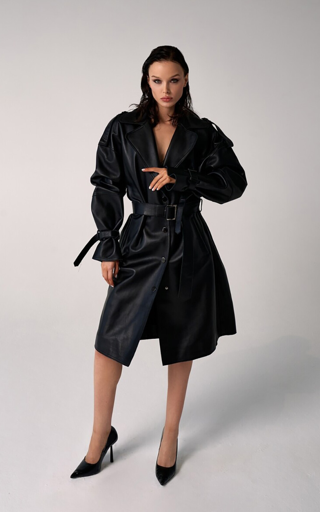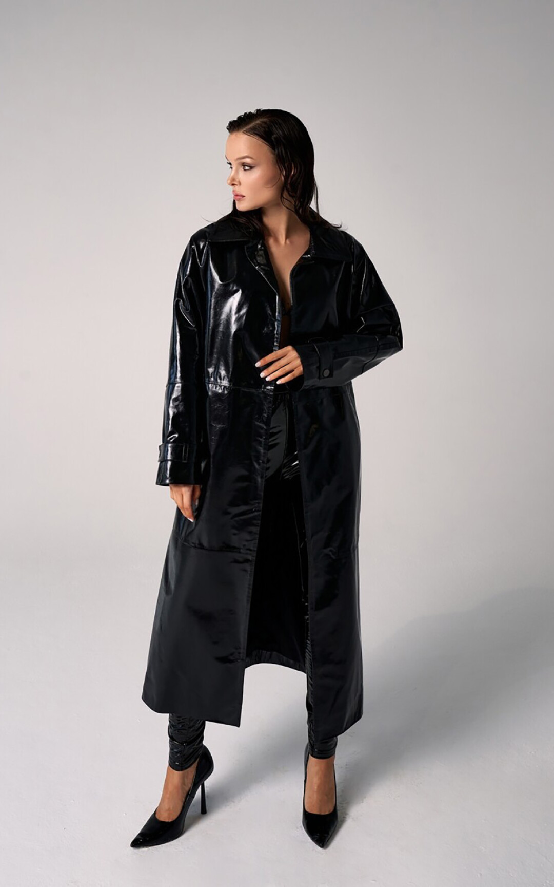 Еще одна культовая вещь в коллекции PURPUR — черный плащ, который переосмыслен и лишен провокационности, как это было во времена фильма «Матрица». Модель макси свободного силуэта из мягкой кожи с лаковым покрытием уютна, как домашний халат, а миди из матовой кожи с объемным верхом и рукавом реглан — отличный пример изящного оверсайза.