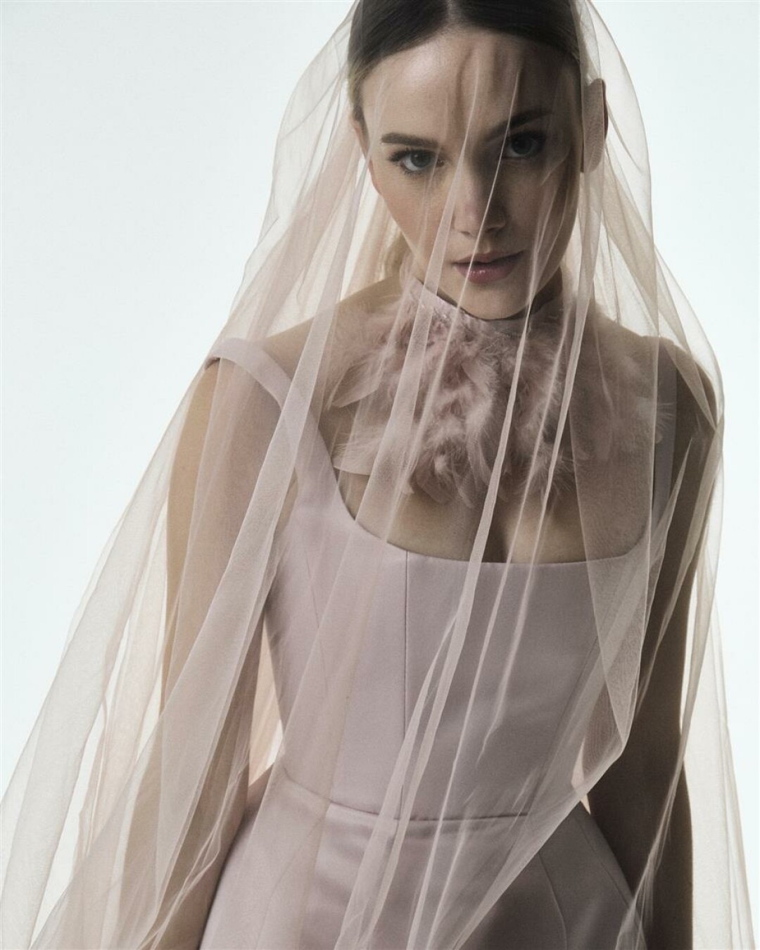 Далеко не всем нравится монохром, и MÚZA Wedding охотно разделяет стремление современных невест к цветовому разнообразию. В числе хедлайнеров новой коллекции — мини-платье сложного розового цвета с розовой длинной фатой и чокером из перьев. Неожиданно? На то и расчет.