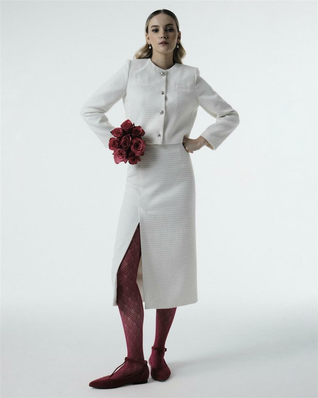 Можно поступить наоборот: остановиться на классическом молочном оттенке, а в качестве полигона для экспериментов выбрать материал. Примером такой стратегии стали твидовые костюмы с юбкой-шортами и брючные костюмы. И нет, в этом нет ни намека на нафталин: каждая невеста из числа тех, кто примерил твидовый костюм с правильными туфлями и стильными аксессуарами, подтвердит: в достойном обрамлении твид выглядит остросовременно.