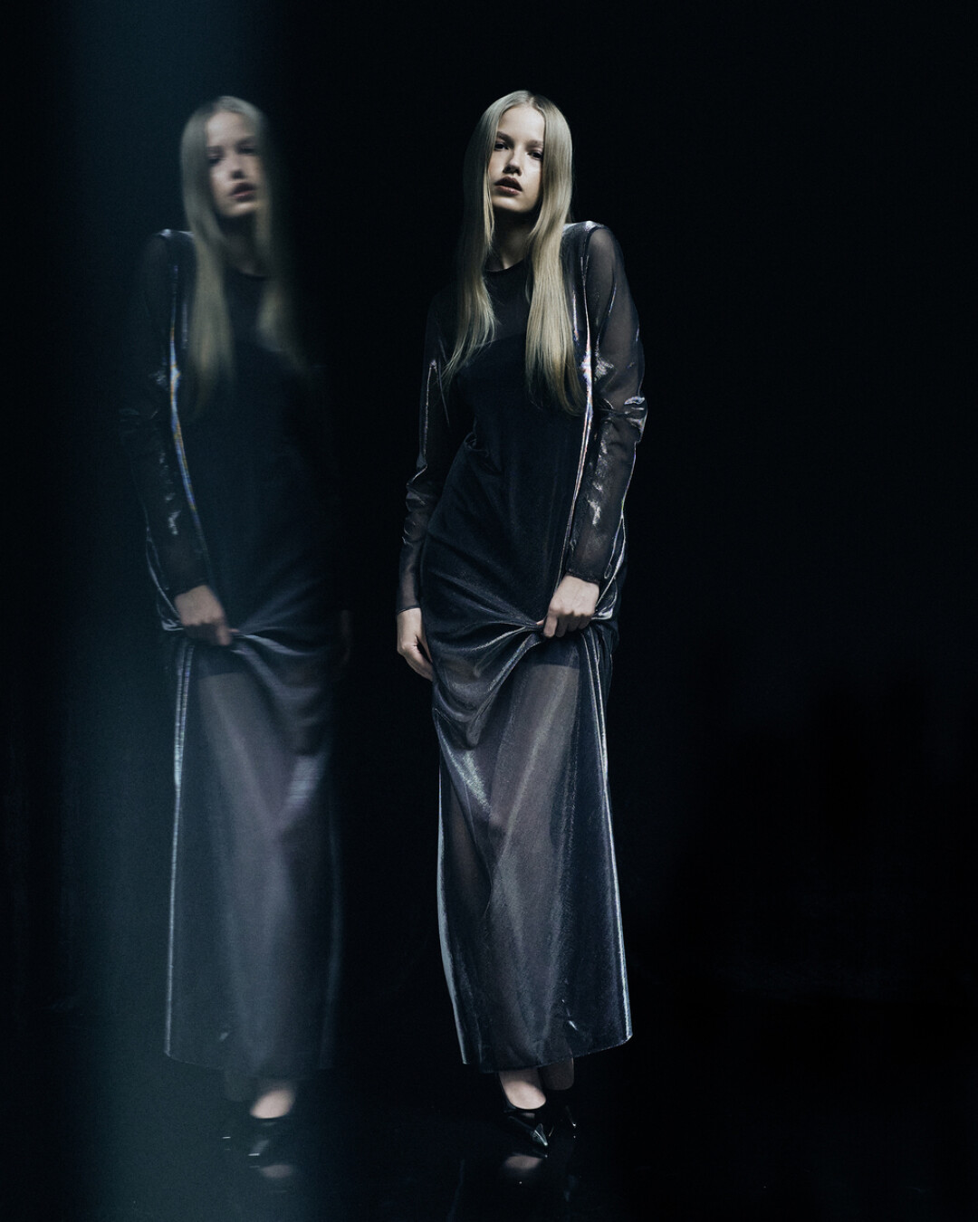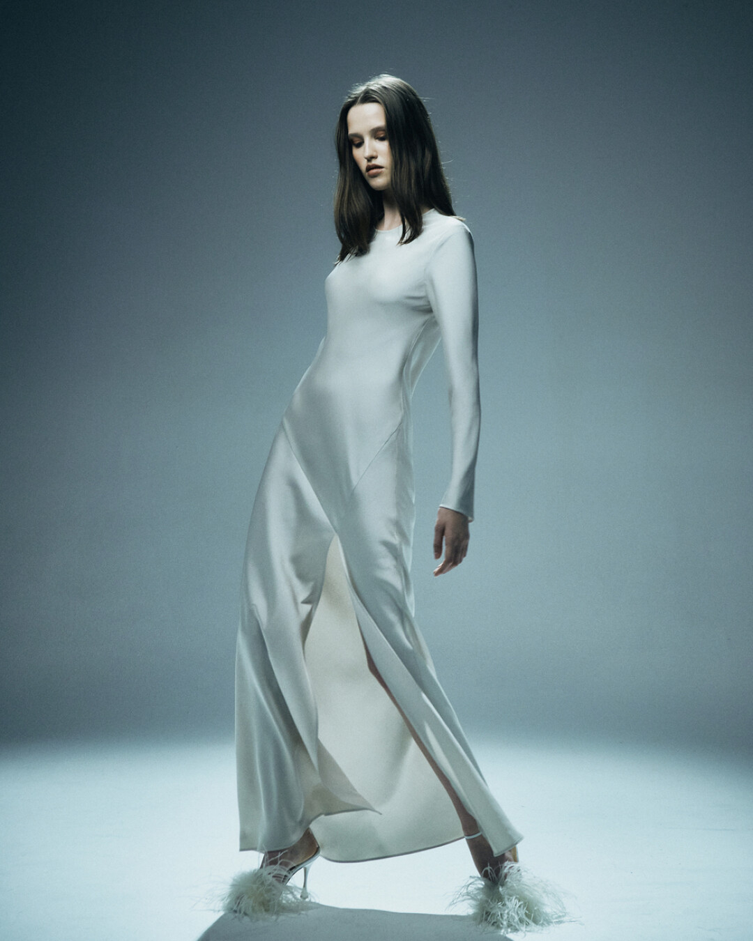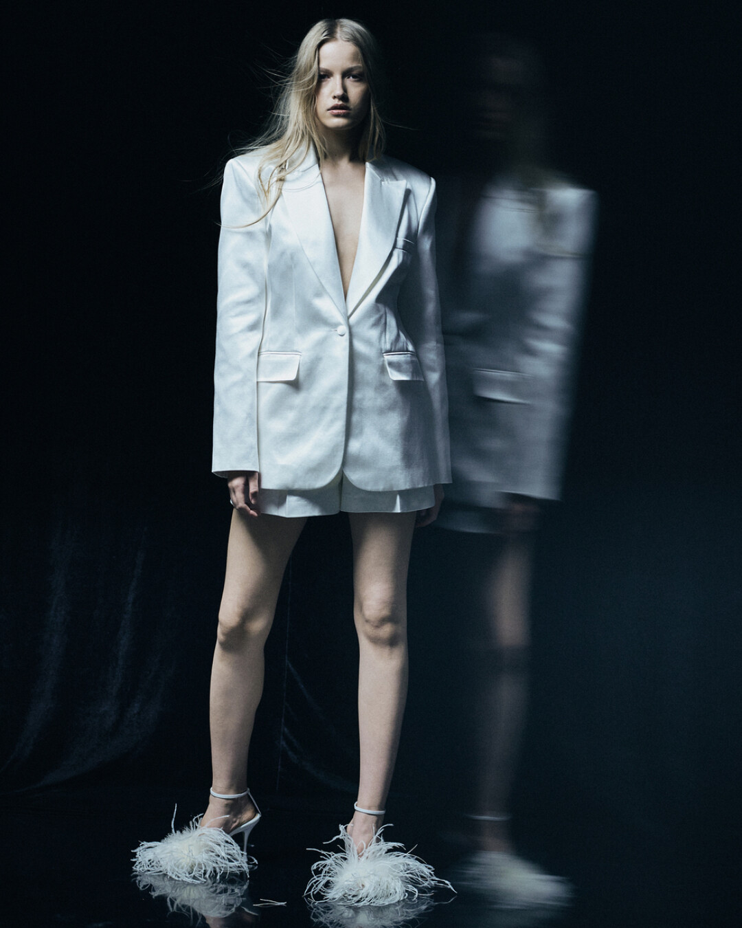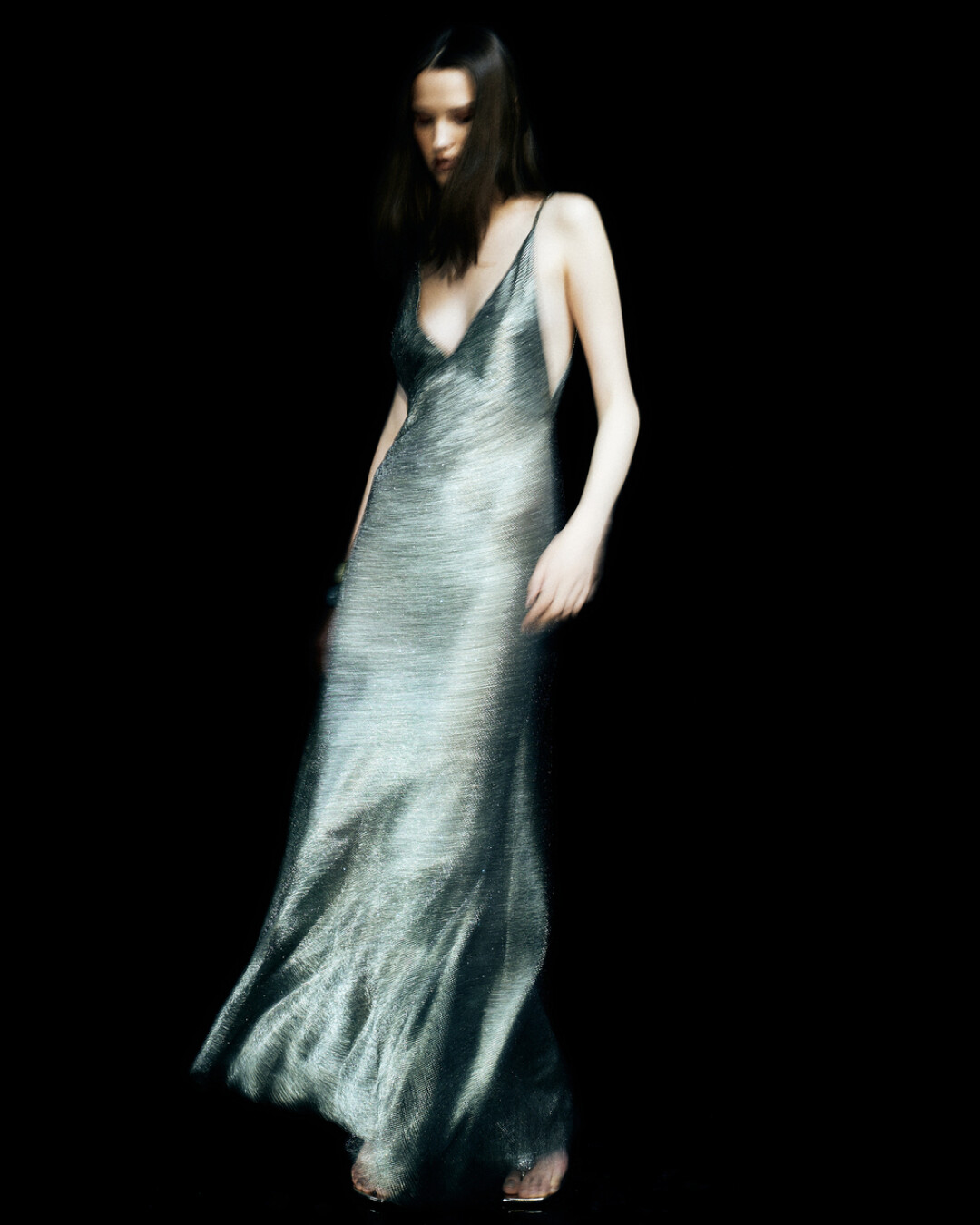 Фирменные для бренда брючные костюмы в коллекции тоже есть, но в более нарядном виде. Смокинги выполнены из лимитированных материалов: мягкого бархата с принтом и итальянского вискозного сатина, создающего эффект лунного сияния. Альтернативой классическим брюкам становятся мини-шорты в тон плечистым полуприталенным жакетам. Фанатов блейзеров ждет по-настоящему особенная модель — из итальянской облегченной шерсти, с открытой спиной. В капсуле также представлены полупрозрачные струящиеся комбинации вроде тех, что в 90-е носила на вечеринки Кейт Мосс, корсетное мини с юбкой-колоколом, которая держит форму за счет хитрой конструкции, платья из материалов, напоминающих расплавленный металл, и блузы с пышными рукавами из матового шелка.