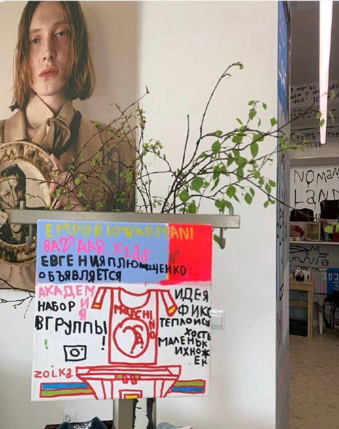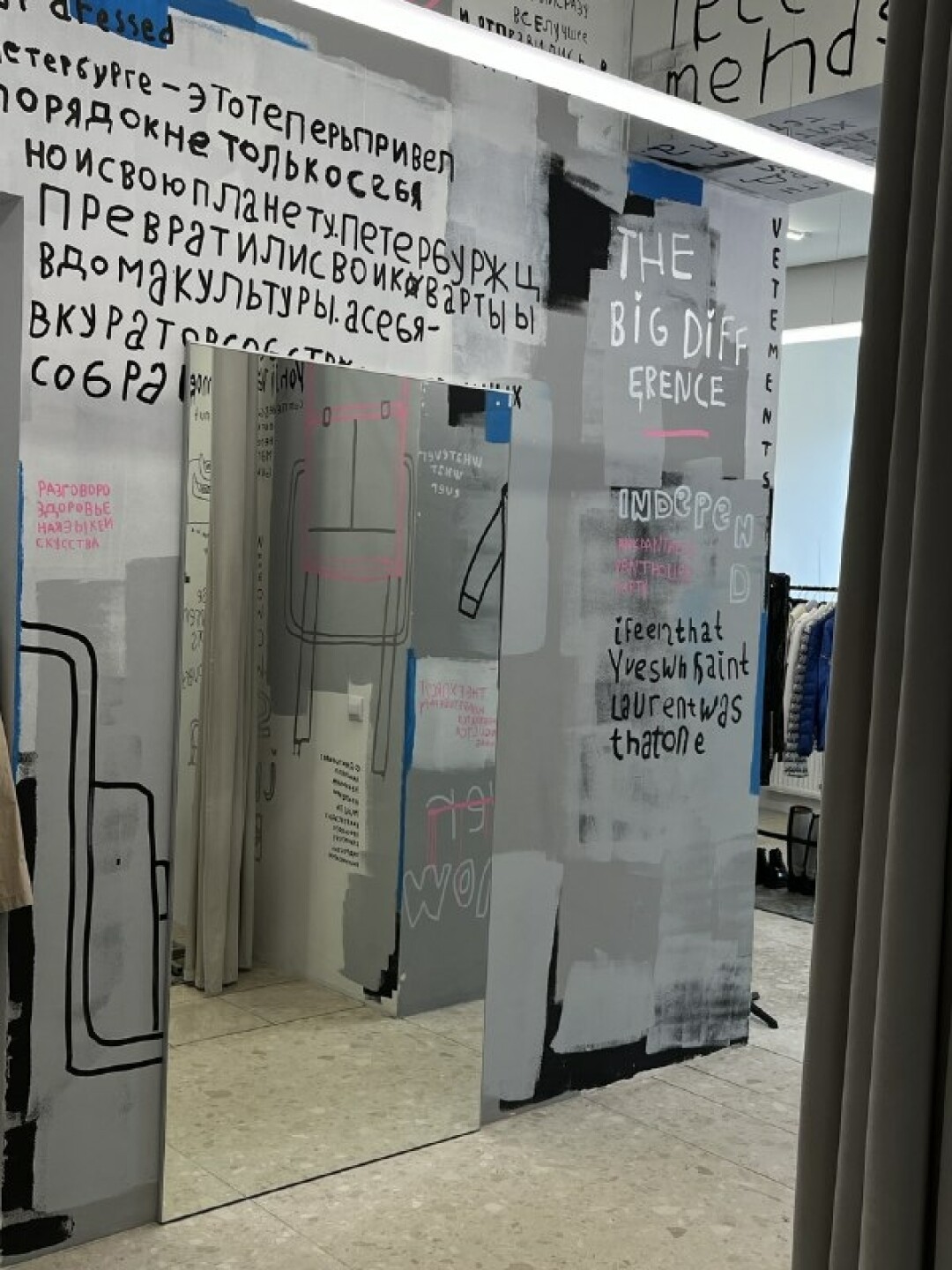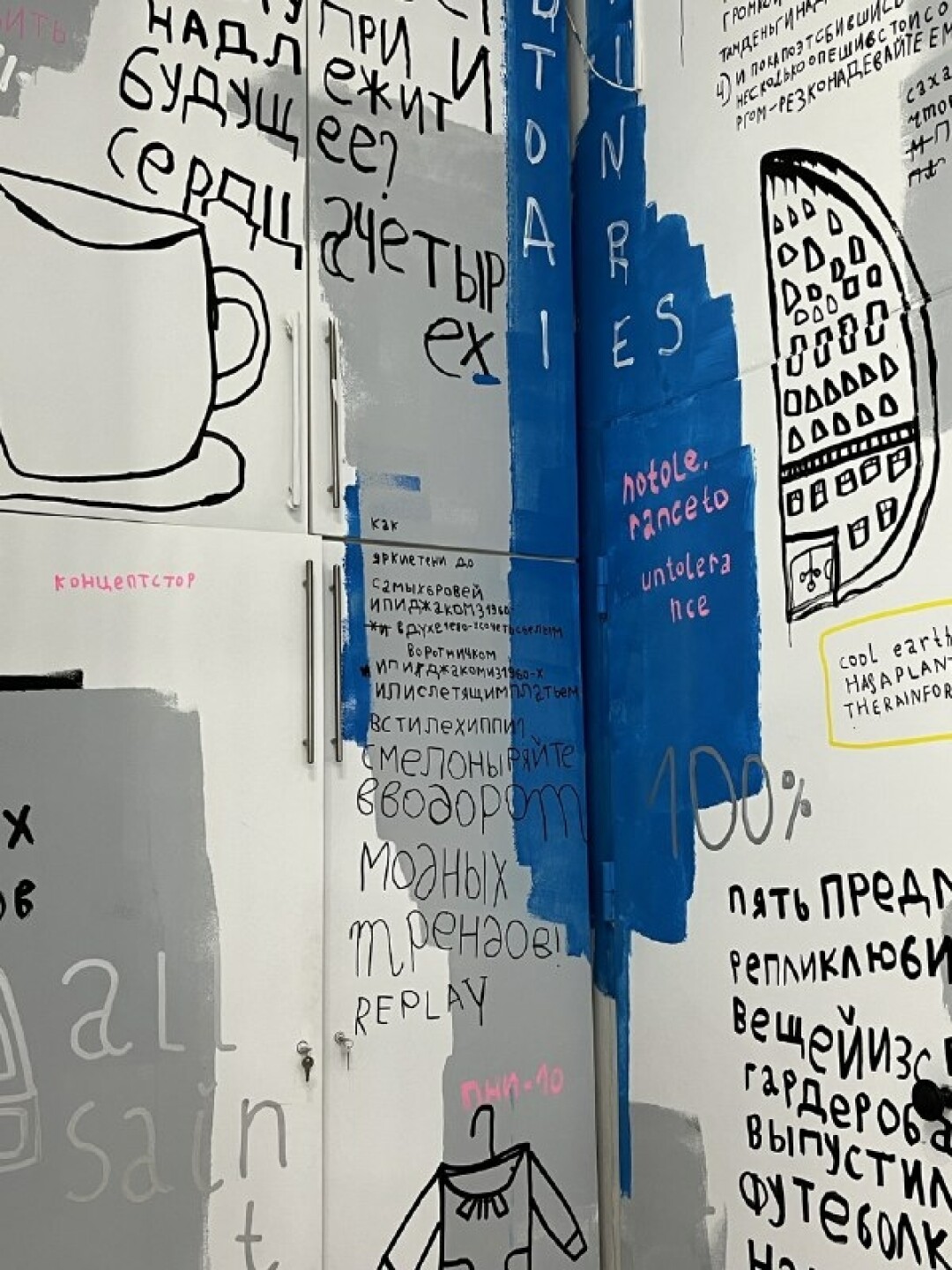 Интерьер – продукт колаборации с проектом «Новые городские художники», кураторы – Стас Багс и Евгений Штиль. Обьединение привлекает творцов с ментальными особенностями личности. Автор настенных росписей – художница ZOIKA. Пространство мыслилось как инсталляция - портал, полностью покрытый текстом. Всю графику она создавала по наитию, по мотивам просмотра архивов супершопа, включающих в себя коллекционные журналы (угадайте, какие).