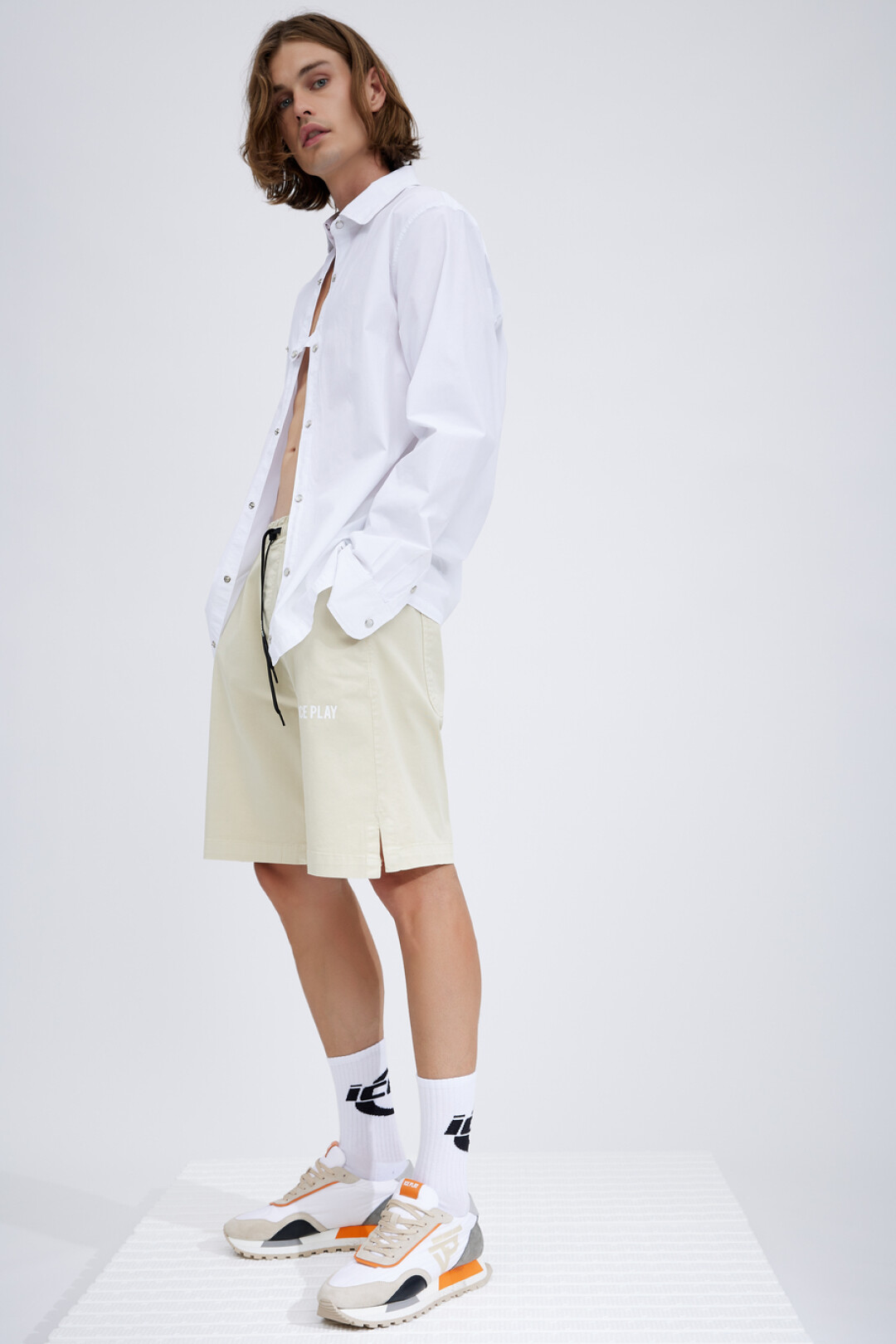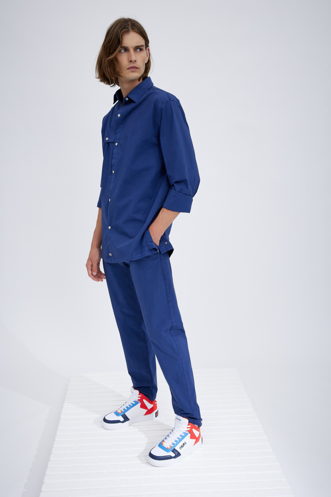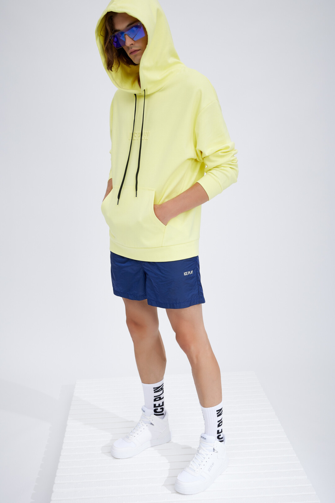 В мужской линейке тоже ни одного скучного решения. Ключевым цветом был выбран темно-синий: он идеален как в более строгих образах, так и в расслабленных, а дополняют его оттенки голубого, лимонного, хаки, песочного и белого. Толстовки, рубашки и шорты с логотипом не только выделяют их владельца из толпы, но и претендуют на статус идеальной летней одежды благодаря комфортному крою и приятным дышащим тканям.