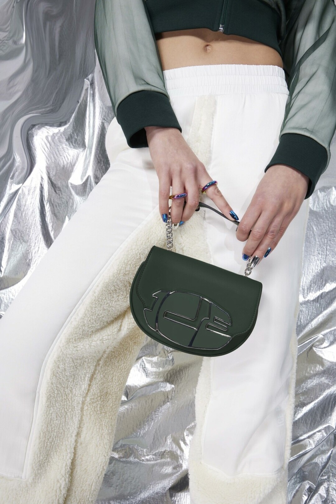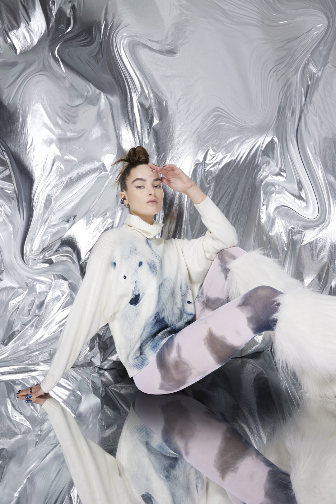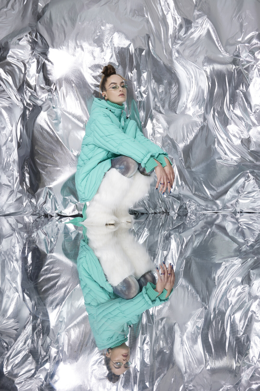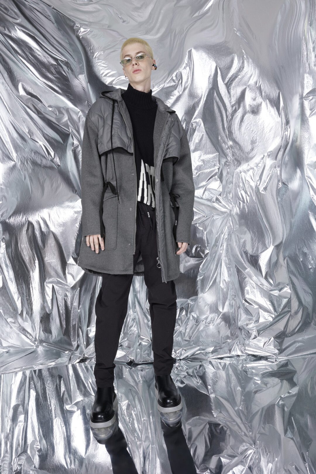 Палитра коллекции вторит краскам северных пейзажей — прохладный серый, голубой, белый, а также всполохи ярких оттенков: розового, мятного и лаймового, напоминающие о северном сиянии. Светоотражающие ткани с эффектом металлик и крупные пайетки подчеркивают игру света и цвета, так что в любом из образов — от повседневного до аутфита для специального случая — вы будете блистать. На примере коллекции осваиваем модную науку и сочетаем их с нейлоном, экоовчиной и шерстью.