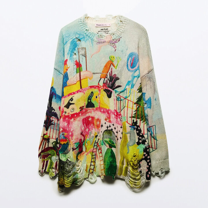 Делают самые хайповые зумерские бэгги-джинсы, оверсайз-худи и бэйби-ти. Поженили фастфэшн и совриск — в арт-линейке Befree Co:Create украшают свитеры картинами топовых петербургских художников: вам свитер с «Казнью сосисочки» Анны Андржиевской (выгуливают на Cosmoscow!), кардиган с «Собранием профсоюза бездельников» Данила Дэге или готические лонгсливы из дарк-графики Александры Гарт?