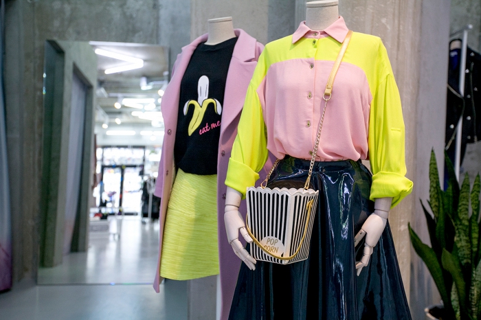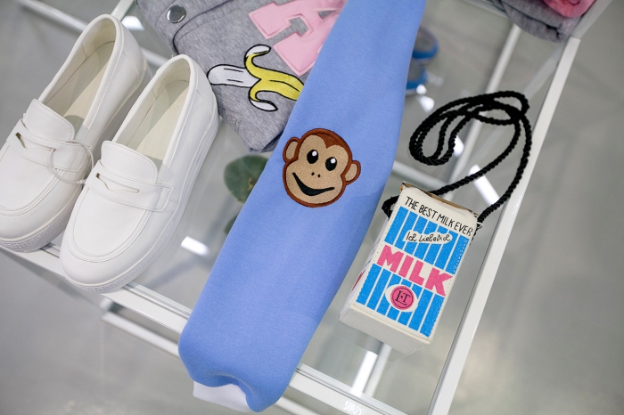 Корнеры в магазине формируются не по маркам, а вперемешку по сезонным трендам: пастельные вещи, кожа, объемные пальто, платья в пол и шубы из разноцветного искусственного меха. Во всей этой мешанине можно найти вещи азиатских брендов, точь-в-точь скопированные с подиумных хитов: например, свитер как у Stella McCartney, который продают за 40 000 рублей, здесь можно купить в 15 раз дешевле, а свитшот как у Acne с надписью You First будет стоить чуть больше 3 000 рублей. В ассортименте также есть ботинки, как у Alexander Wang, и «молочный пакетик», как у Chanel. По словам байеров, корейские дизайнеры просто ориентируются на европейских, но не копируют их.