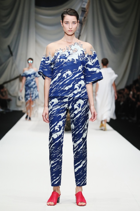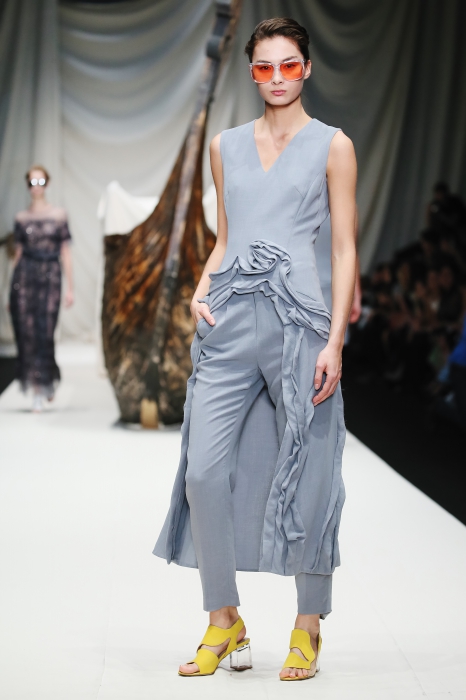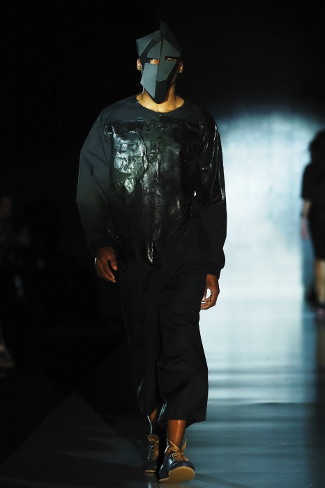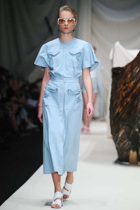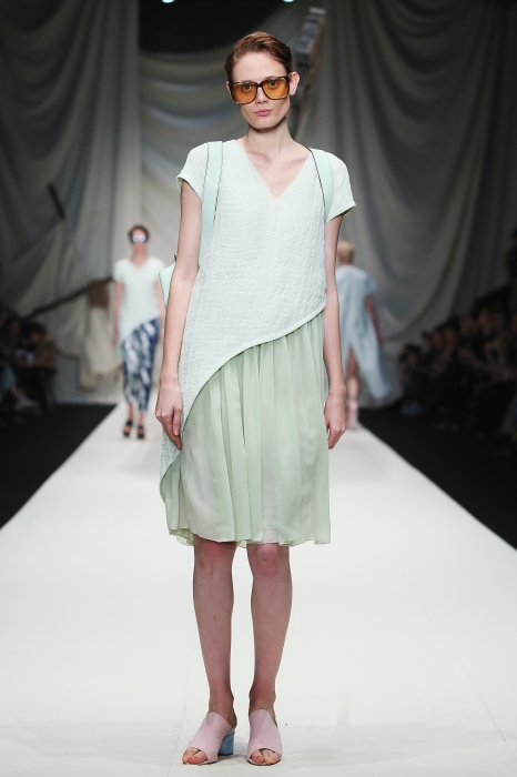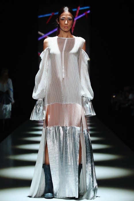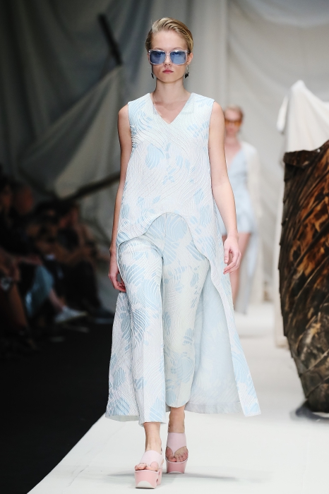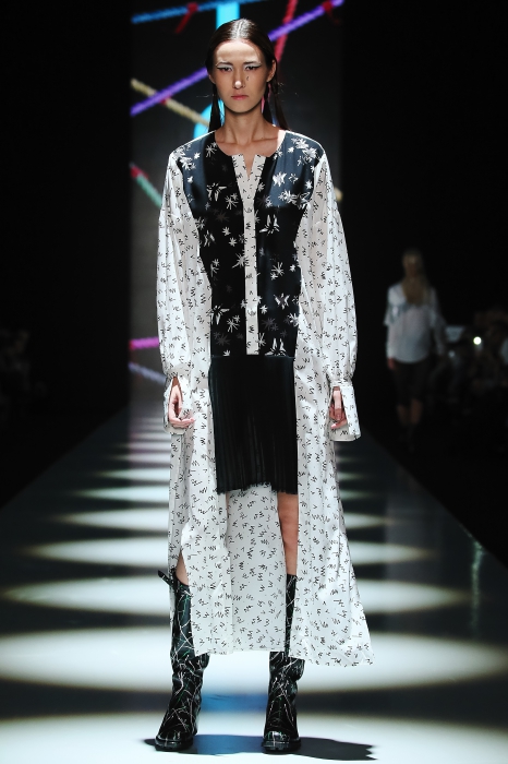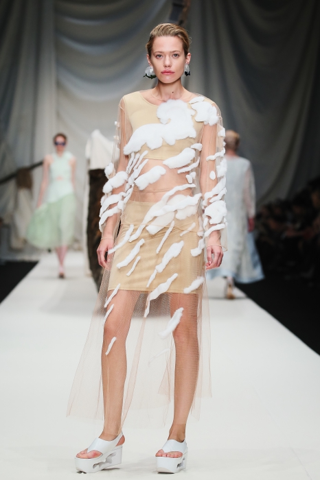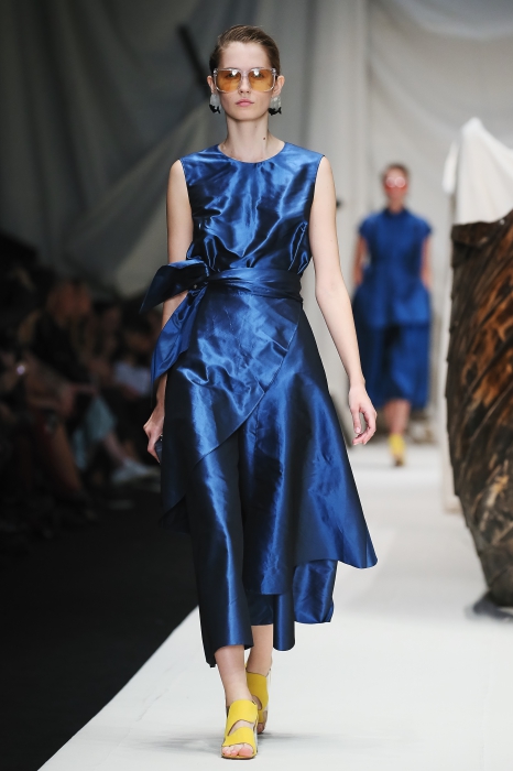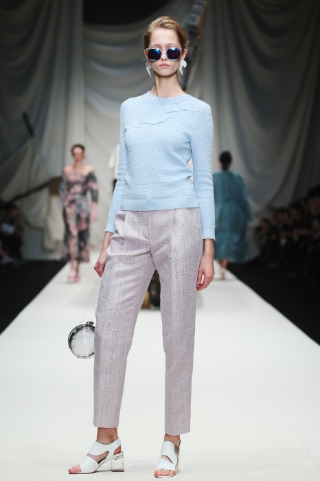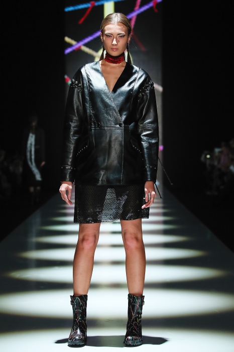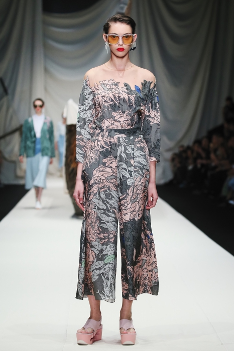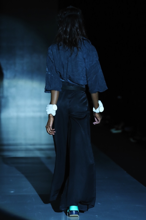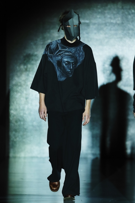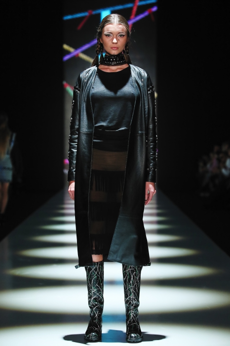 Уже второй сезон подряд молодой дизайнер Юра Питенин выбирает для показа своей новой коллекции не родной Петербург, а Москву. Напомним, юношеские годы дизайнер провел в Японии, поэтому в его работах всегда чувствуется синтез западной и восточной традиций. В новой коллекции за Saint отвечали летящие платья с принтами, юбки в пайетках, блузы с блестящей бахромой и прозрачные ткани, за Tokyo — тканевые перехваты крест-накрест, узлы на топах в духе японской техники связывания сибари, кожаные жакеты и цветовая гамма. Также в подиумной коллекции Юры впервые появились и мужские образы — пока это футболки с принтами, брюки и отличный стайлинг вещей (взять хотя бы сочетание «треников» с казаками).
