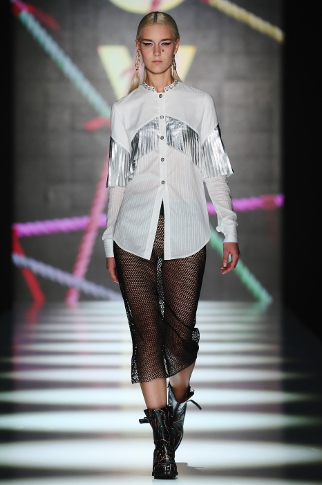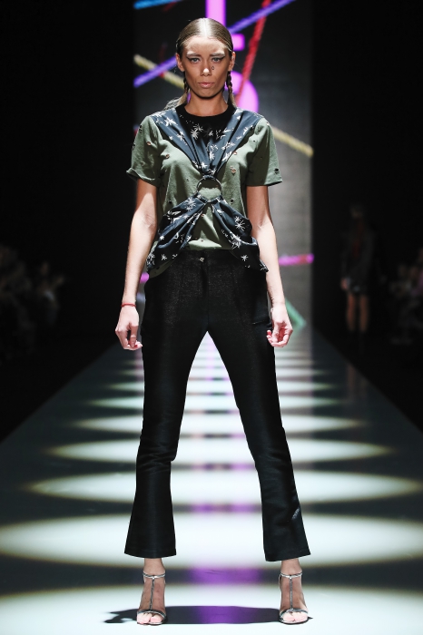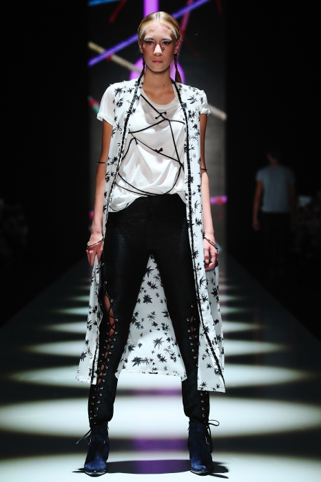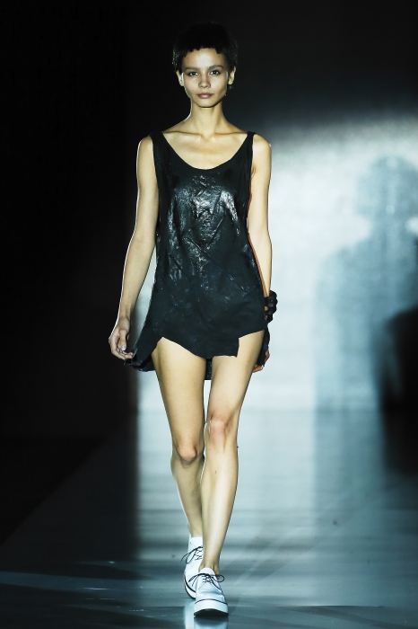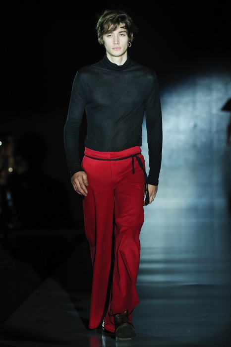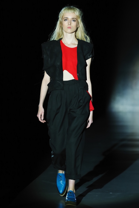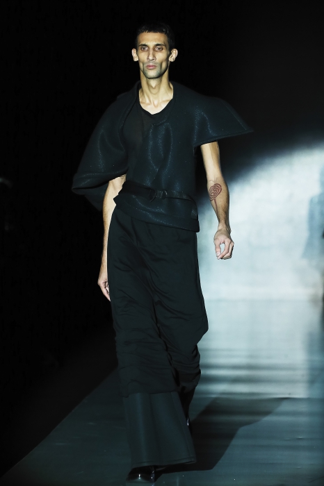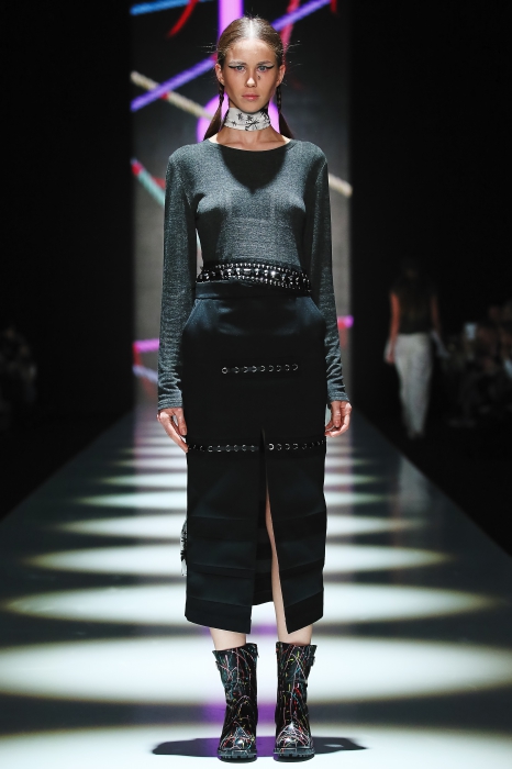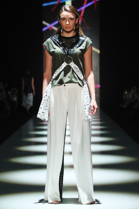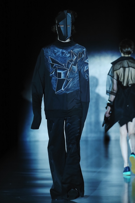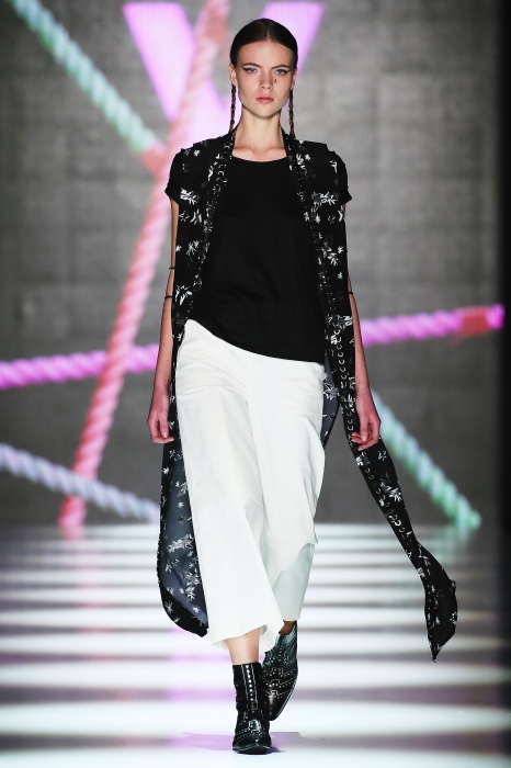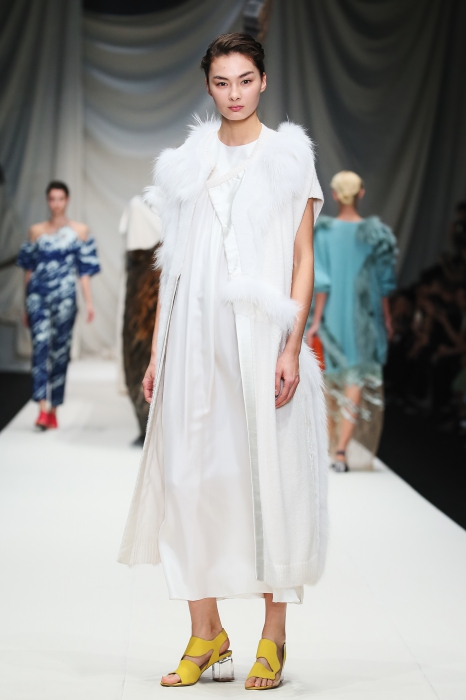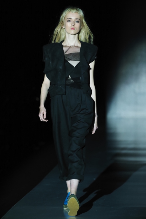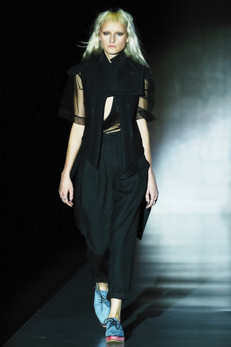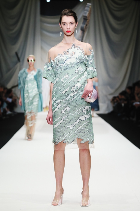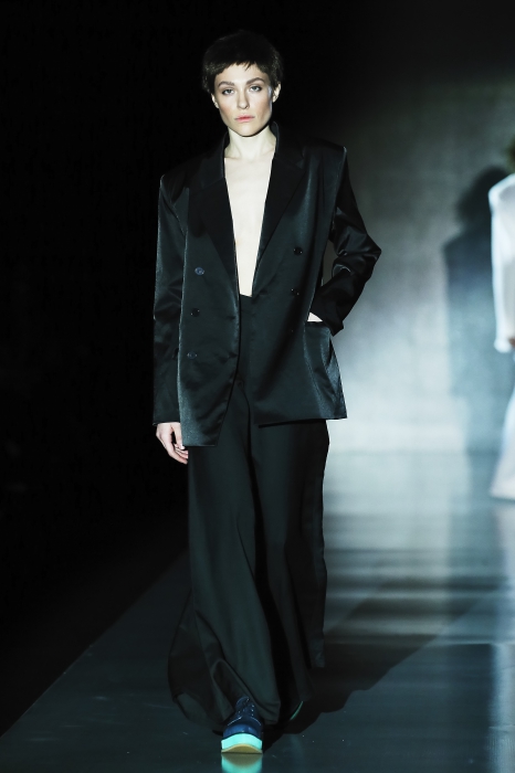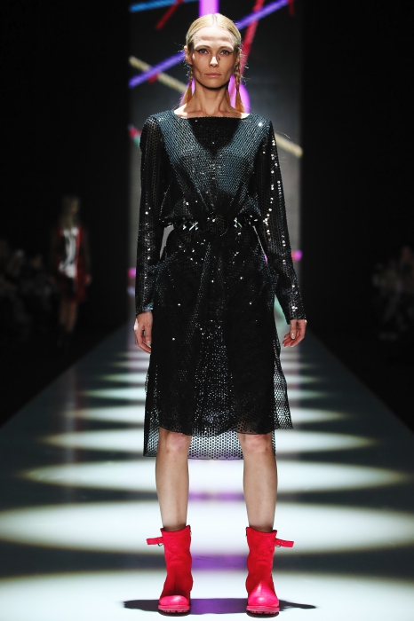 Уже второй сезон подряд молодой дизайнер Юра Питенин выбирает для показа своей новой коллекции не родной Петербург, а Москву. Напомним, юношеские годы дизайнер провел в Японии, поэтому в его работах всегда чувствуется синтез западной и восточной традиций. В новой коллекции за Saint отвечали летящие платья с принтами, юбки в пайетках, блузы с блестящей бахромой и прозрачные ткани, за Tokyo — тканевые перехваты крест-накрест, узлы на топах в духе японской техники связывания сибари, кожаные жакеты и цветовая гамма. Также в подиумной коллекции Юры впервые появились и мужские образы — пока это футболки с принтами, брюки и отличный стайлинг вещей (взять хотя бы сочетание «треников» с казаками).