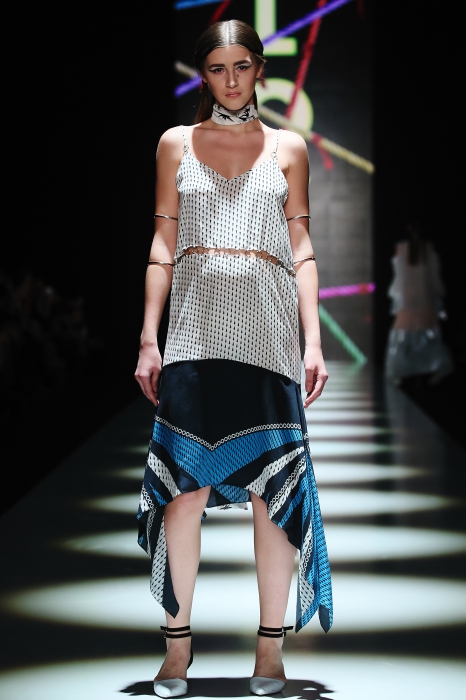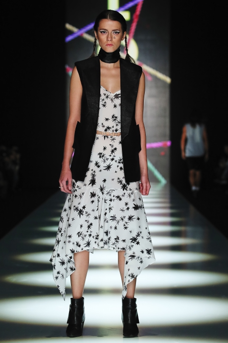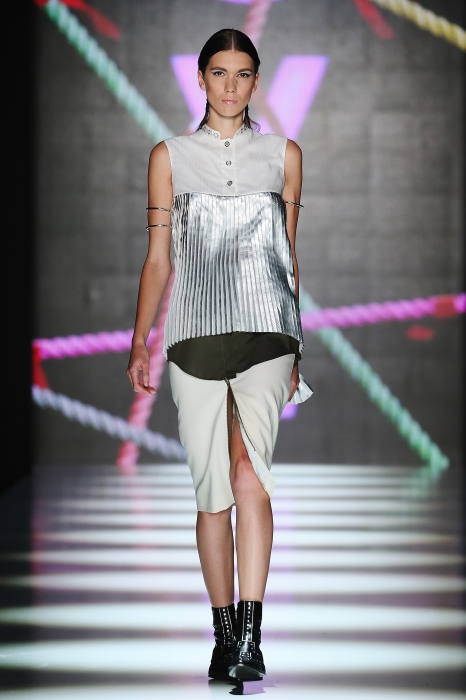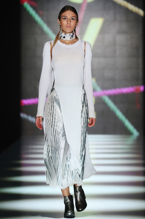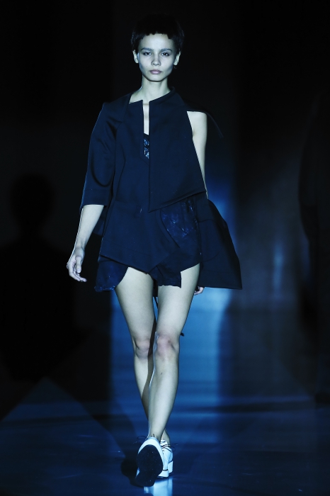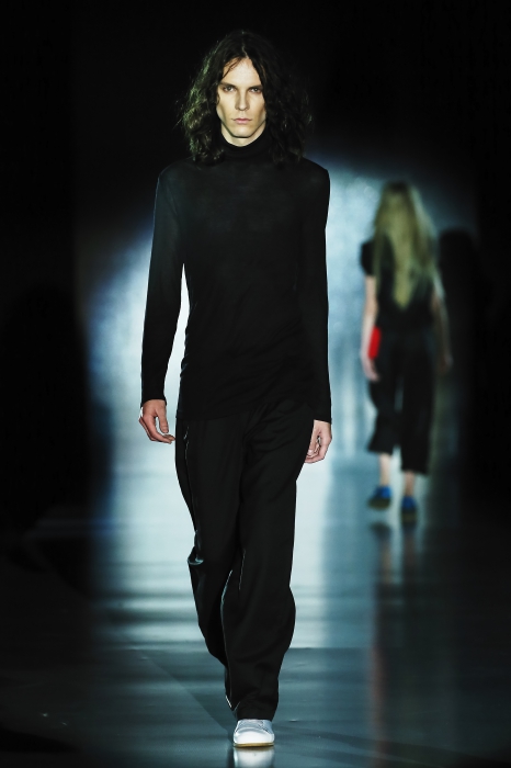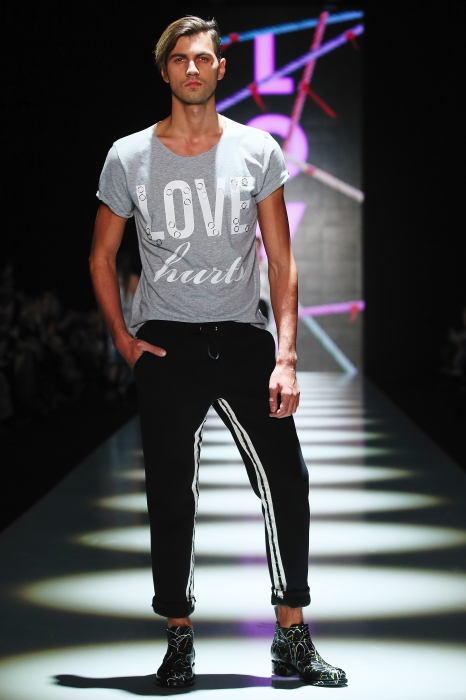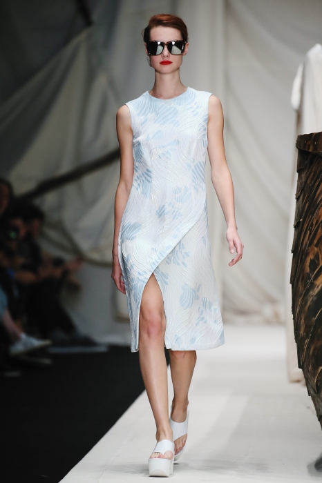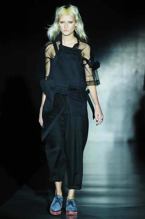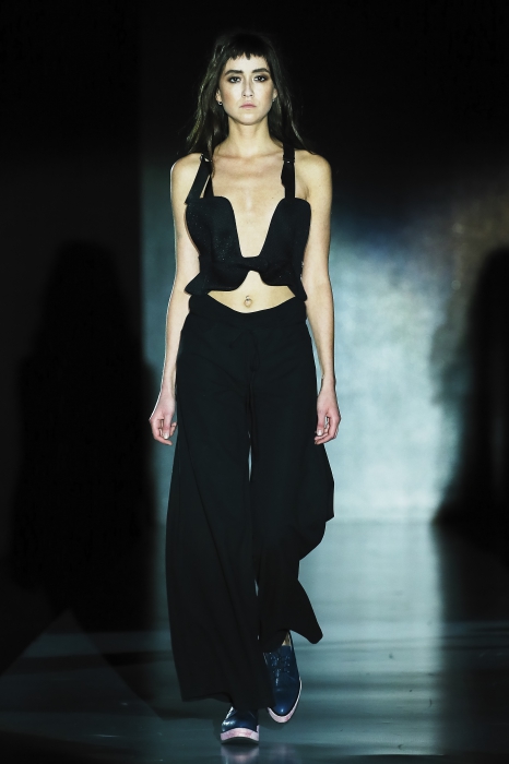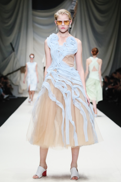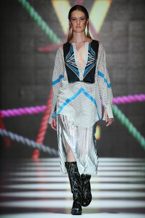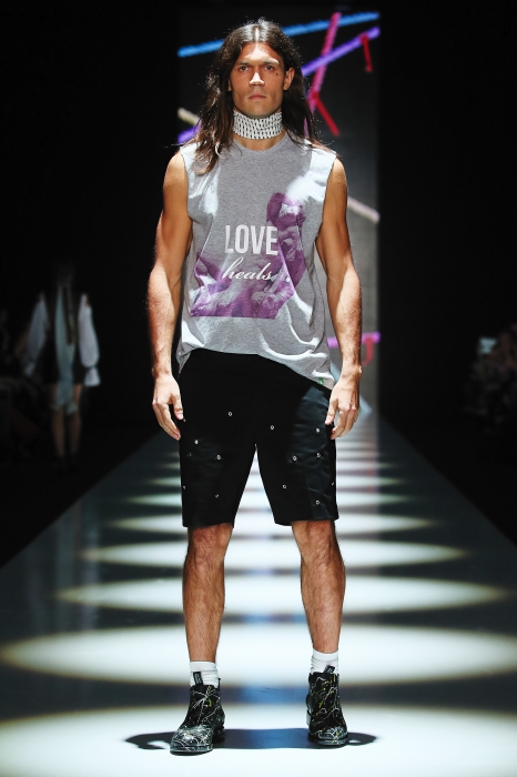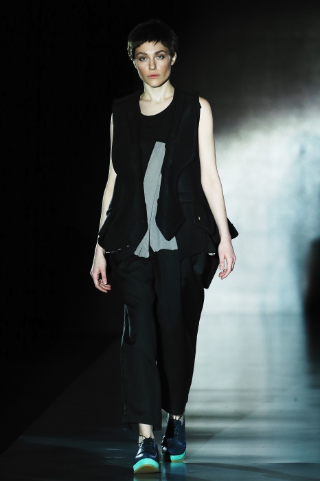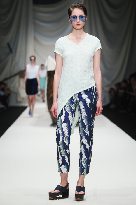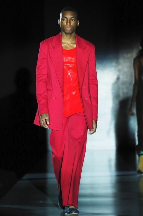 Уже второй сезон подряд молодой дизайнер Юра Питенин выбирает для показа своей новой коллекции не родной Петербург, а Москву. Напомним, юношеские годы дизайнер провел в Японии, поэтому в его работах всегда чувствуется синтез западной и восточной традиций. В новой коллекции за Saint отвечали летящие платья с принтами, юбки в пайетках, блузы с блестящей бахромой и прозрачные ткани, за Tokyo — тканевые перехваты крест-накрест, узлы на топах в духе японской техники связывания сибари, кожаные жакеты и цветовая гамма. Также в подиумной коллекции Юры впервые появились и мужские образы — пока это футболки с принтами, брюки и отличный стайлинг вещей (взять хотя бы сочетание «треников» с казаками).