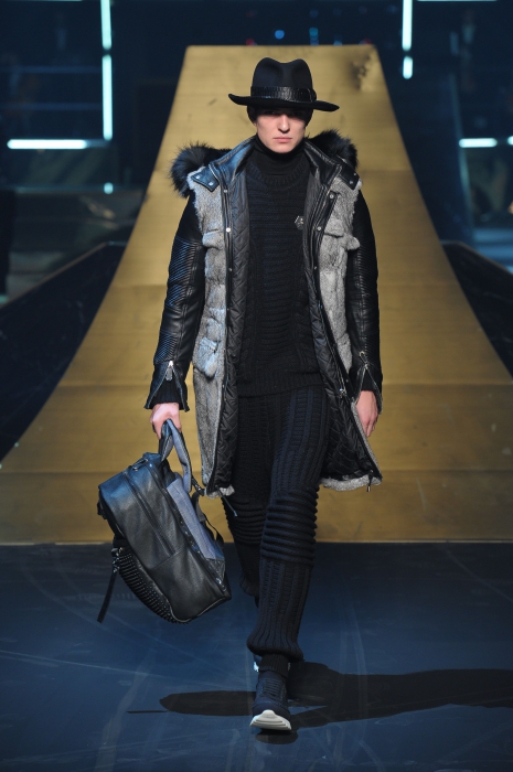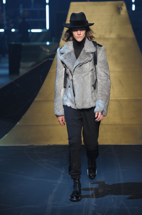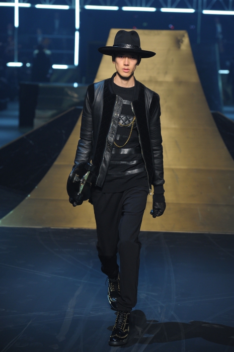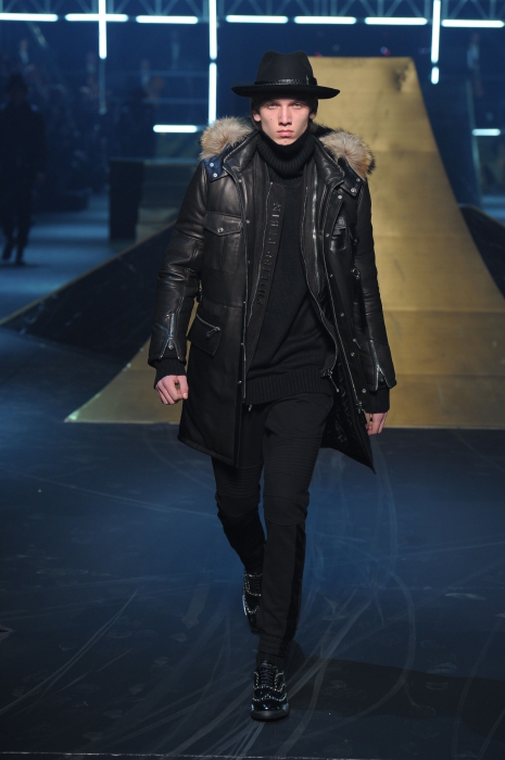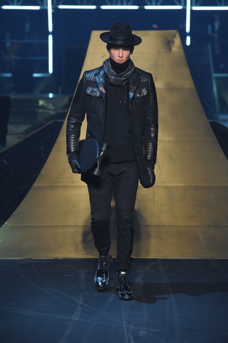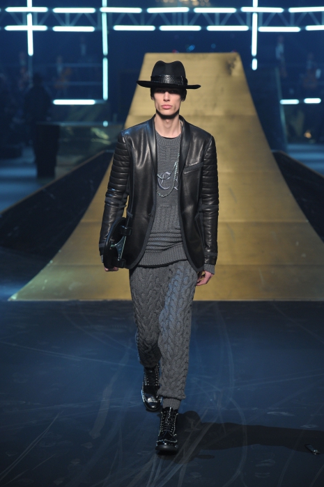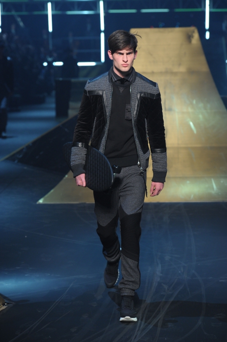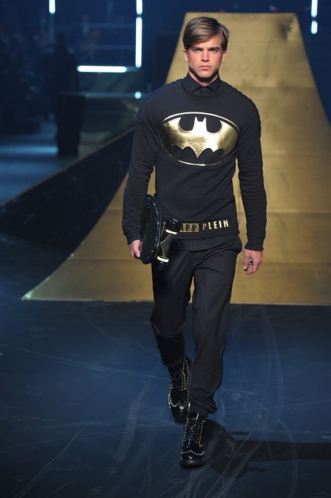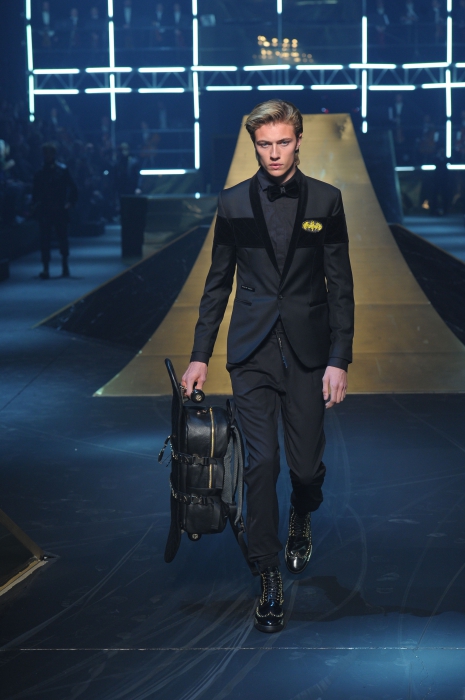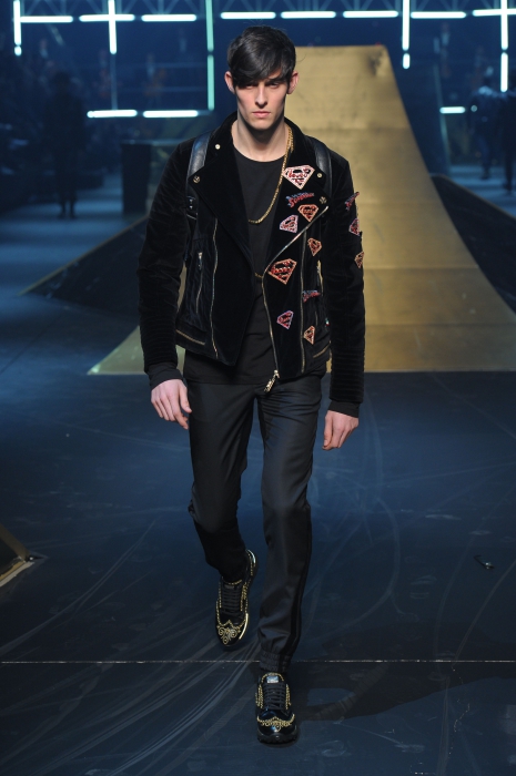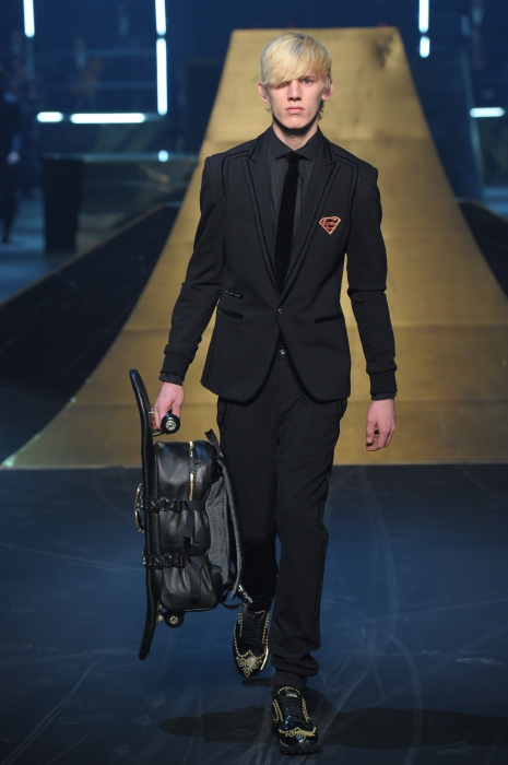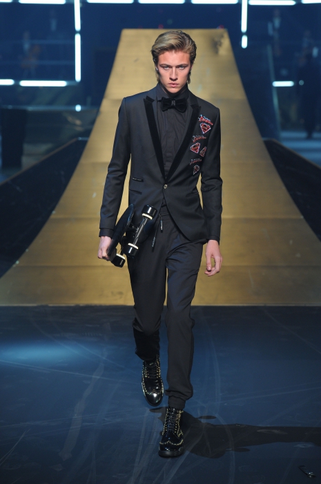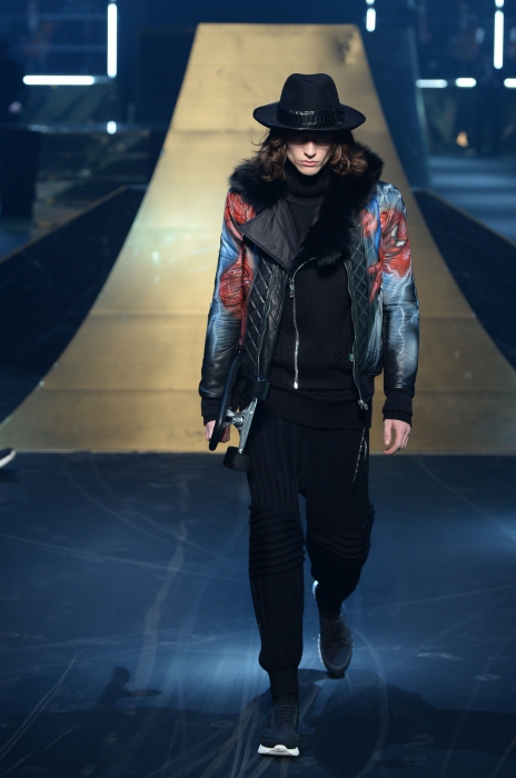 Коллекция выполнена преимущественно в черной гамме. Основные вещи — брюки из трикотжа с кожаными вставками, пиджаки, декорированные бархатом, пальто с мехом лисы и бомберы с рисунками Бэтмена и Человека-Паука. В аксессуарной линии — цепочки, позолоченные наушники, шляпы с широкими полями, рюкзаки и скейтборды со вставками из питоновой кожи.