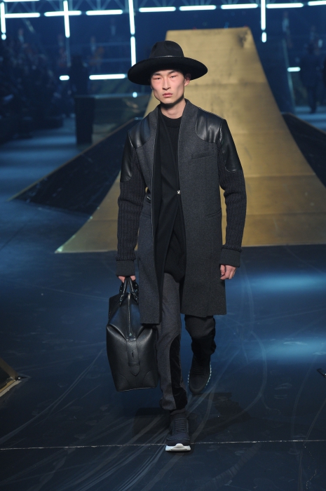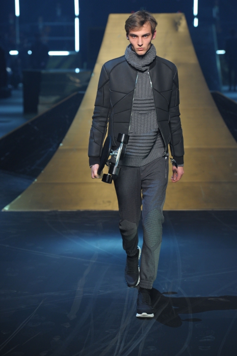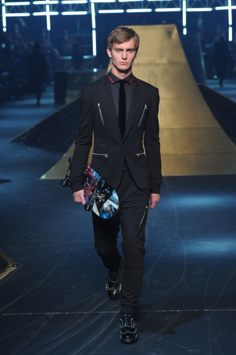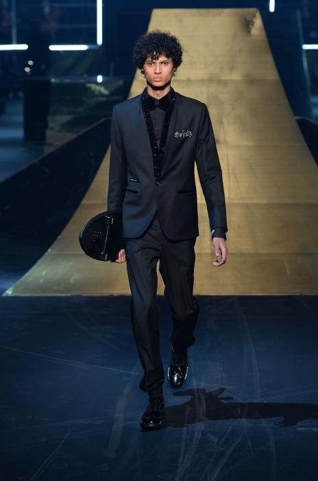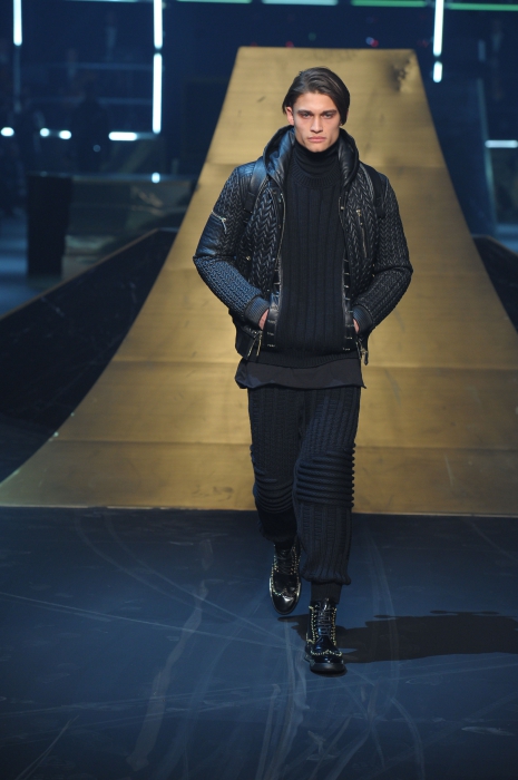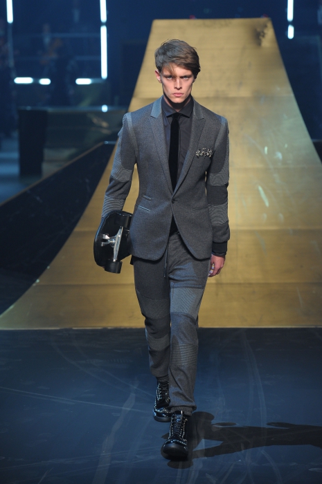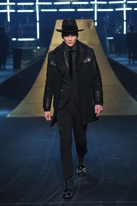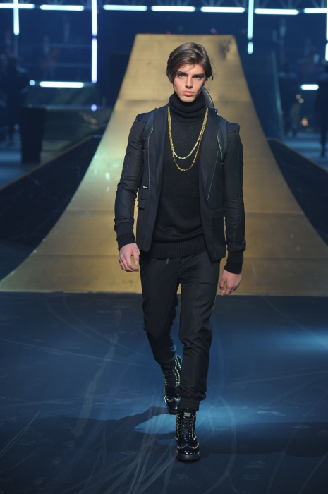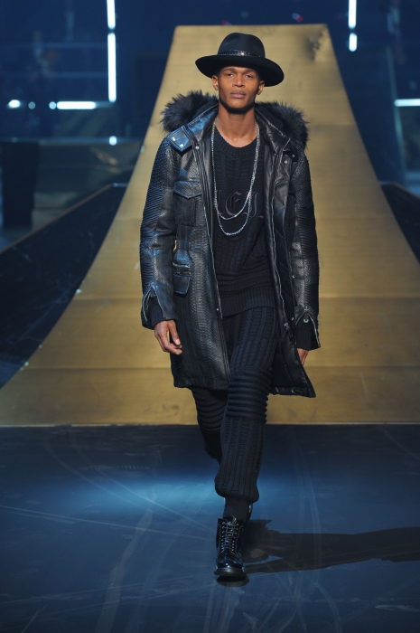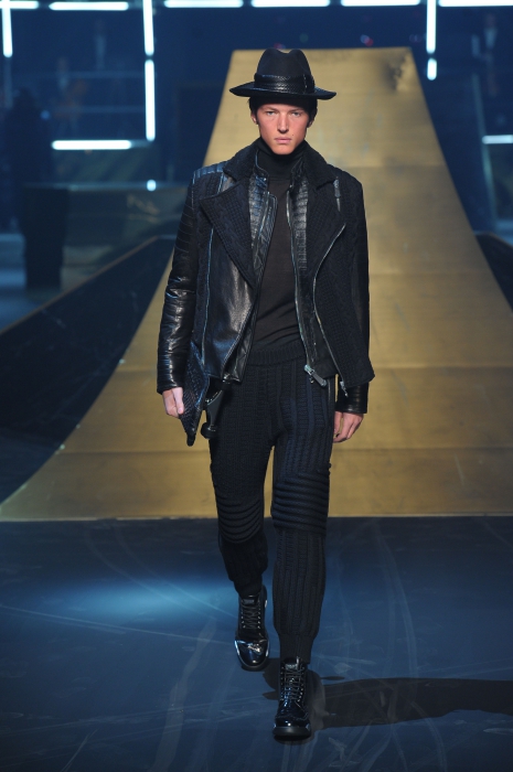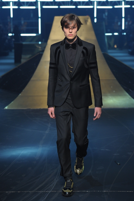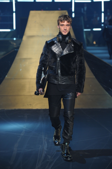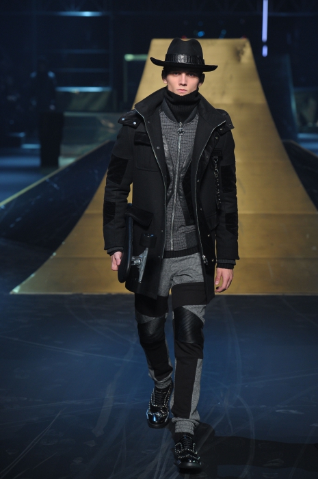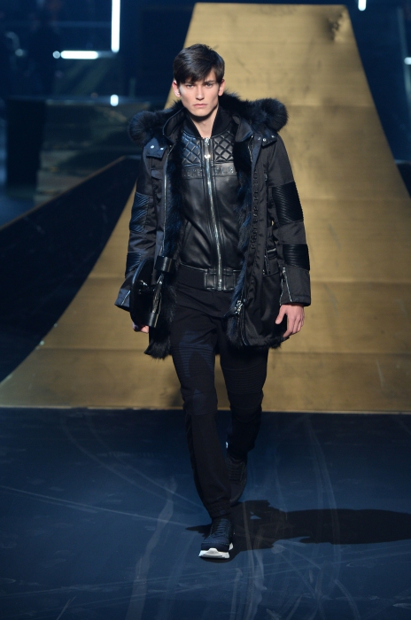 Коллекция выполнена преимущественно в черной гамме. Основные вещи — брюки из трикотжа с кожаными вставками, пиджаки, декорированные бархатом, пальто с мехом лисы и бомберы с рисунками Бэтмена и Человека-Паука. В аксессуарной линии — цепочки, позолоченные наушники, шляпы с широкими полями, рюкзаки и скейтборды со вставками из питоновой кожи.