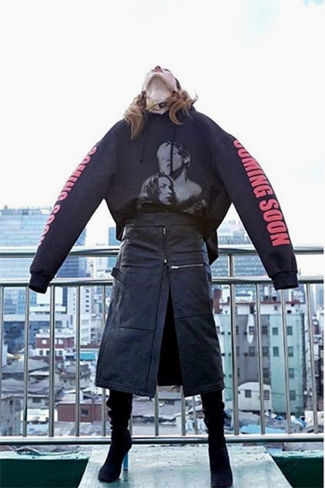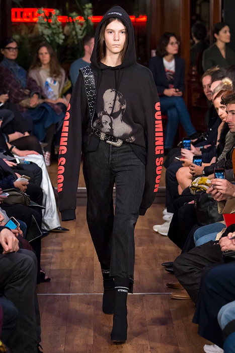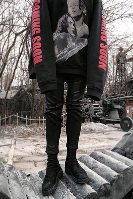 Штаб-квартира парижского бренда Vetements находится в криминальном районе Сен-Дени: туда боится заехать Анна Винтур, хотя, по слухам, и очень хочет. В шоу-руме играет техно и «Агата Кристи», а на рейлах развешаны цитаты из постсоветской реальности. Фартуки из клеенки арт-директор бренда Демна Гвасалия подсмотрел у своей сухумской бабушки, шарфы в стилистике русского рока — у свой правой руки, стилиста Лотты Волковой родом из Владивостока. Еще в коллекции есть вещи-постеры — например, с «Титаником». Унисекс-худи с Кейт и Лео, которые напоминают о топиках российских подростков в начале 2000-х, приехали в бутик DayNight (64 000 руб.).
