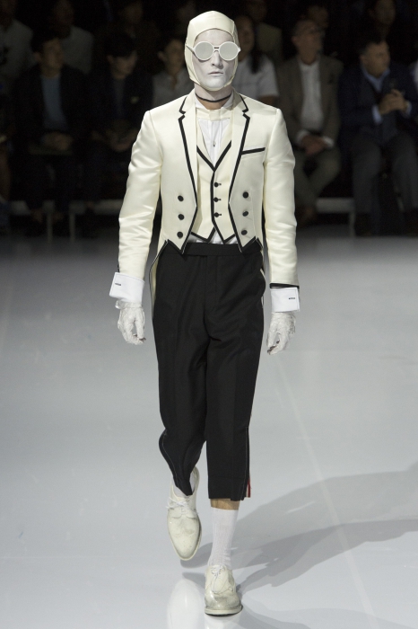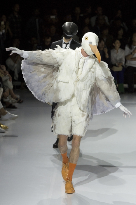 Несмотря на то, что в бутиках Thom Browne мы видим серые идеально скроенные костюмы и рубашки, шоу американского дизайнера на неделях моды — всегда перформанс. В этот раз модели демонстрировали весенне-летнюю коллекцию в масках птиц и акул.