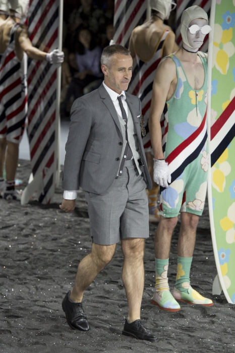 И это еще не все: вышедшие в серых костюмах модели в середине шоу расстегнули их, чтобы показать ярко-оранжевые шорты, салатовые пиджаки, красные лакированные тренчкоты и старомодные купальные костюмы в цветочный принт.