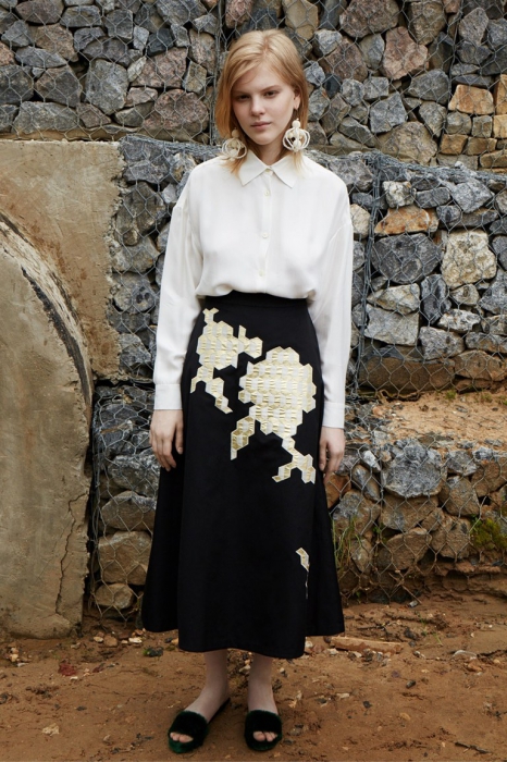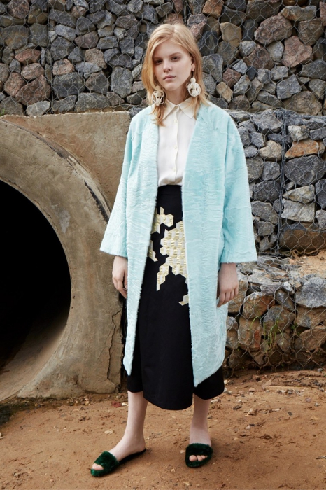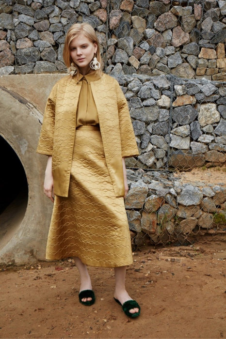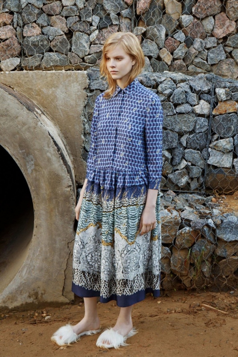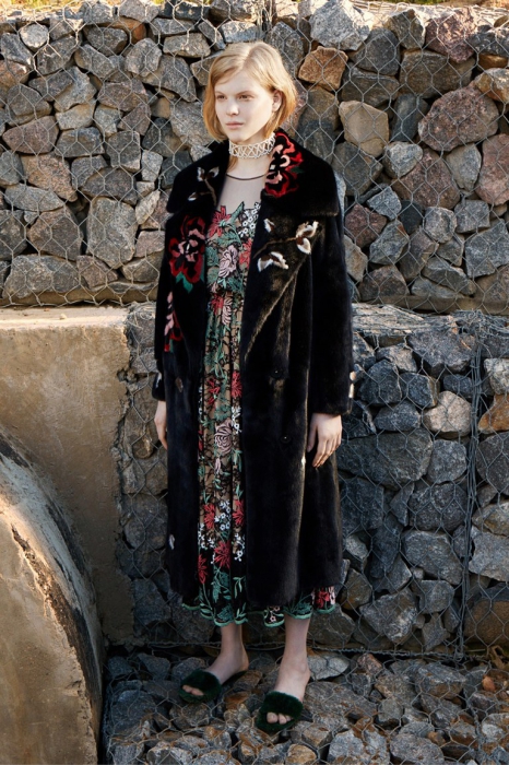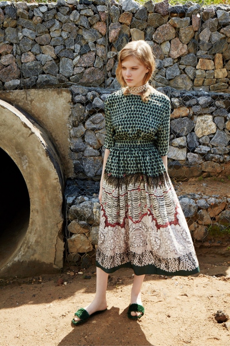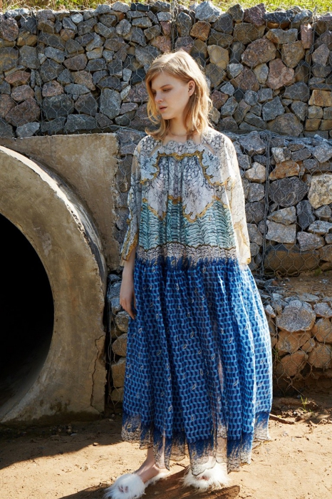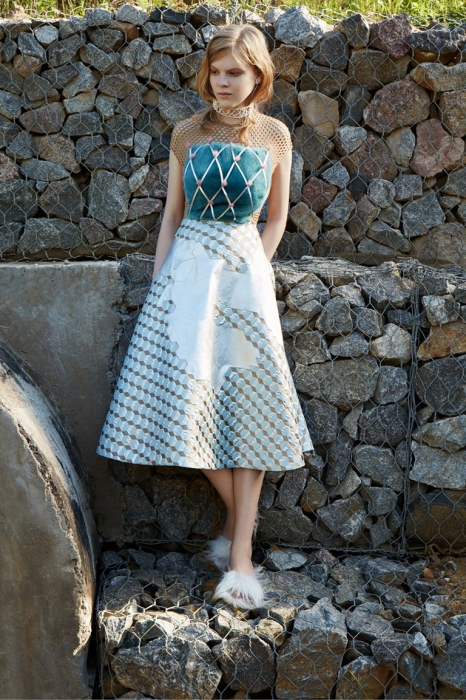 Дизайнер родом из Петербурга представила круизную коллекцию, в которой продолжает использовать русские коды. На этот раз в центре мудборда — сказка «Подземные царства» и картина «Три царевны подземного царства» Васнецова. Все это вылилось в искусную работу с разноцветным мехом, цветочные платья из шифона с вышивкой и вещи базового гардероба с аппликациями.