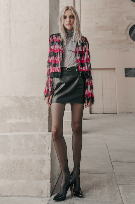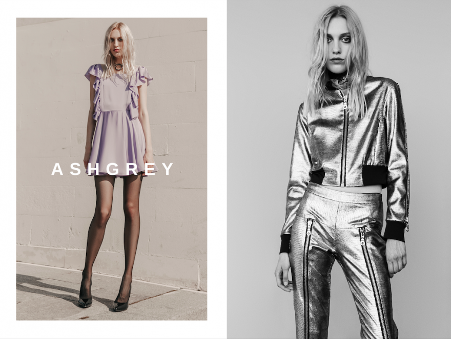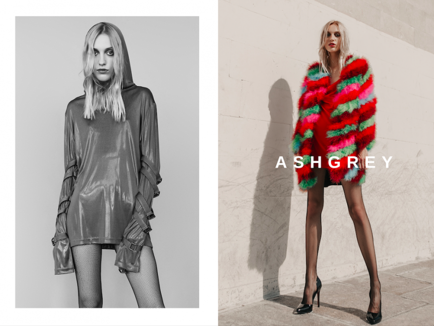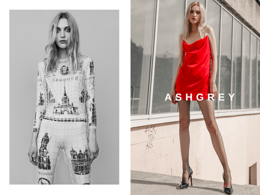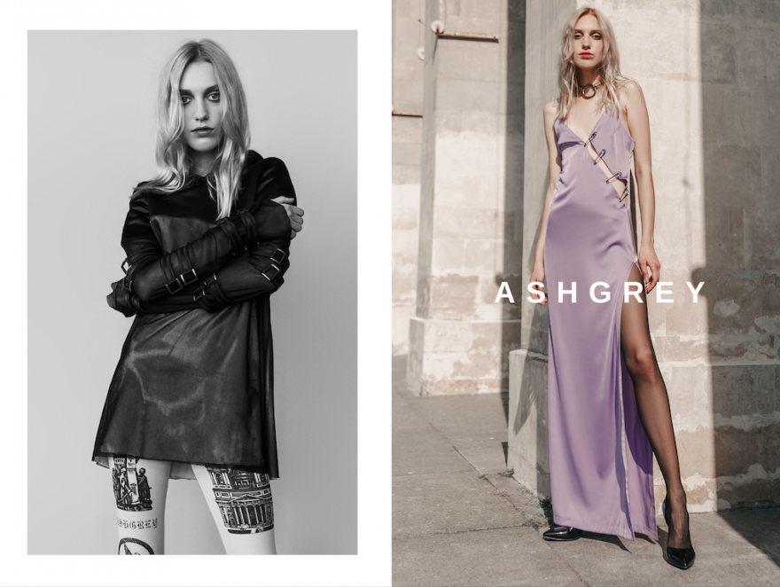 Бренд из Петербурга Ashgrey предствил осенне-зимнем коллекцию, которая готова импортозаместить Saint Laurent. В ней — платья с принтами из зажигалок или сигарет, футболки с булавками, атласные комбинации с цепями, мини-юбки из кожи и бархата, «зататуированные» телесные комплекты. В линейке с верхней одеждой есть жакеты с бахромой, метализированные бомберы и разноцветное пальто из перьев марабу.