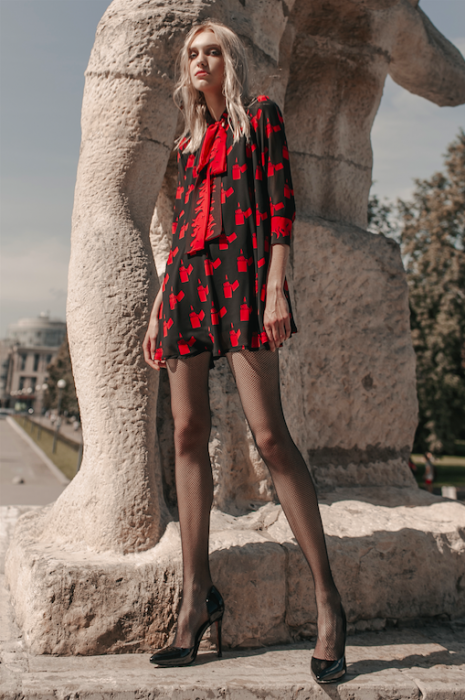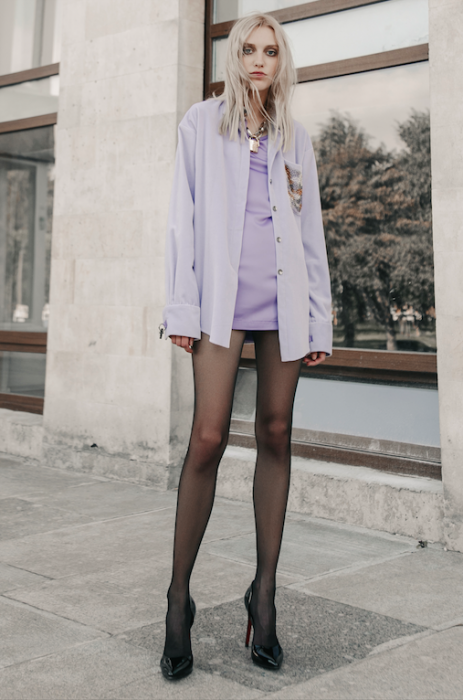 В мудборде нашей осенне-зимней коллекции — ленинградский рок-клуб и его посетители. По мини-платью, стилизованному под школьную форму, можно распознать старшеклассницу, по безразмерному кожаному свитшоту с булавками — подружку рокера. Есть еще завсегдатая клуба — она носит атласные платья на бретельках с цепями или клепками и телесные лосины с принтами-татуировками.