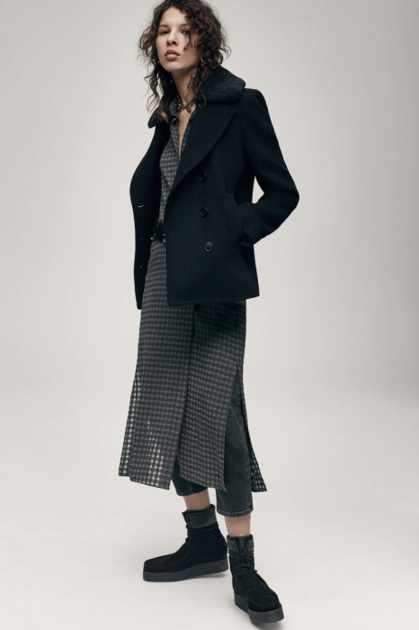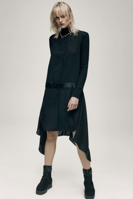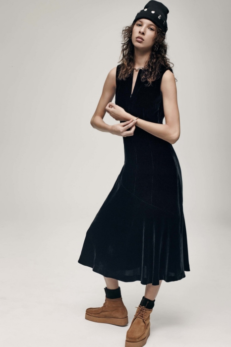 Вторая линия Александра Вэнга знаменита своими базовыми вещами и остродным стайлингом в лукбуках марки. В осенне-зимнем сезоне, например, дизайнер учит нас носить бархатные тотал-луки, шелковые комбинации поверх миди-юбок и платья с водолазками.