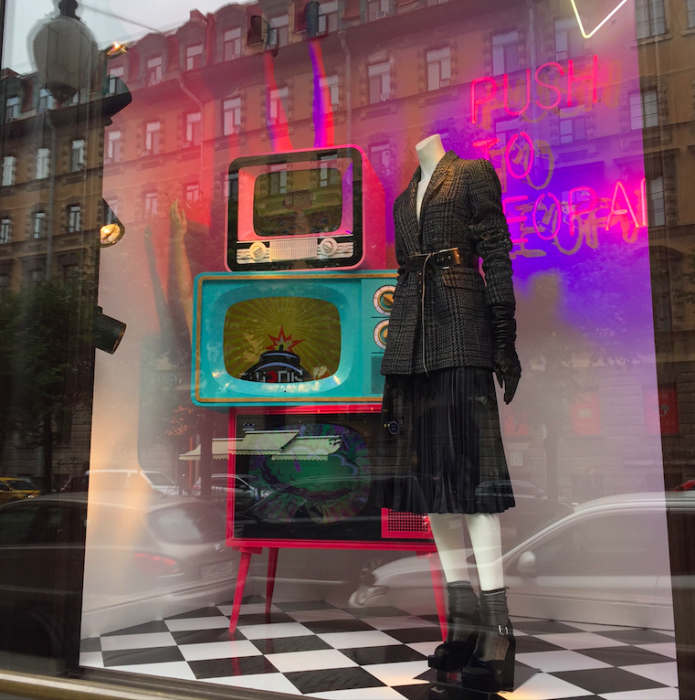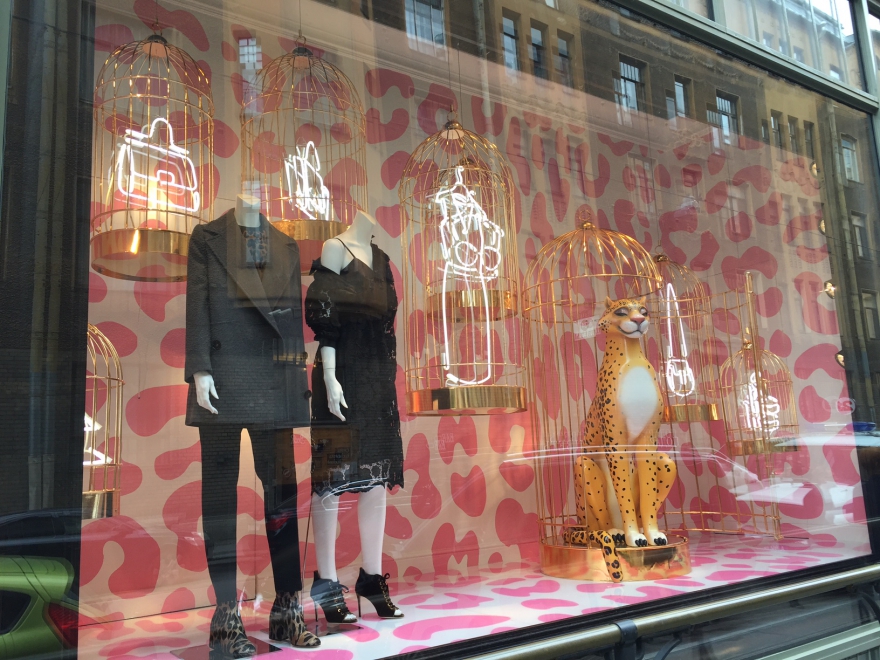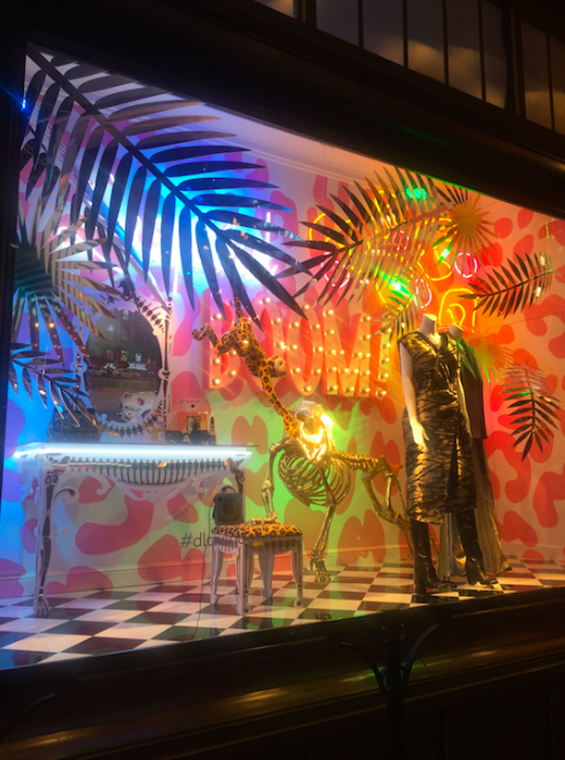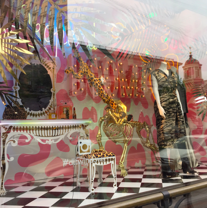 Новые витрины универмаг ДЛТ представил с наступлением сезона — 1 сентября. Окна по периметру красили в стилистике техно-джунглей: здесь есть ягуар в виде Мэрилин Монро, золотые леопарды, прыгающие обезьяны и, конечно, хиты из осенне-зимних коллекций — куртки с вышитым тигром Gucci, платья Stella McCartney и жакеты Dolce & Gabbana. Есть и интерактивная витрина: если встать перед ней, можно увидеть свое отражение в животном обличии.