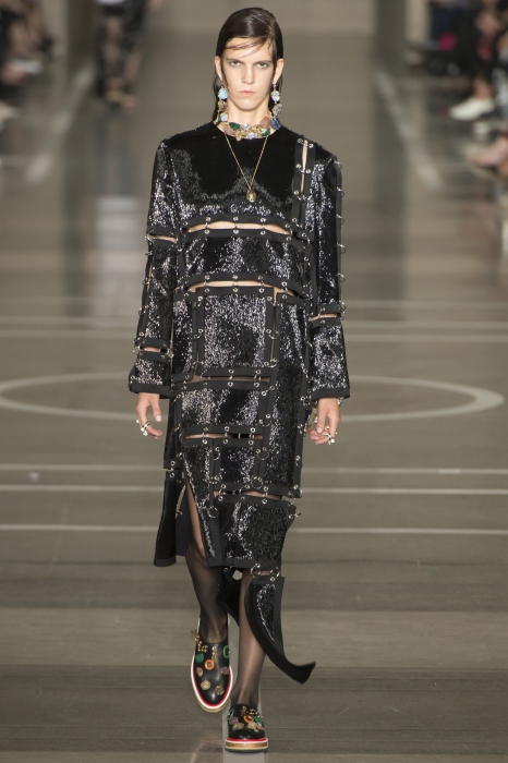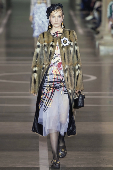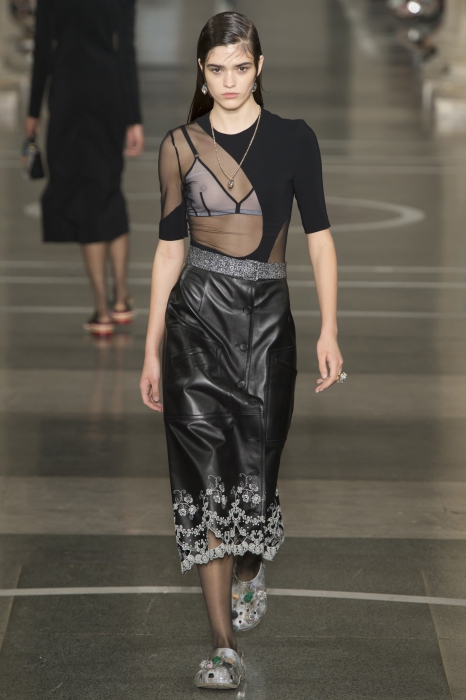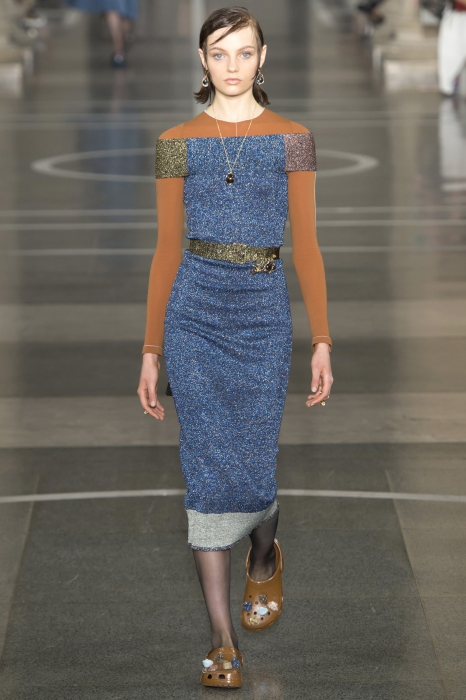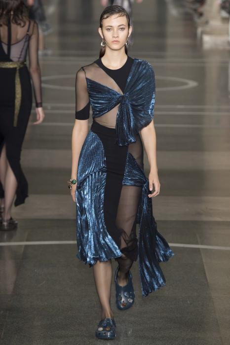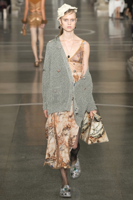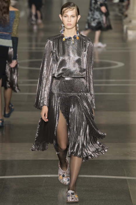 Самой обсуждаемой вещью коллекции стали «кроксы»: резиновые тапочки Кейн украсил разноцветными камнями и тем самым вернул тенденцию на ugly-pretty-обувь. Любимые тапочки медсестер и садоводов лондонских дизайнер сделал в коллаборации с американским брендом и, мы уверены, к весенне-летнему сезону они займут в трендбуке место обожаемых два года назад биркенштоков.