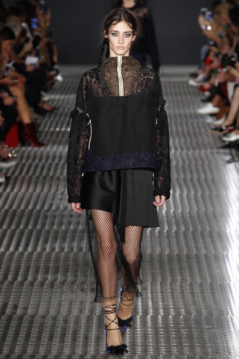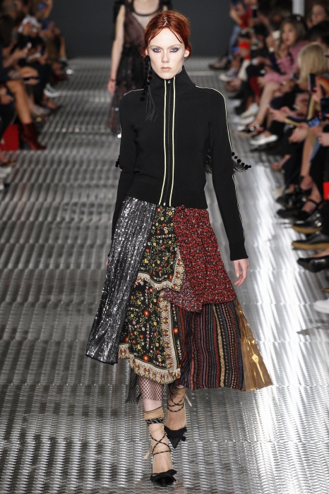 Дизайнер также эксплуатирует спортивную тему: кружевные блузы скроены на манер анораков, а олимпийка заправлена в пэчворк-юбку с блестками.